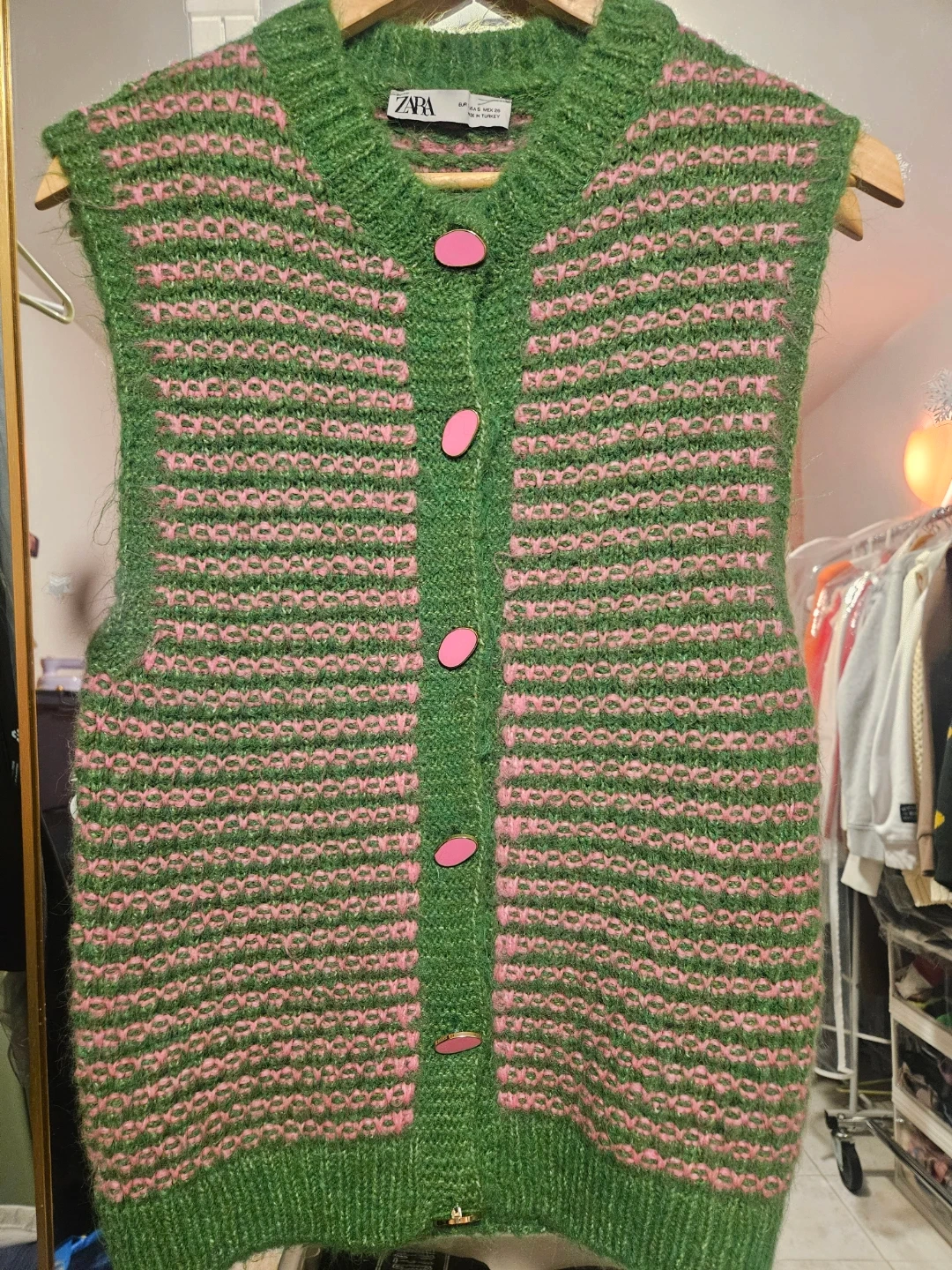 Selling a cute Zara knit vest in size small! It's green with pink stripes and has pink buttons. Perfect for layering!