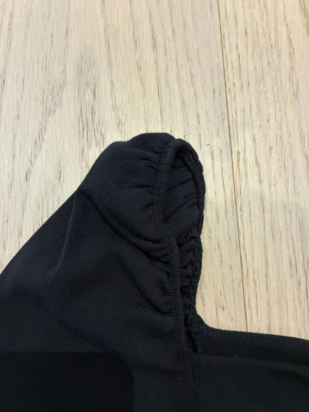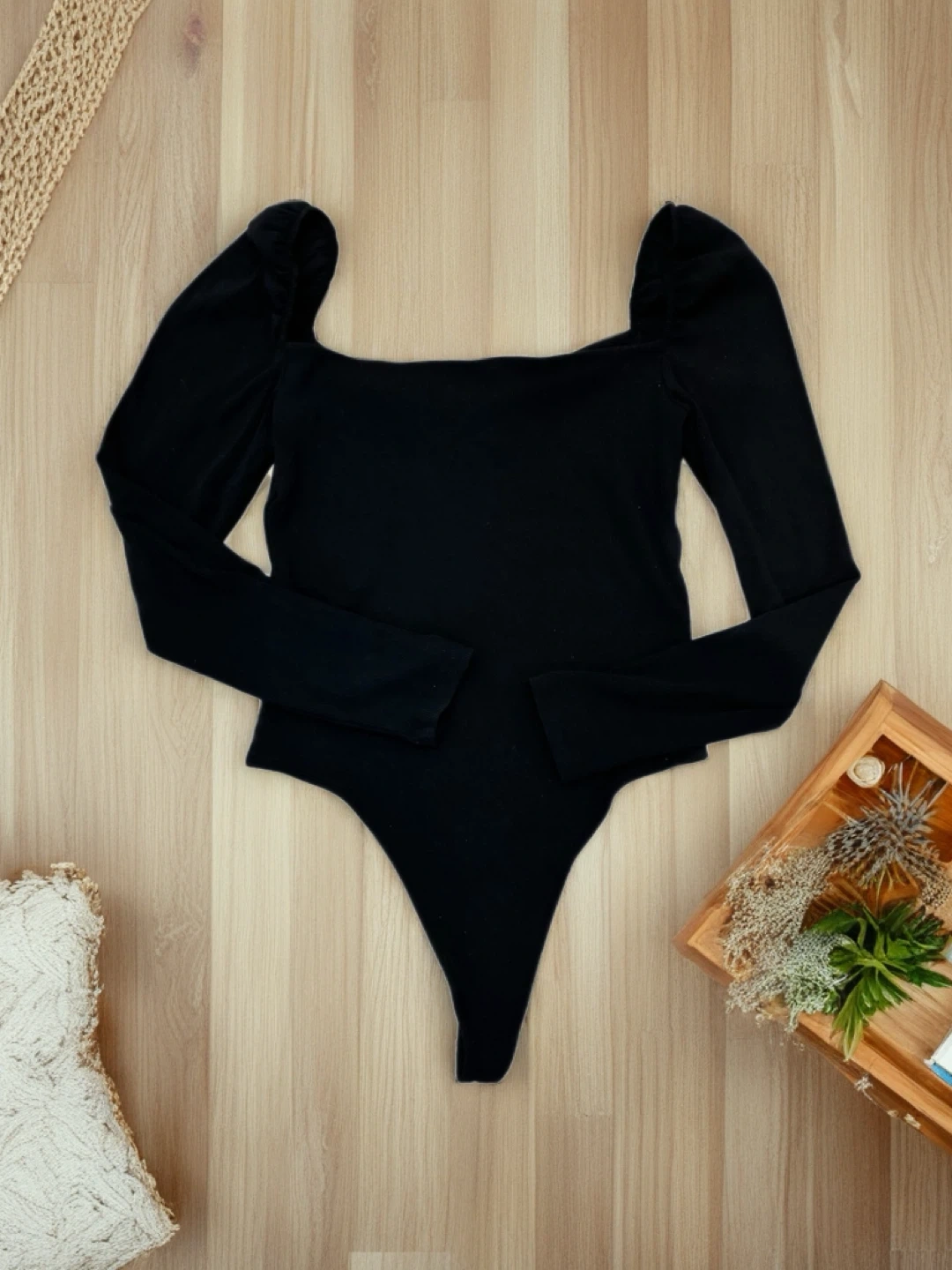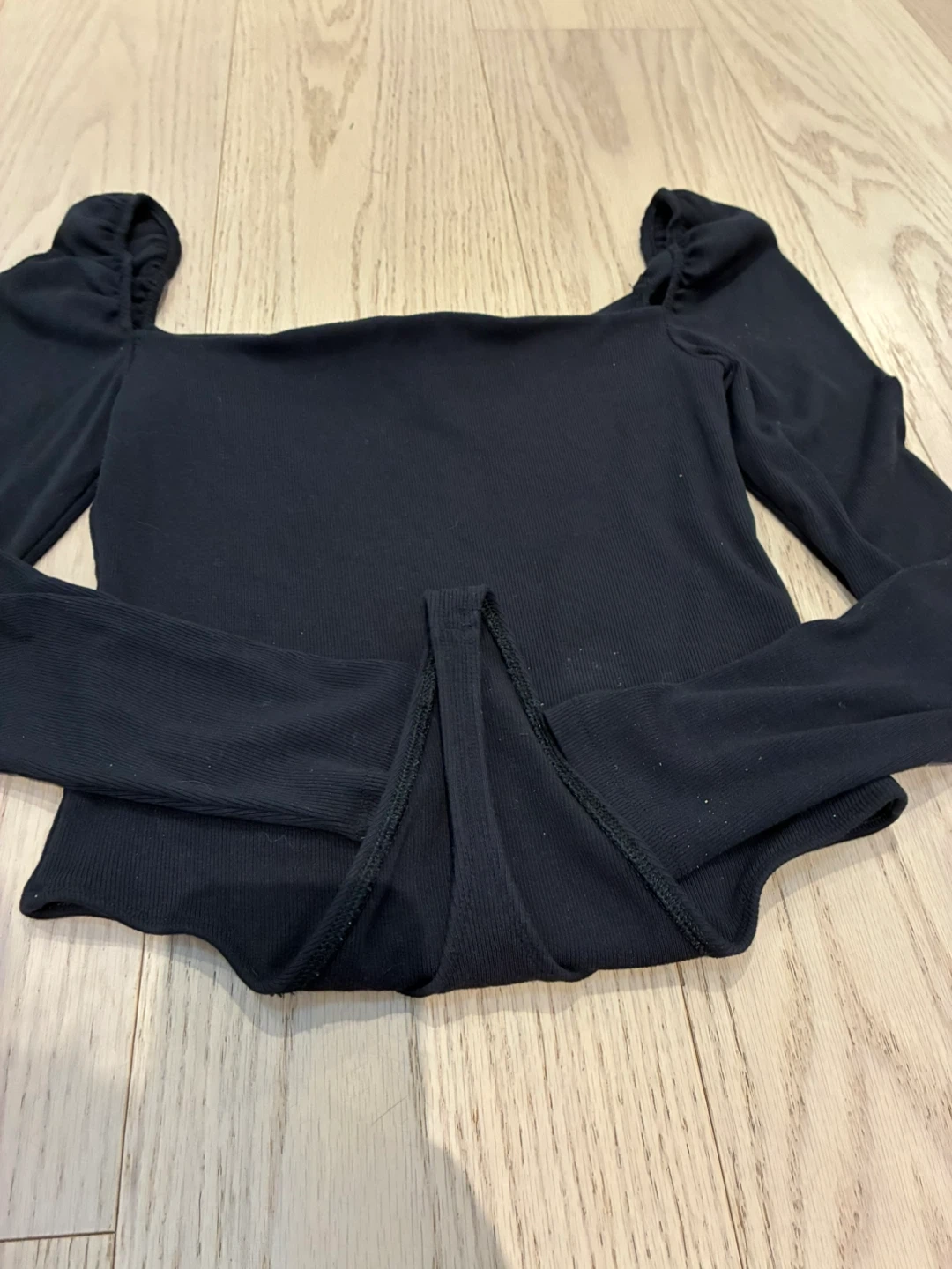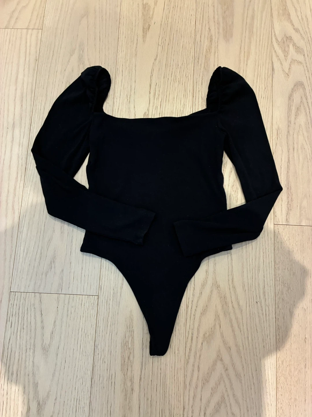 Aritzia black ribbed bodysuit. It features a square neckline and long sleeves. Perfect for layering or wearing on its own.