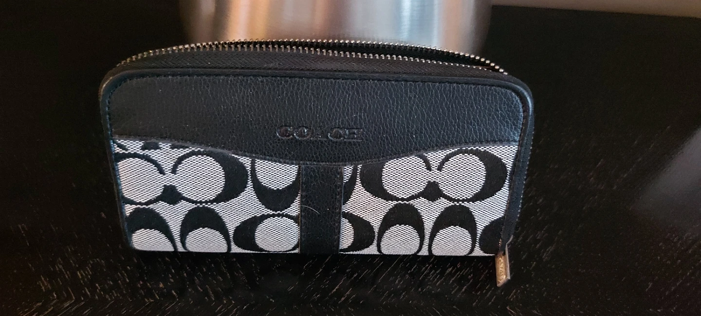 Here's a cute Coach wallet! It features the classic Coach logo pattern in black and white. It's in great shape and ready for a new owner