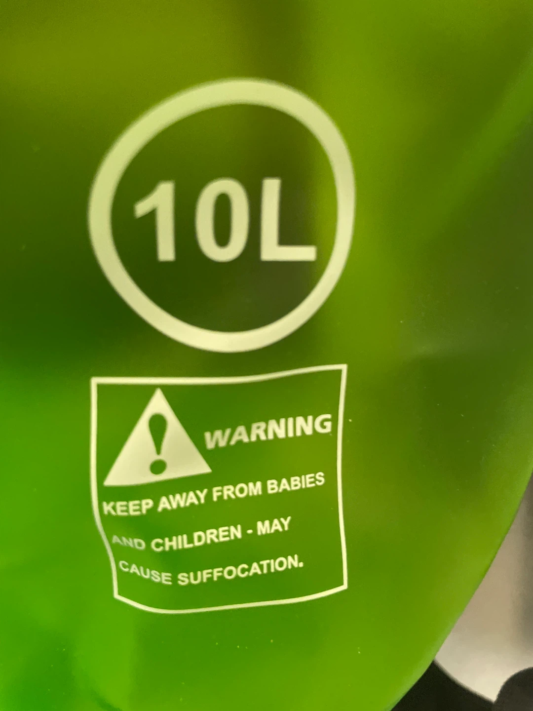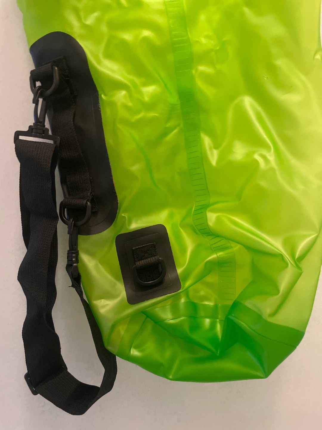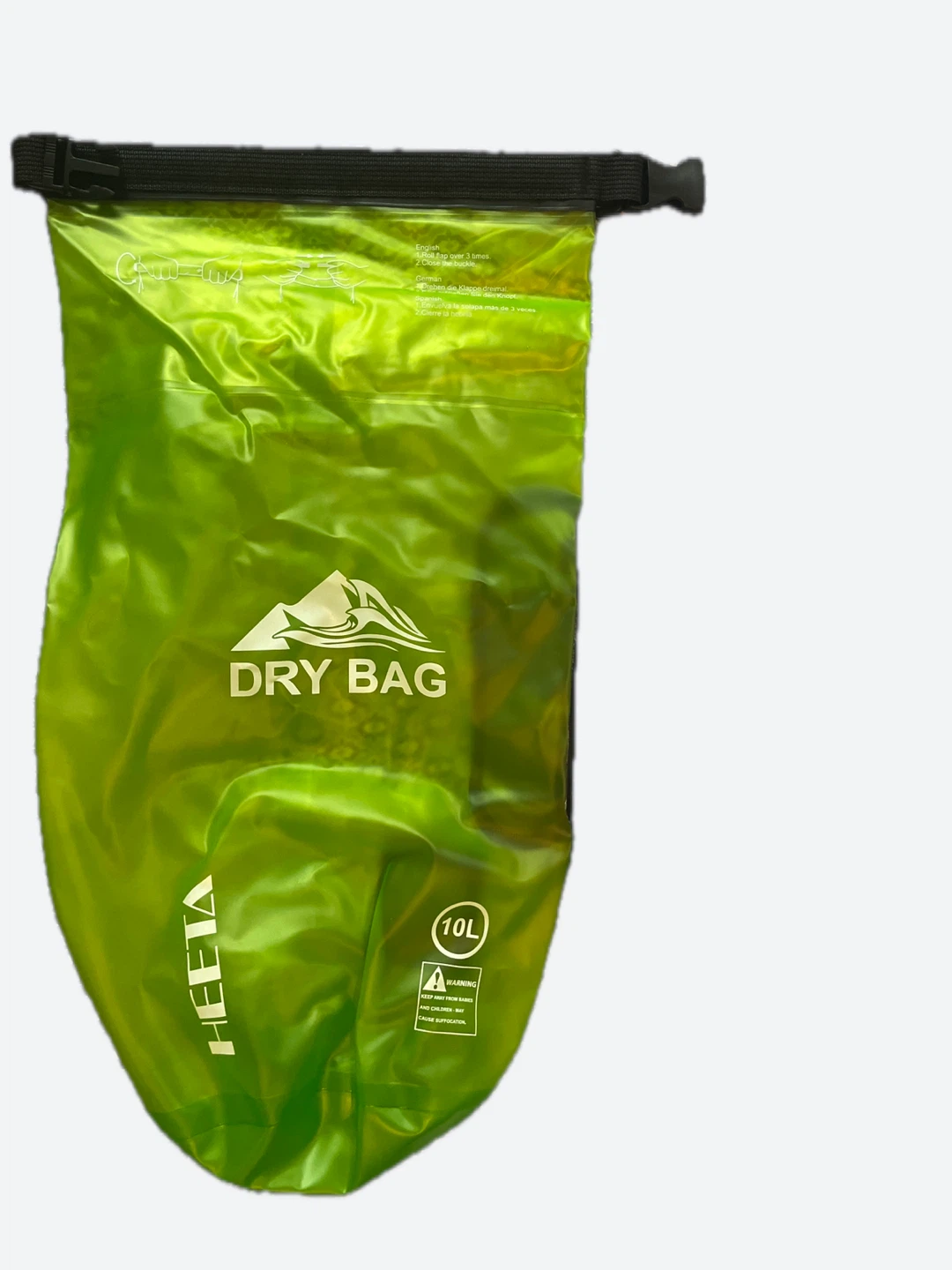 This is a HEETA 10L dry bag, perfect for keeping your belongings safe and dry! It's a vibrant green colour and comes with a handy shoulder strap. Keep away from babies and children, may cause suffocation