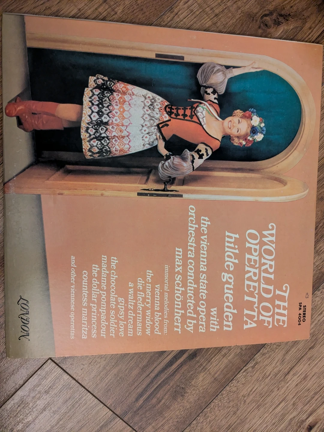Selling a vinyl record of "The World of Operetta" featuring Hilde Gueden with the Vienna State Opera orchestra conducted by Max Schönherr. It includes immortal melodies from Vienna Blood, The Merry Widow, Die Fledermaus, A Waltz Dream, Gipsy Love, The Chocolate Soldier, Madame Pompadour, The Dollar Princess, Countess Maritza, and other Viennese operettas. The record label is London and the stereo number is SPA 4004