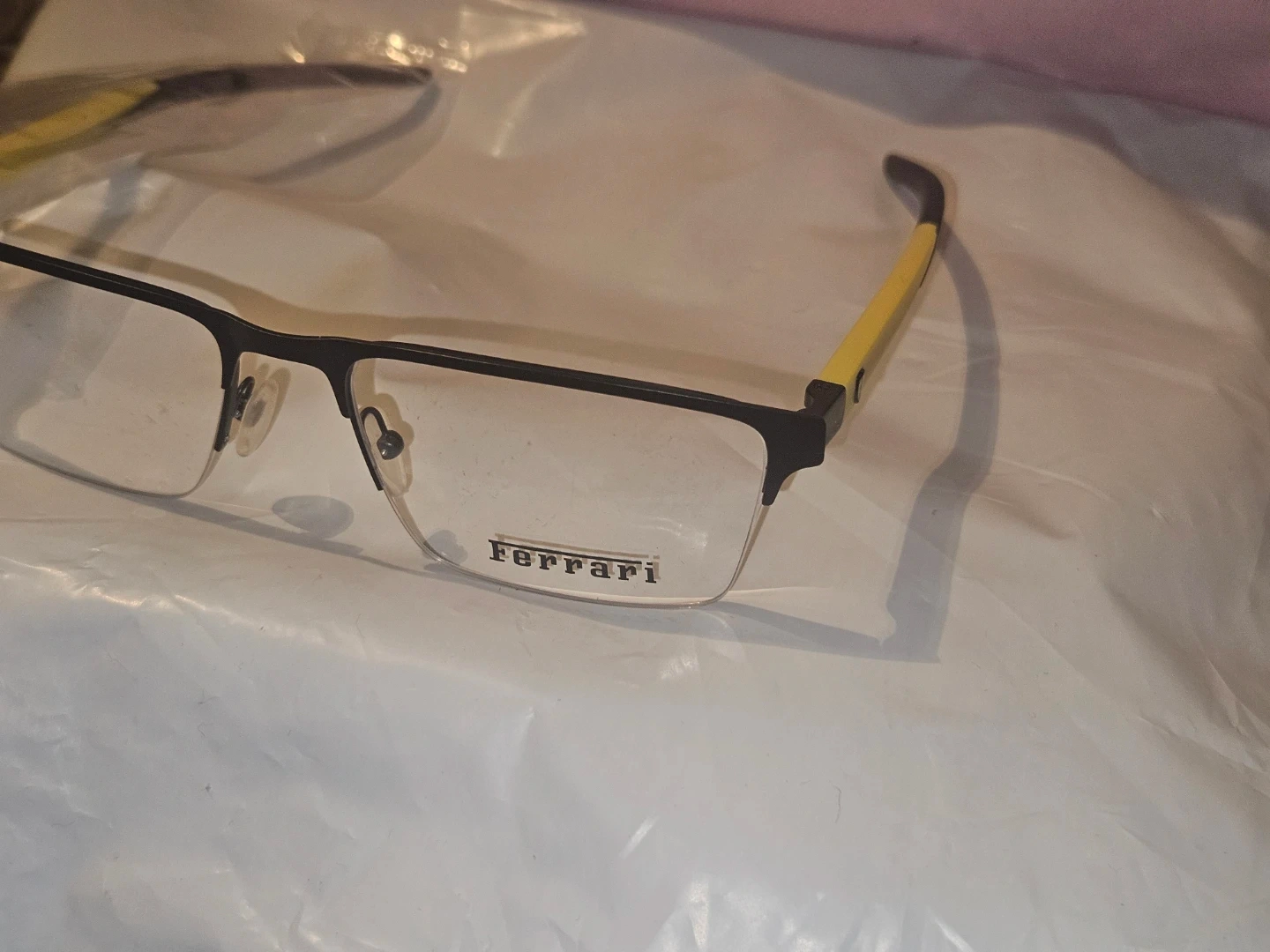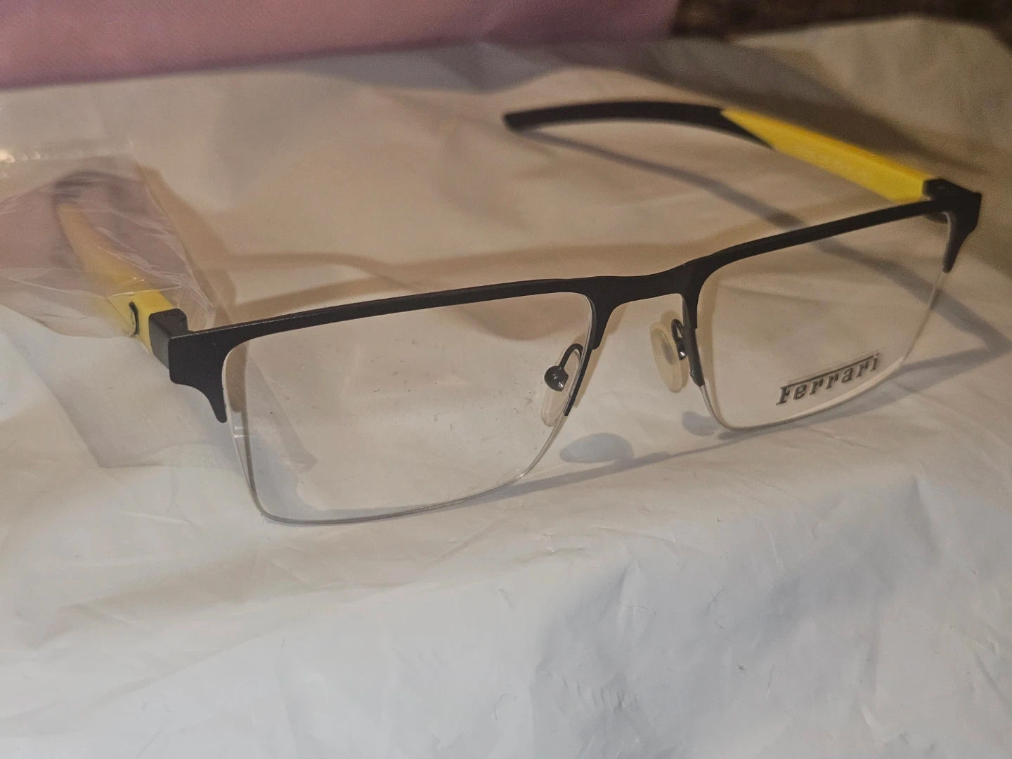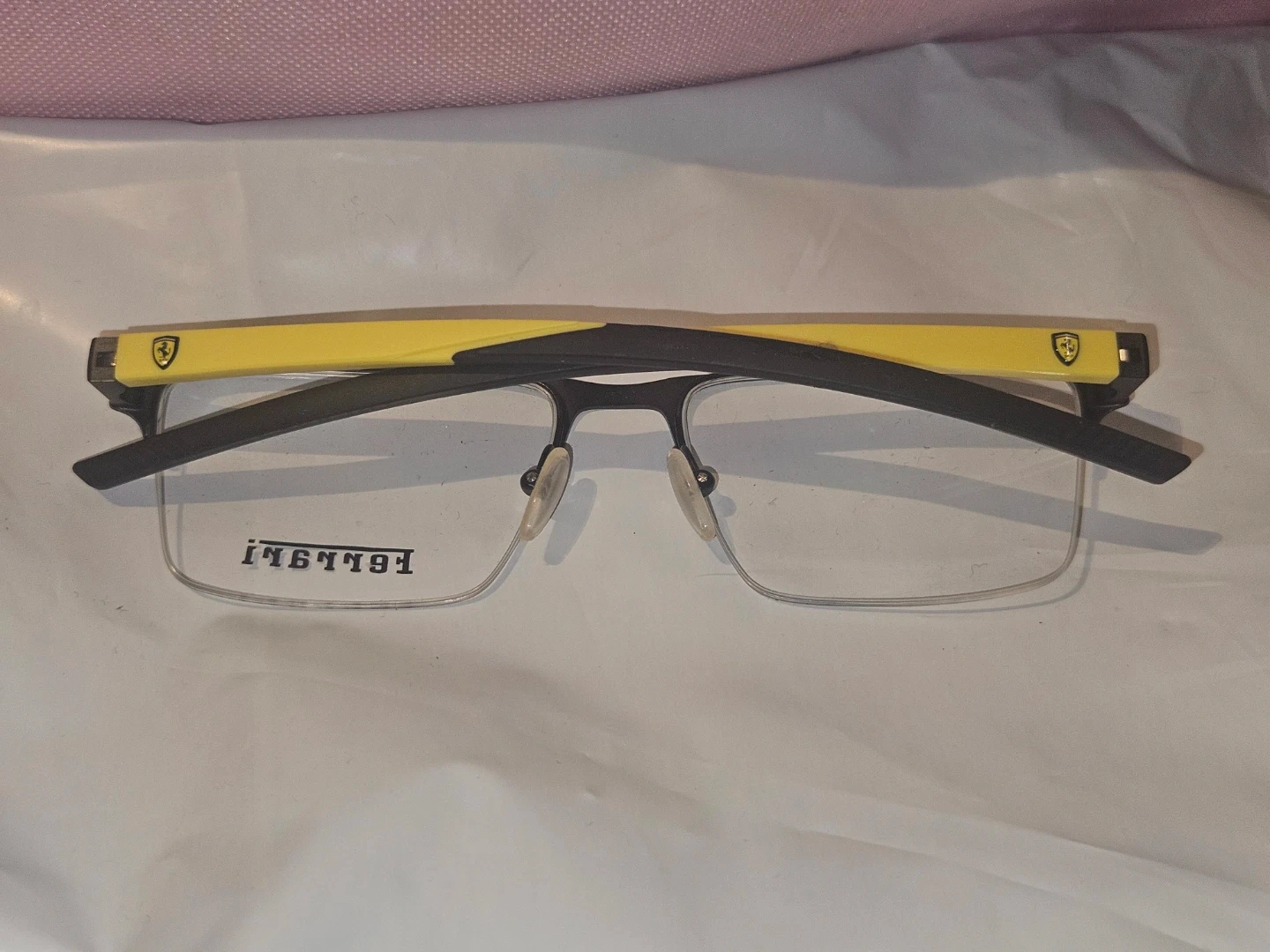 Selling a pair of Ferrari eyeglasses! They feature a sleek black frame with vibrant yellow accents silicon grip soft plastic the arms. The Ferrari logo is subtly displayed. Great for adding a touch of style to your everyday look, semi rim, suitable for all prescription.