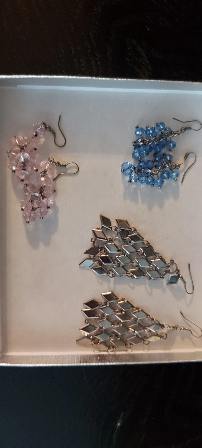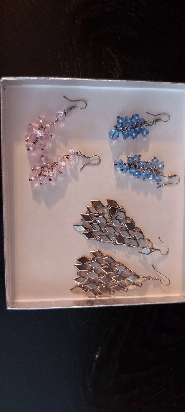 Selling a collection of earrings! There are three pairs included: one in light pink, one in blue, and one in silver. They are all in great condition and ready for a new owner!
