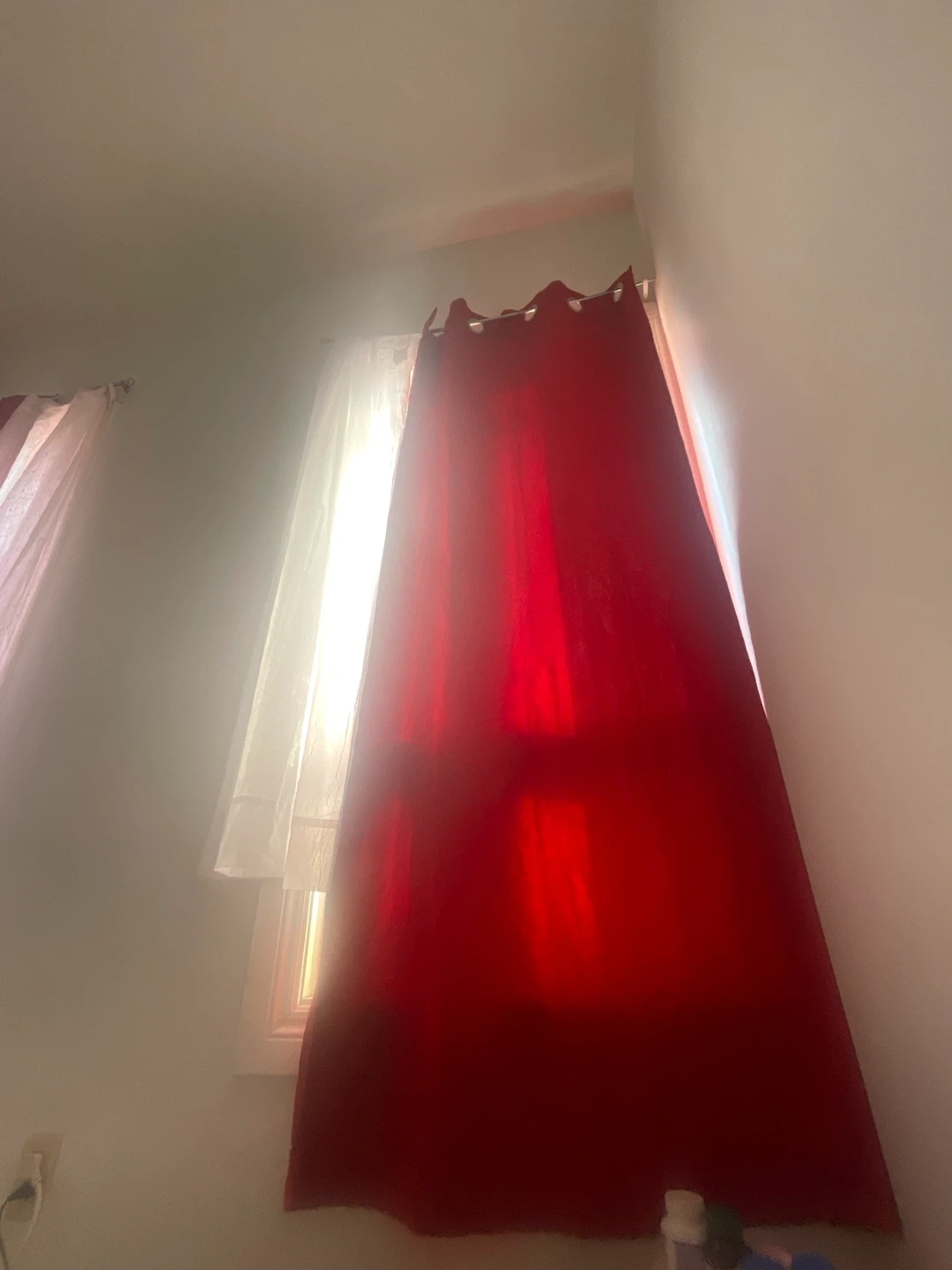 I have a set of 4 Mainstays curtain panels for sale! There are 2 red panels, 1 off-pink and 1 white panel. The red panels measures 40 inches x 84 inches, while the pink panel measures 51 inches x 63 inches and has curtain handles pierced into it. The pink one is about 15-20 inches shorter than the red ones (see pictures).