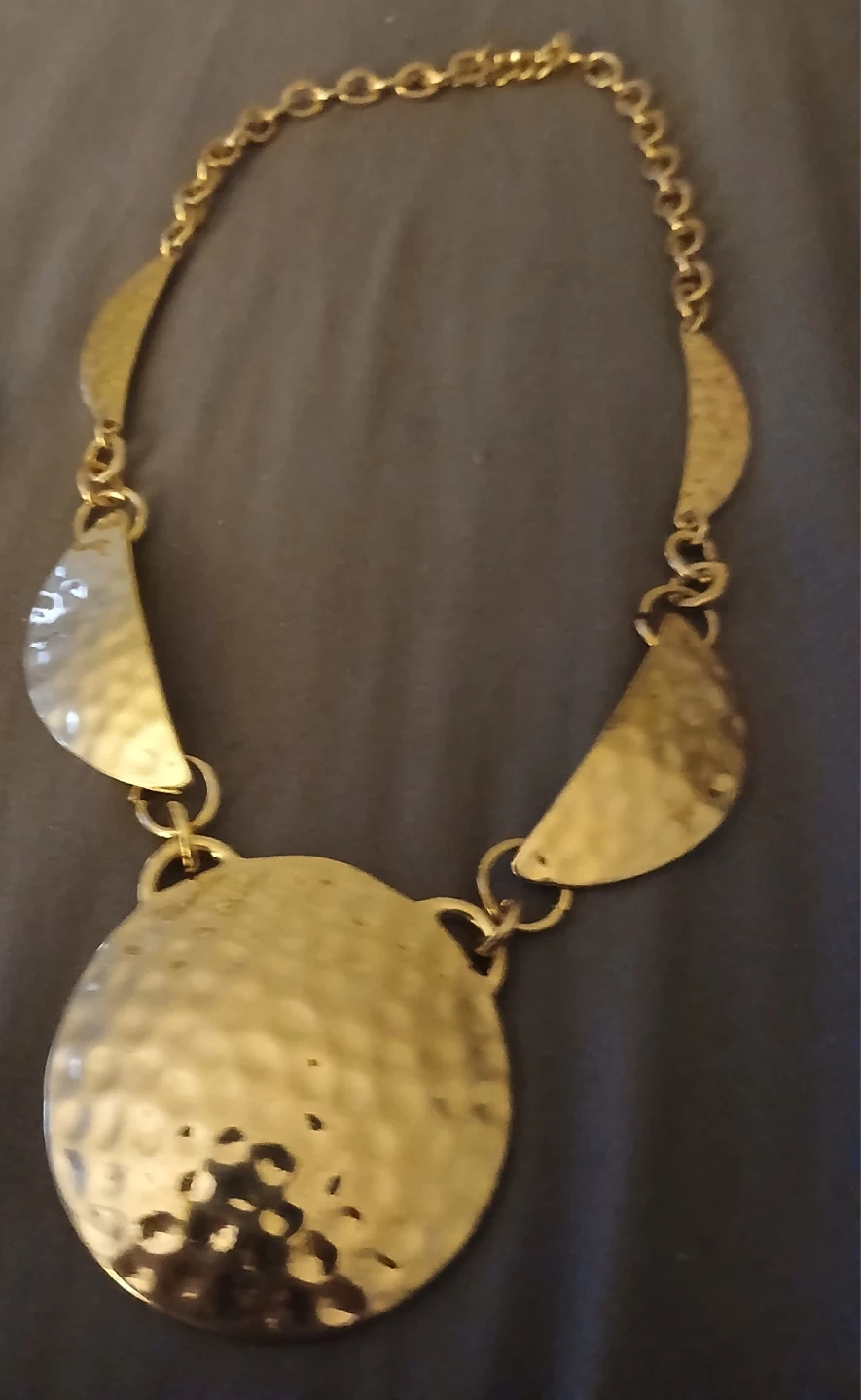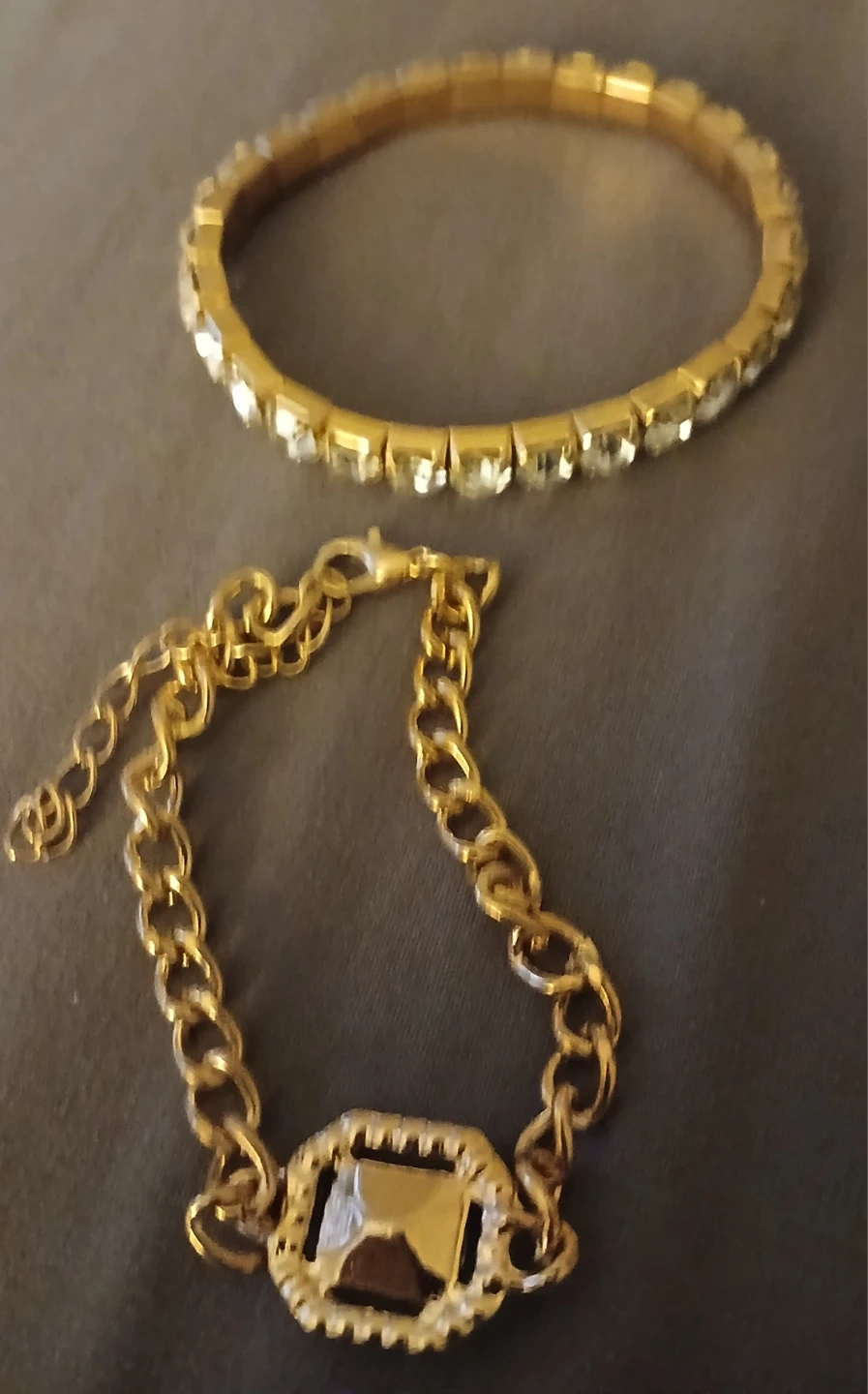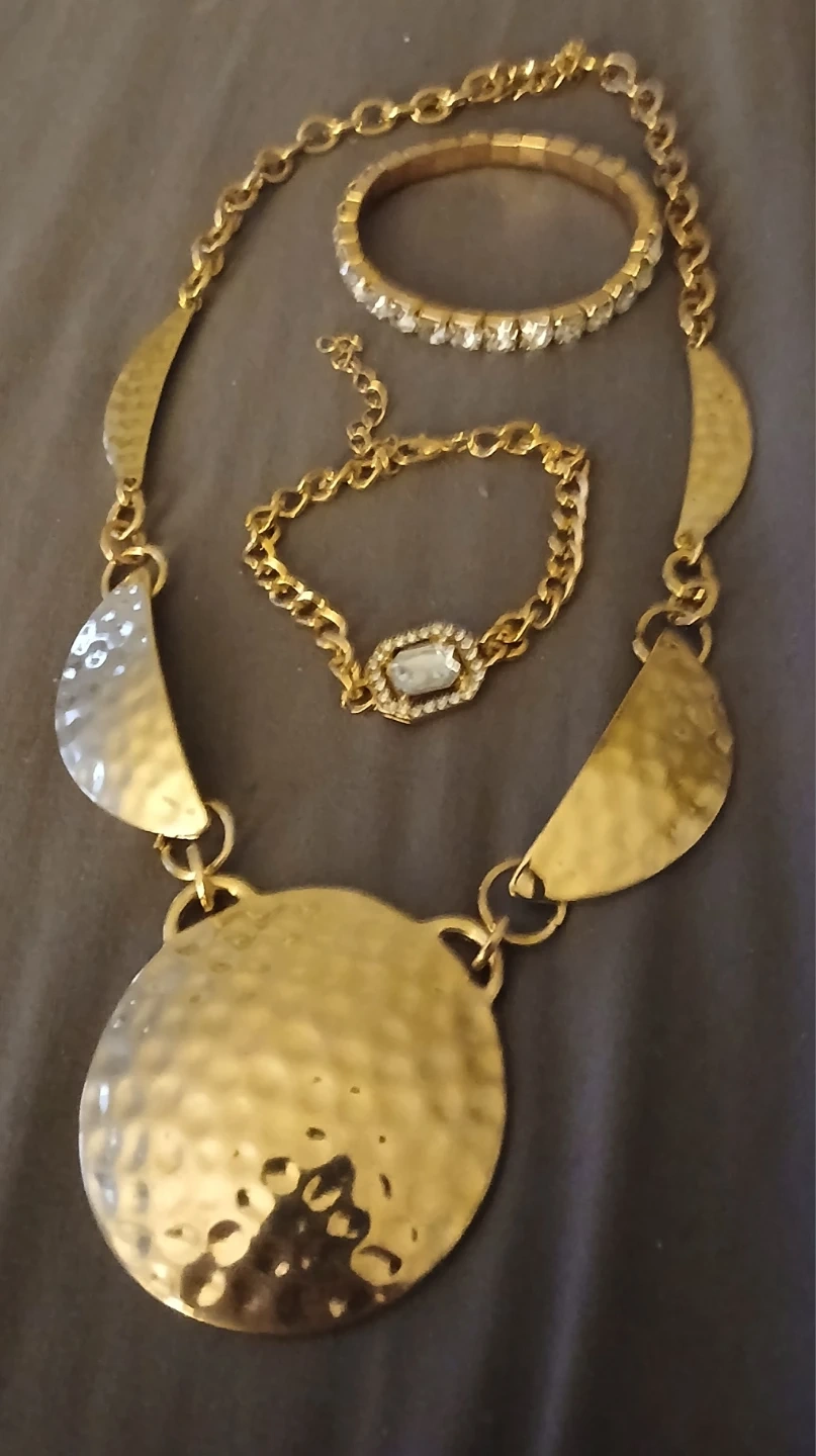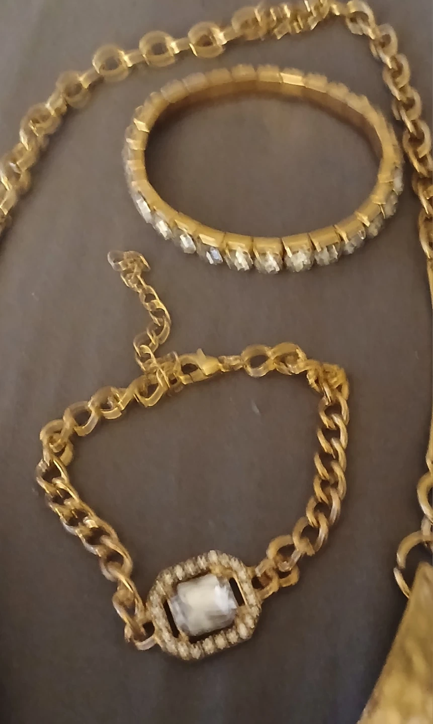 Selling a set of gold-tone jewellery. It includes a necklace and two bracelets. A great addition to any outfit!