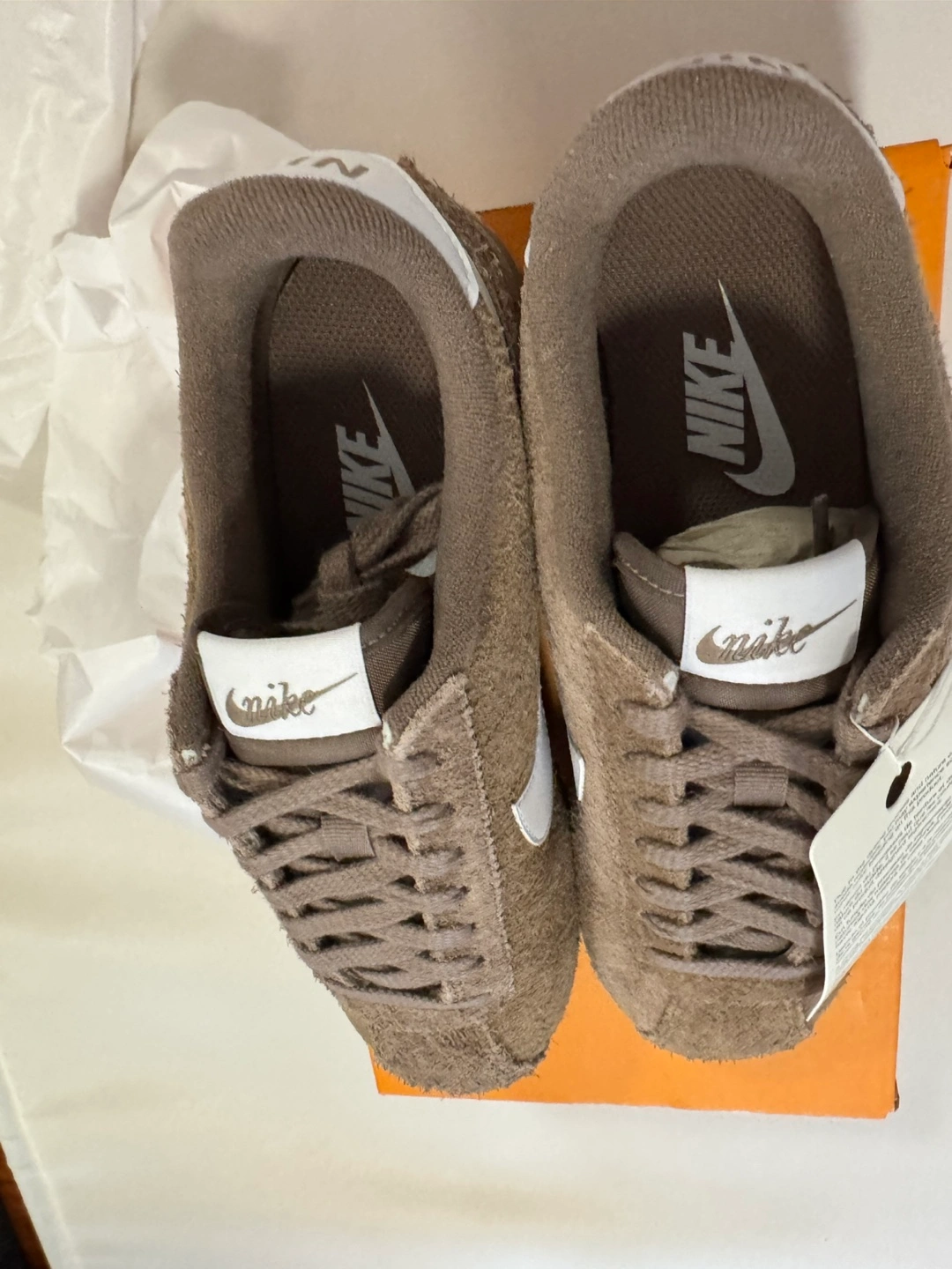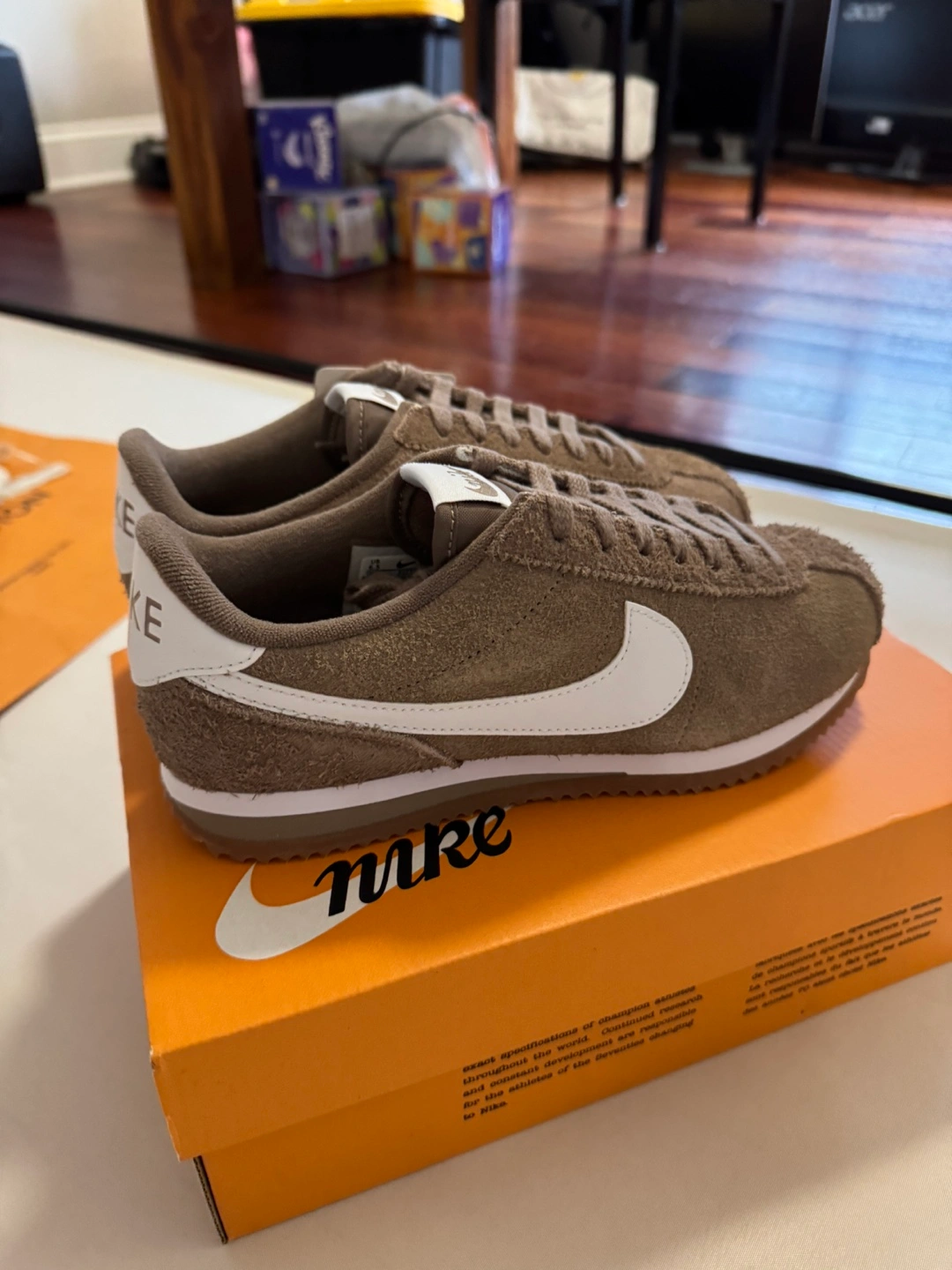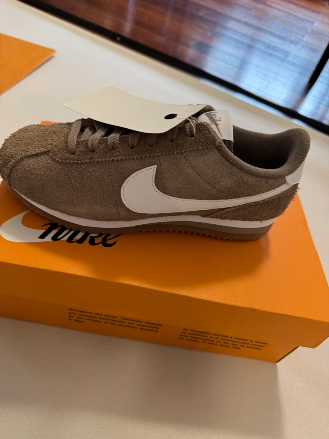 Selling a pair of Nike Cortez shoes in brown suede. They are in great condition and come with the original box. These shoes are stylish and comfortable, perfect for everyday wear!