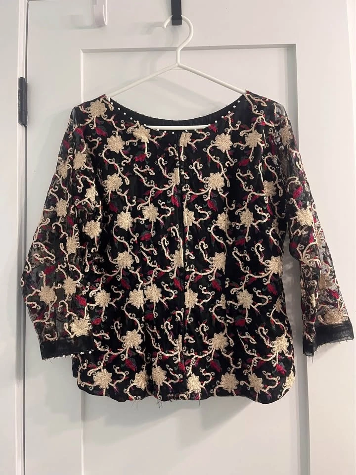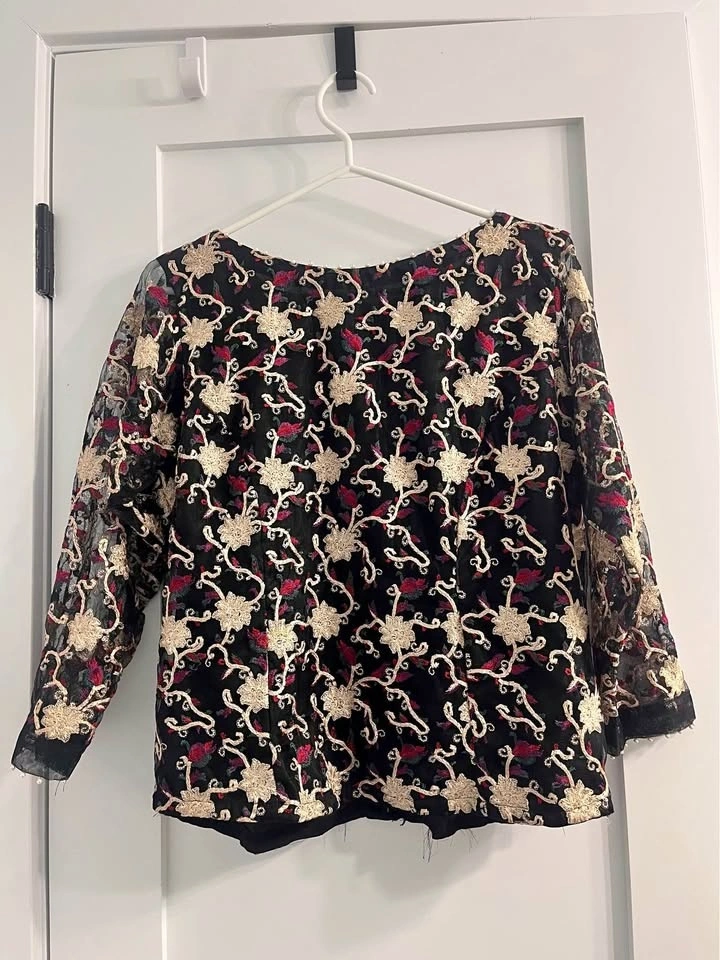 A black saree top with embroidery is a stunning and elegant piece of clothing. The black color provides a sleek and sophisticated backdrop for the intricate embroidery, which adds a touch of luxury and glamour.