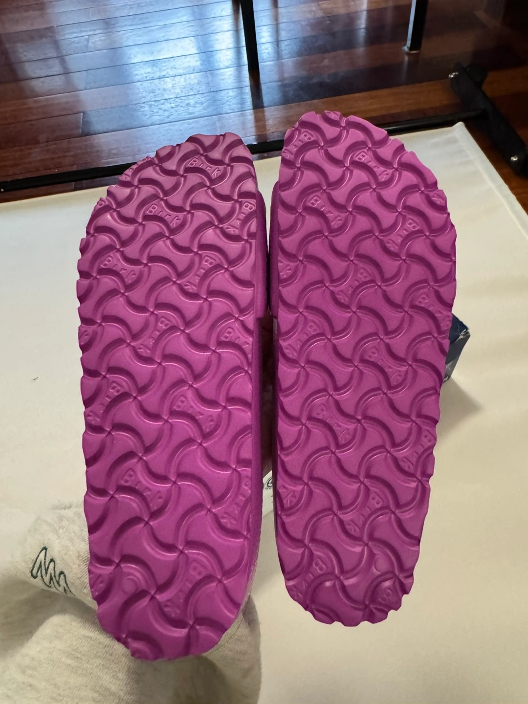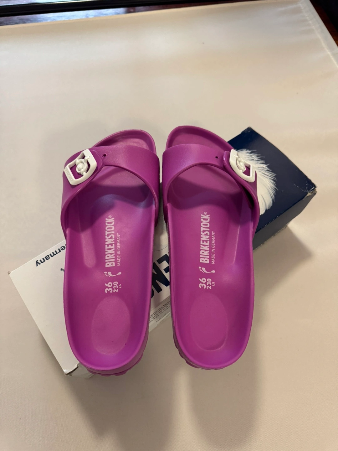 Selling a pair of Birkenstock Madrid EVA sandals in pink! They are a size 36. These have a narrow fit and are made of EVA material. Comes with the original box!