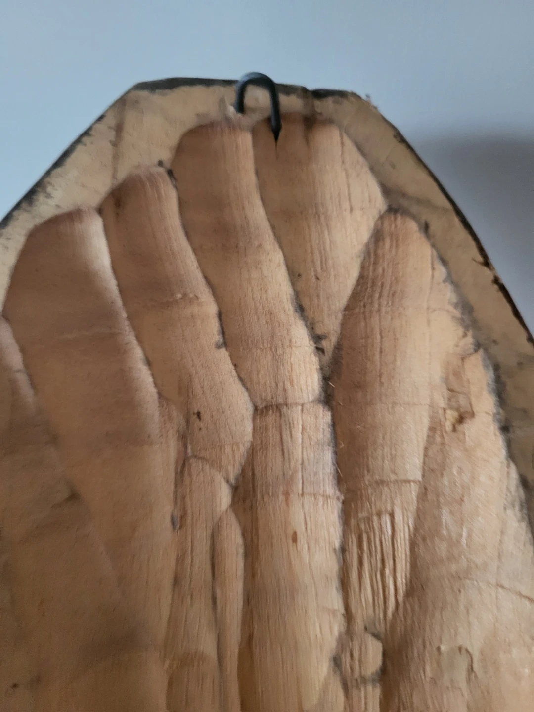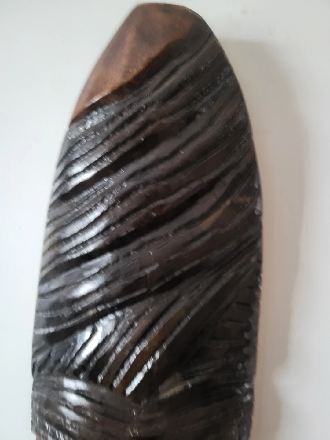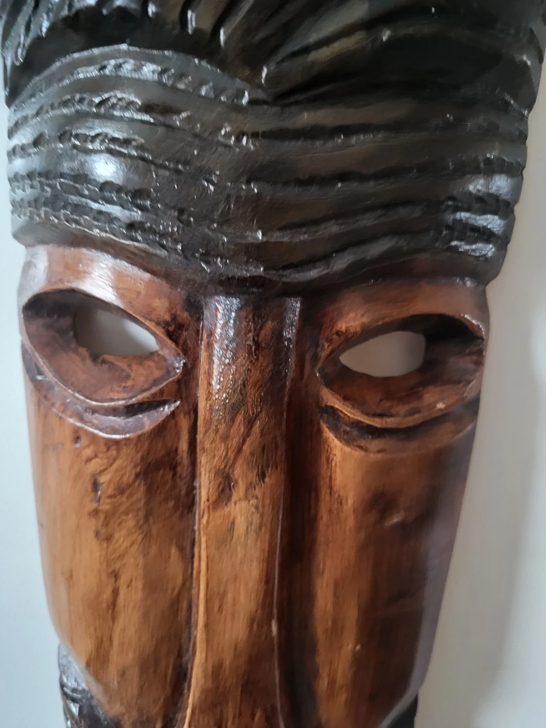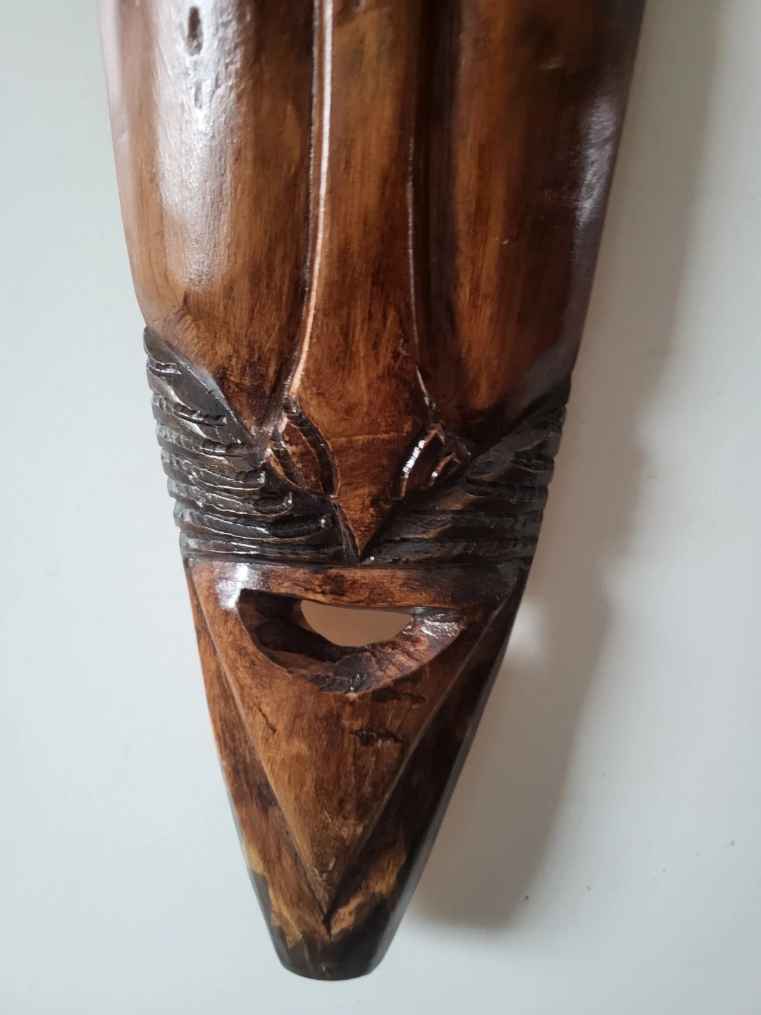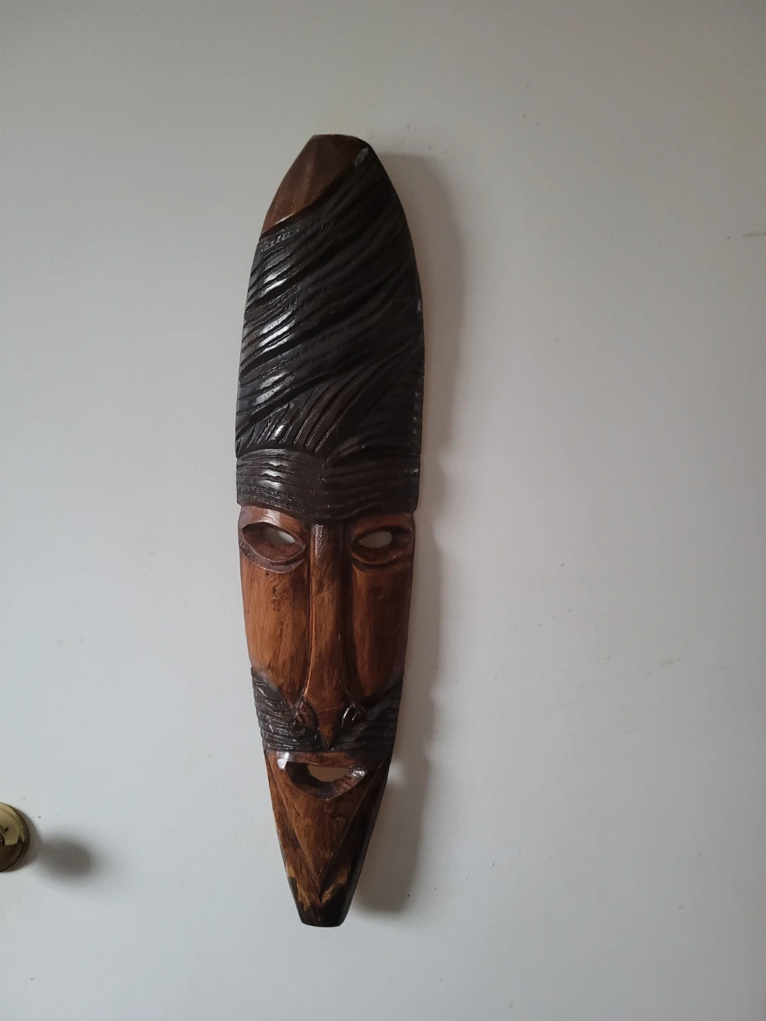Selling a unique wooden carved mask, perfect for adding a touch of character to your wall decor. It has a detailed design and is in good condition.