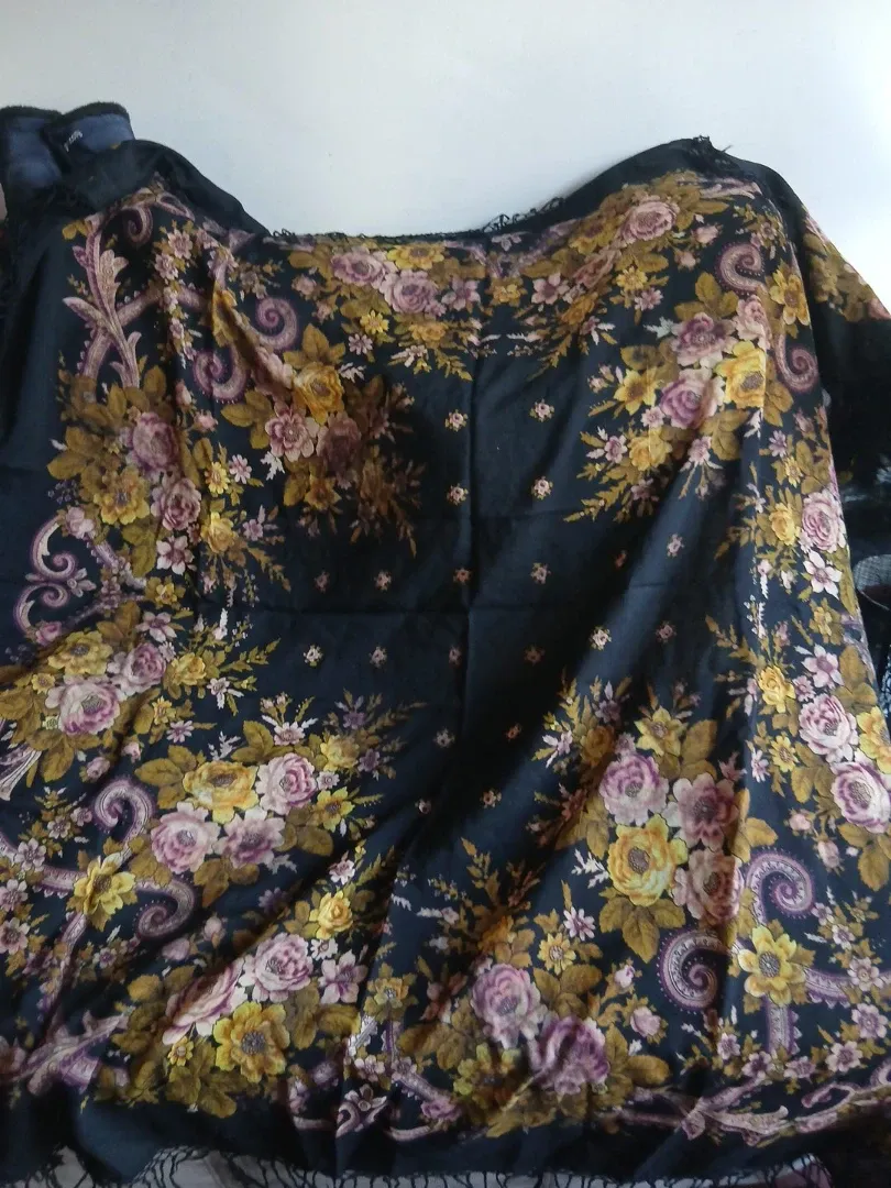 Imported Natural thin wool shawl with a beautiful floral pattern! It's in great condition and would be a perfect addition to your wardrobe for those cooler days or evenings Very large.