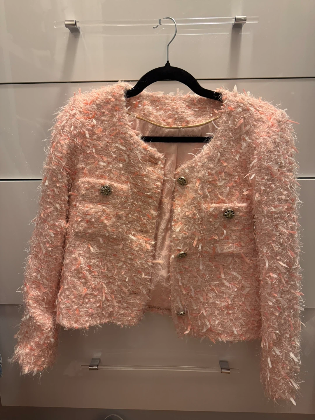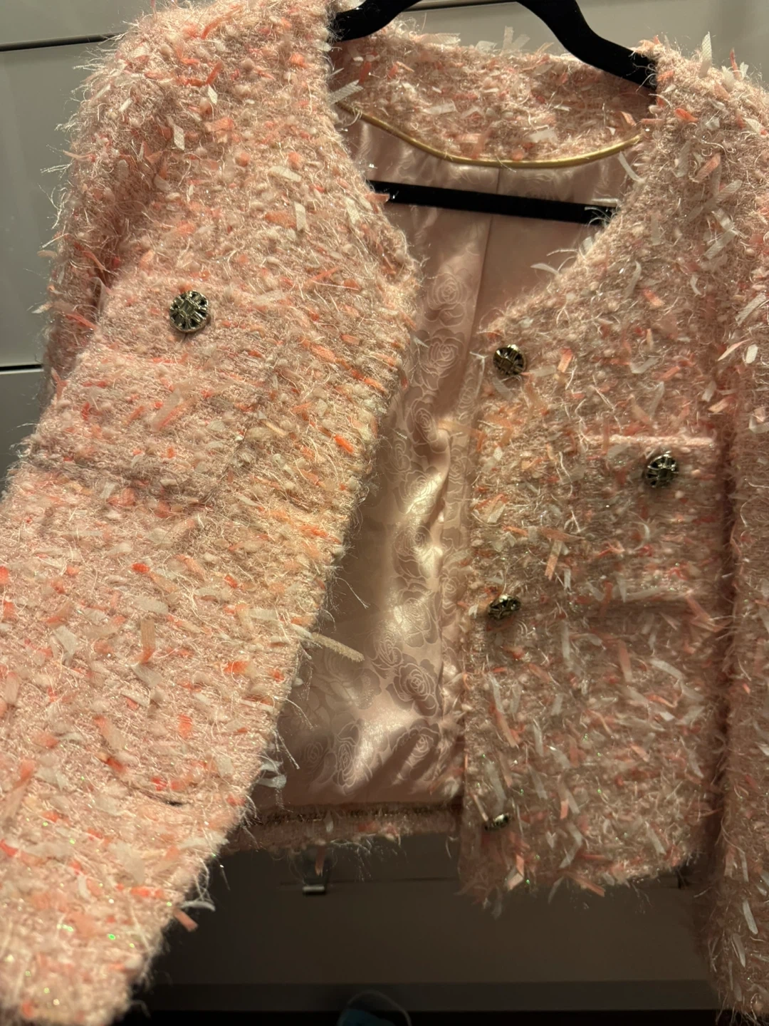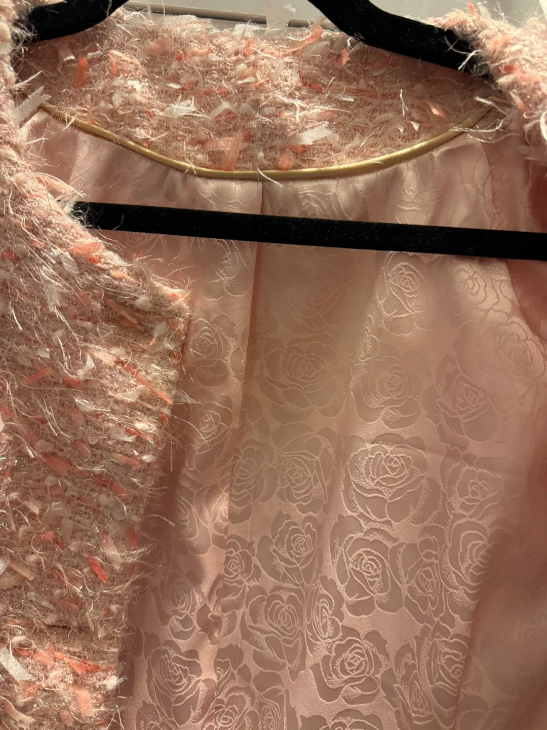 Selling a cute pink tweed jacket! It's completely new (never wore once). The jacket features a lovely lining with a rose pattern and decorative buttons.