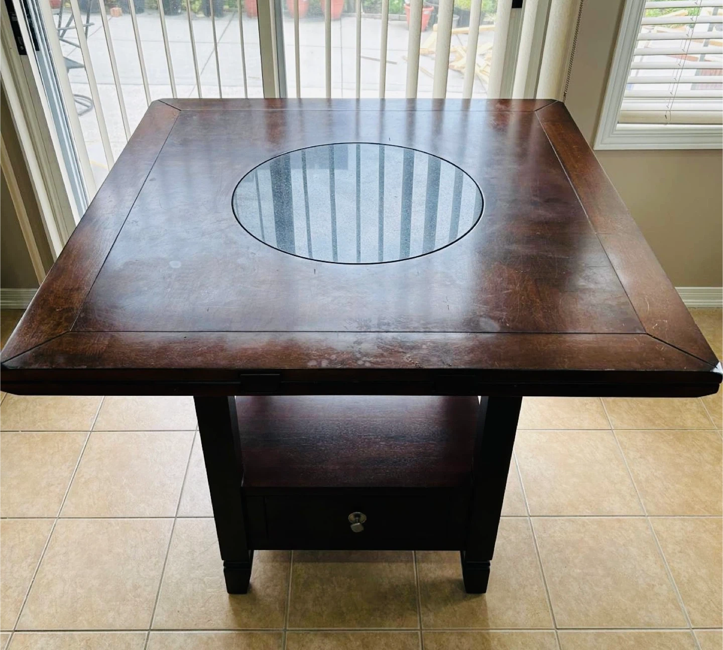 Selling a dark wood dining table with four matching chairs. The table has a unique design with a circular glass insert in the center. The chairs have upholstered seats and backs. It's a great set for a smaller dining area or kitchen!