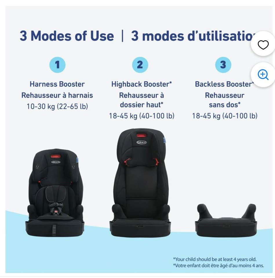 Grows with your child from forward-facing harness 10-30 kg (22-65 lb) to highback booster 18-45 kg (40-100 lb) to backless booster 18-45 kg (40-100 lb)