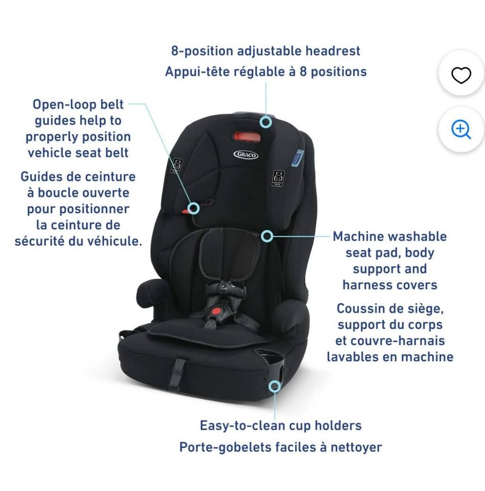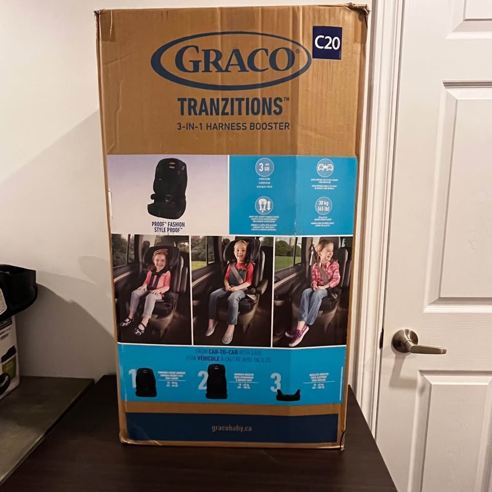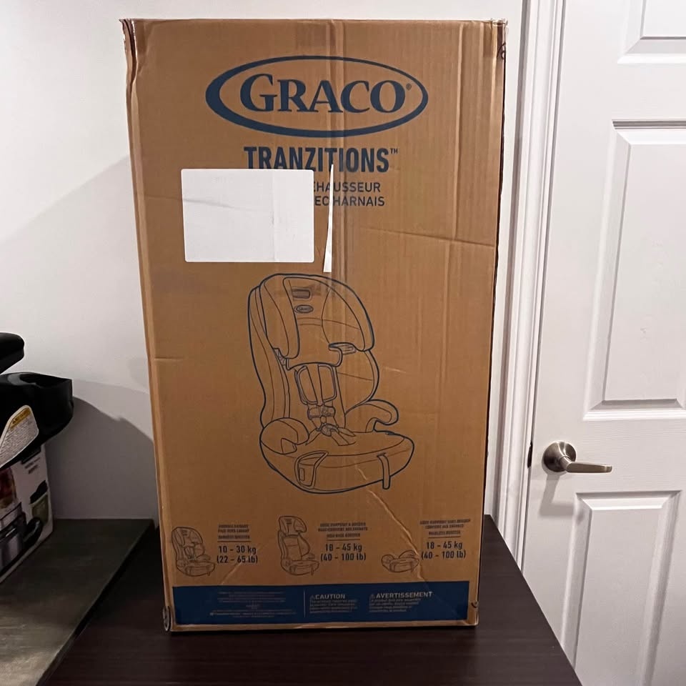 New open box Graco Tranzitions 3-in-1 Harness Booster Car Seat. Designed to grow with your child and go with you. This lightweight car seat transitions seamlessly from harness booster 10-30 kg (22-65 lb) to highback booster 18-45 kg (40-100 lb) to backless booster 18-45 kg (40-100 lb) and features the Simply Safe Adjust Harness System, which adjusts your harness and headrest to 8 height positions, with no rethreading. It features two removable cup holders, and a machine washable seat pad, body insert, and harness covers.