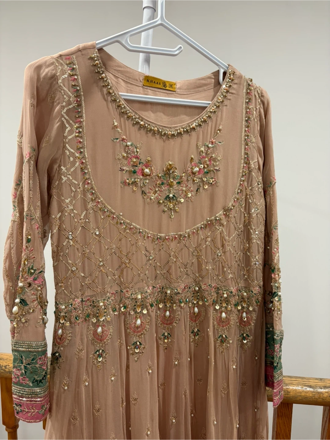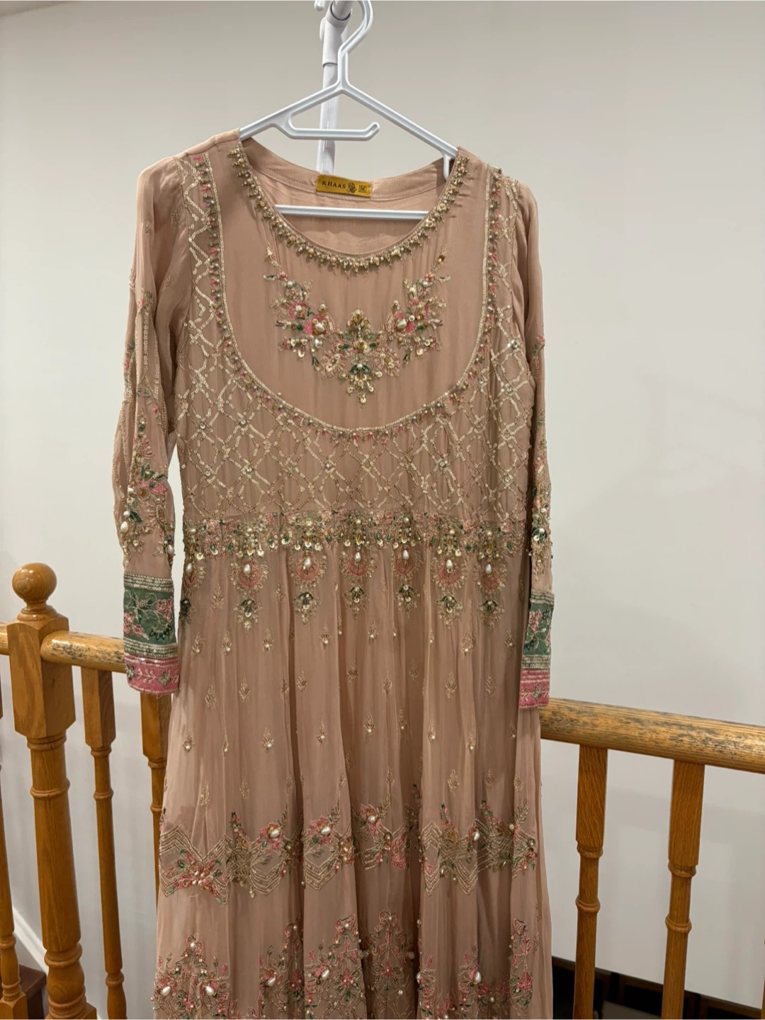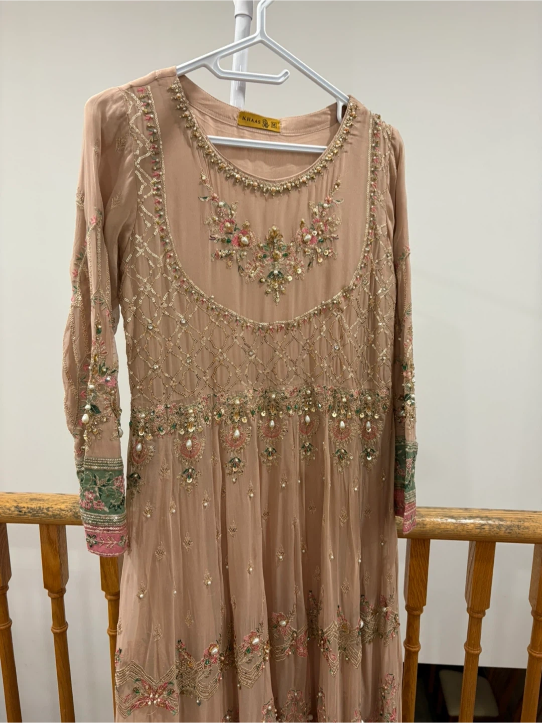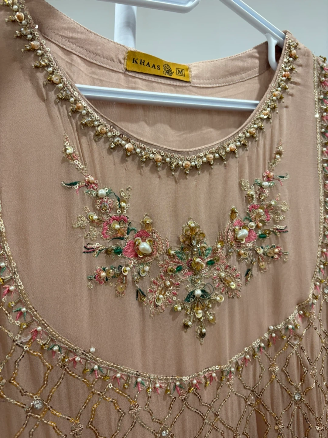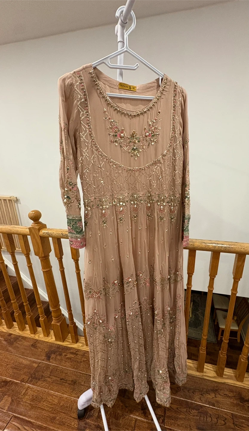 Beautiful Khaas formal dress in a lovely neutral tone. The dress features intricate beadwork and embroidery. Comes in 3 pieces and only worn once. Large size