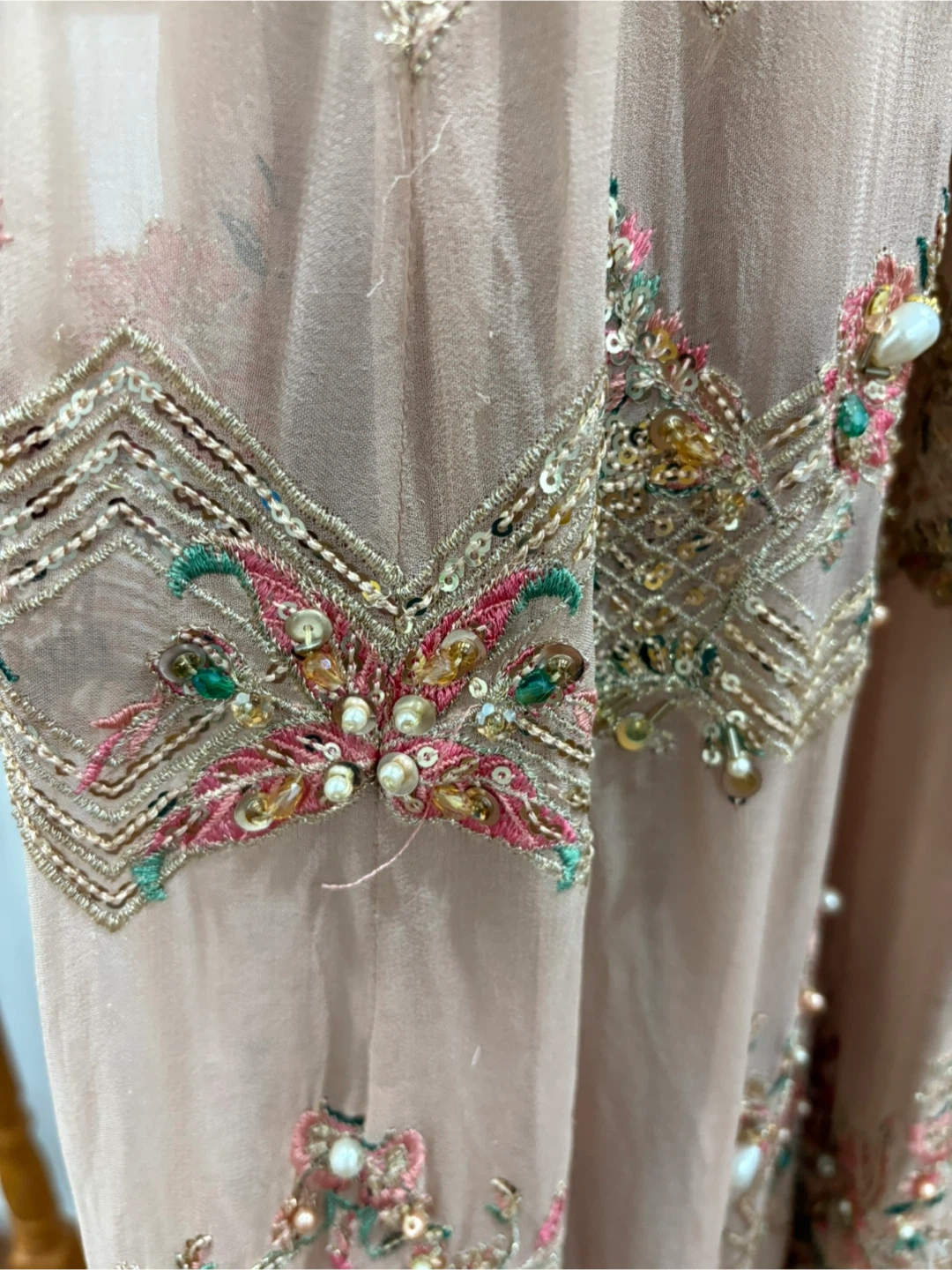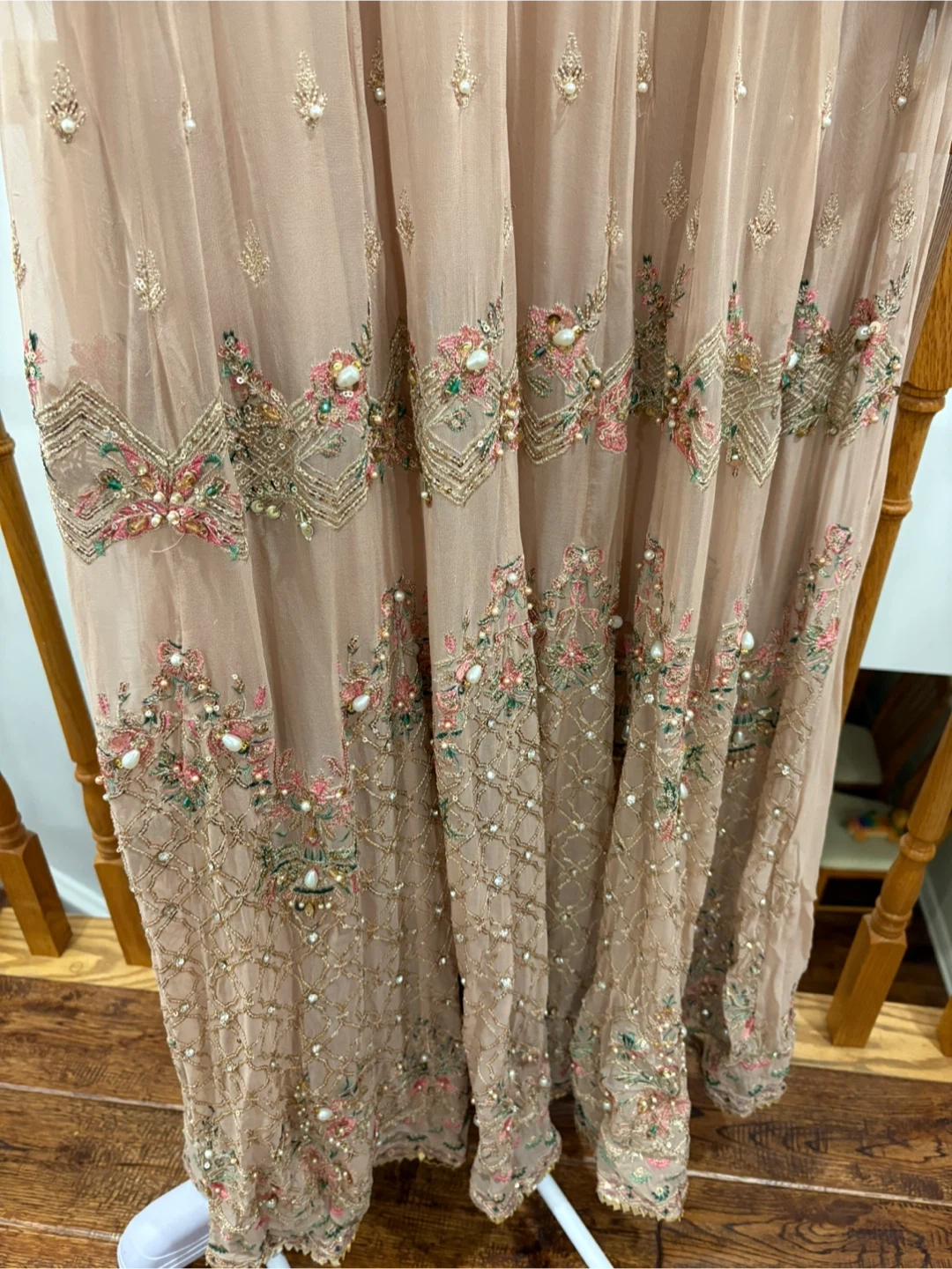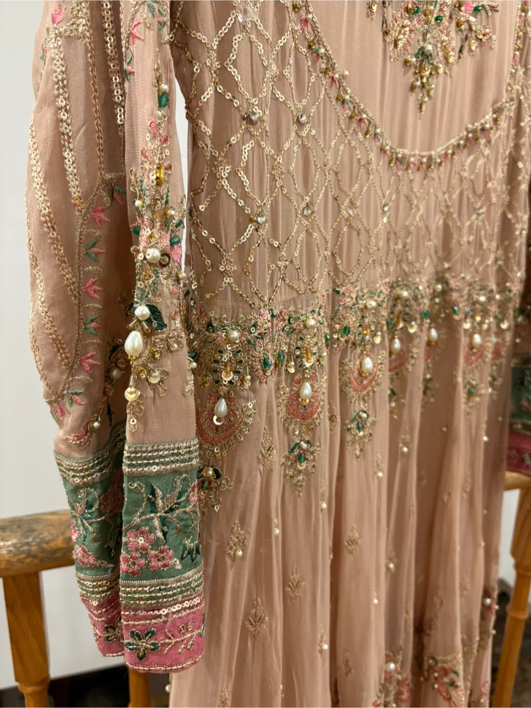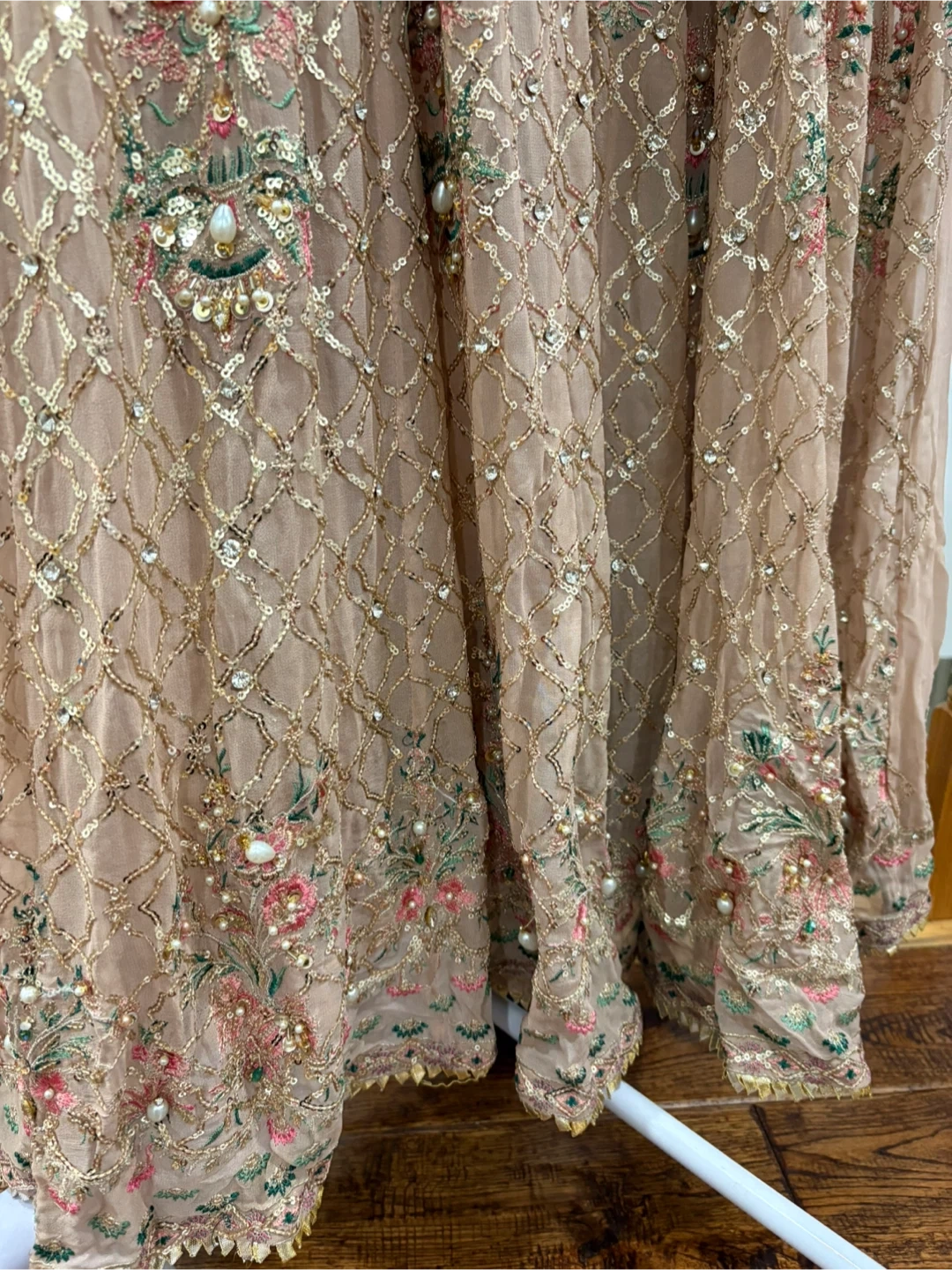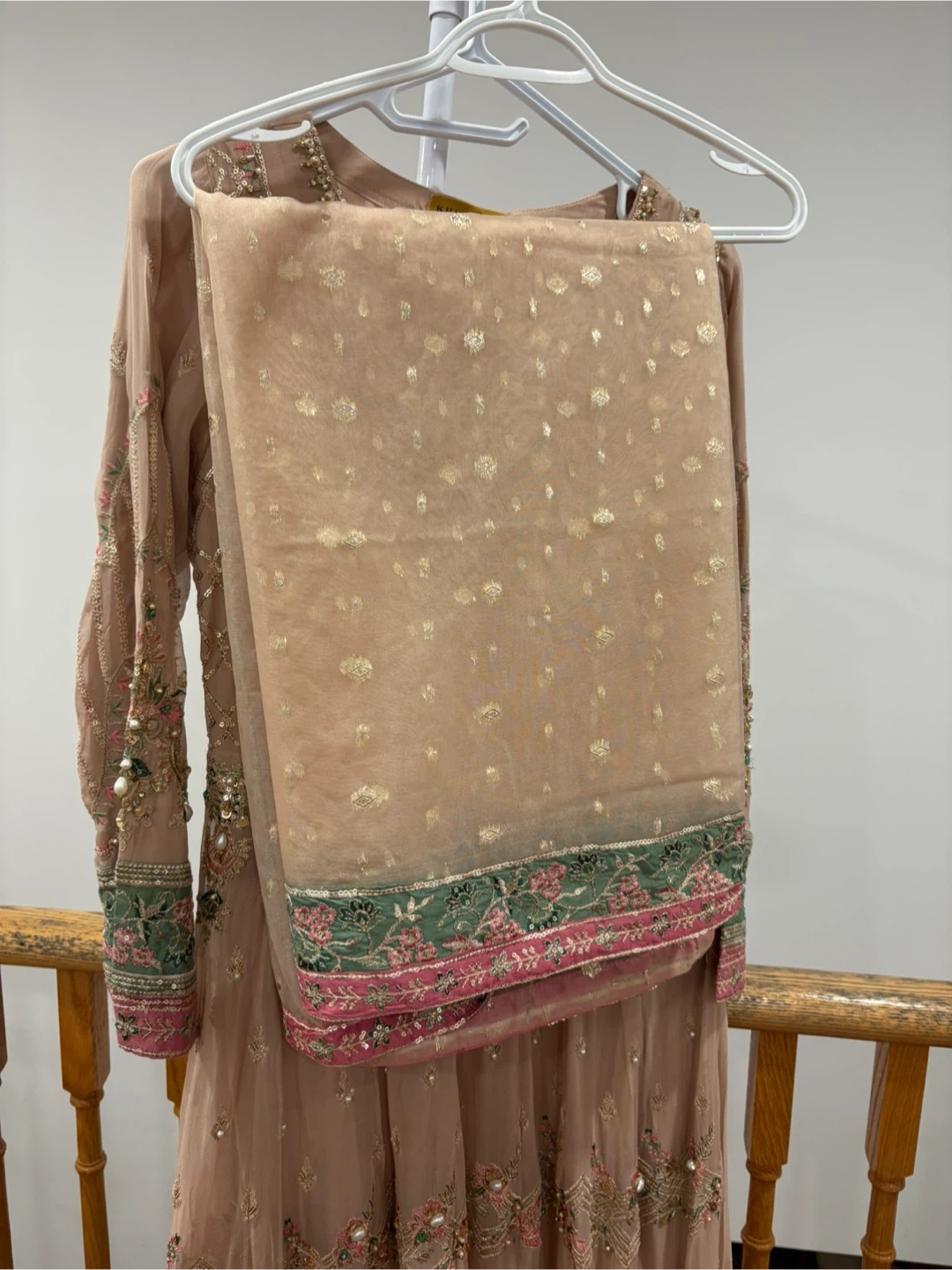 Beautiful Khaas formal dress in a lovely neutral tone. The dress features intricate beadwork and embroidery. Comes in 3 pieces and only worn once. Large size