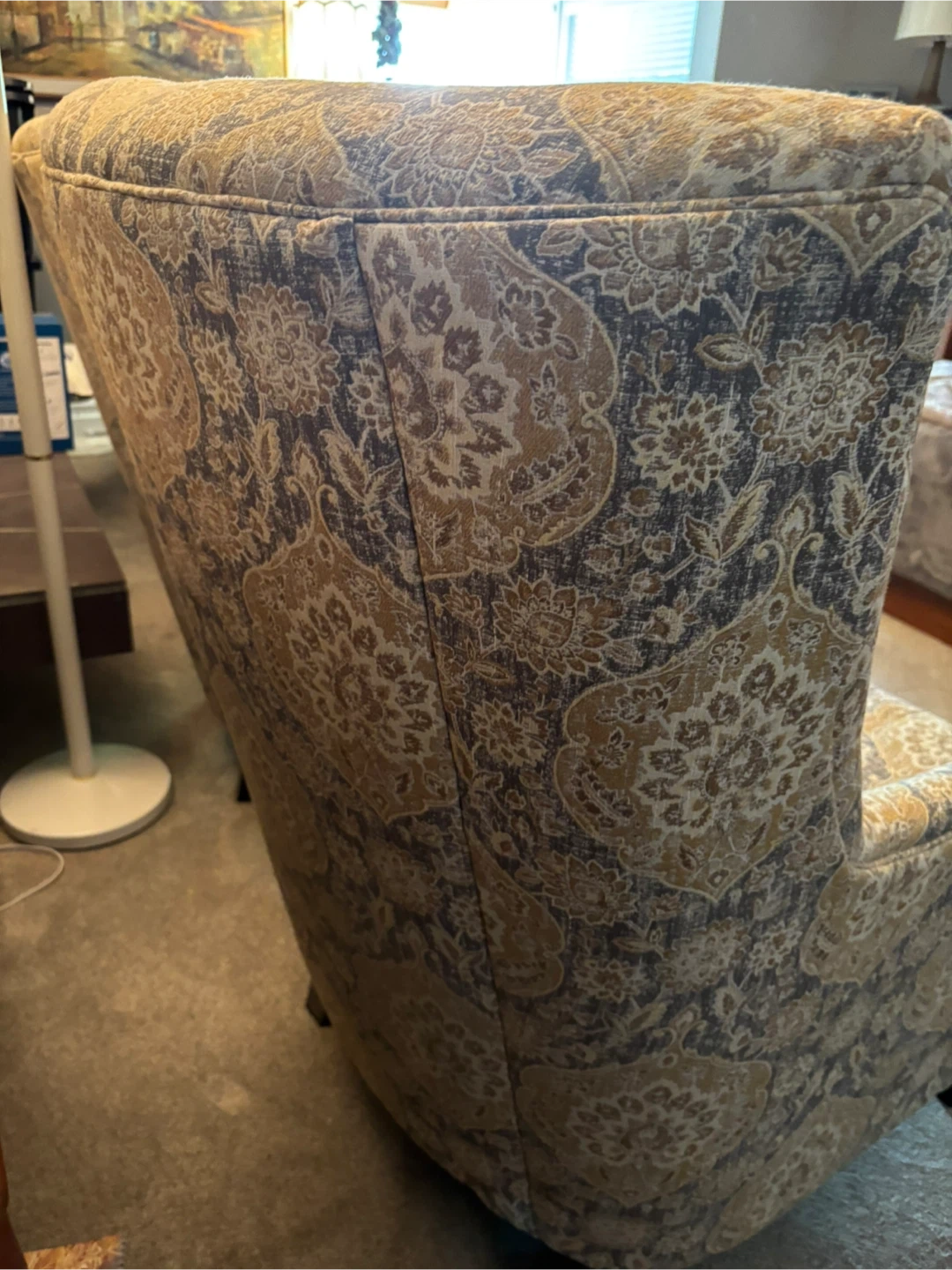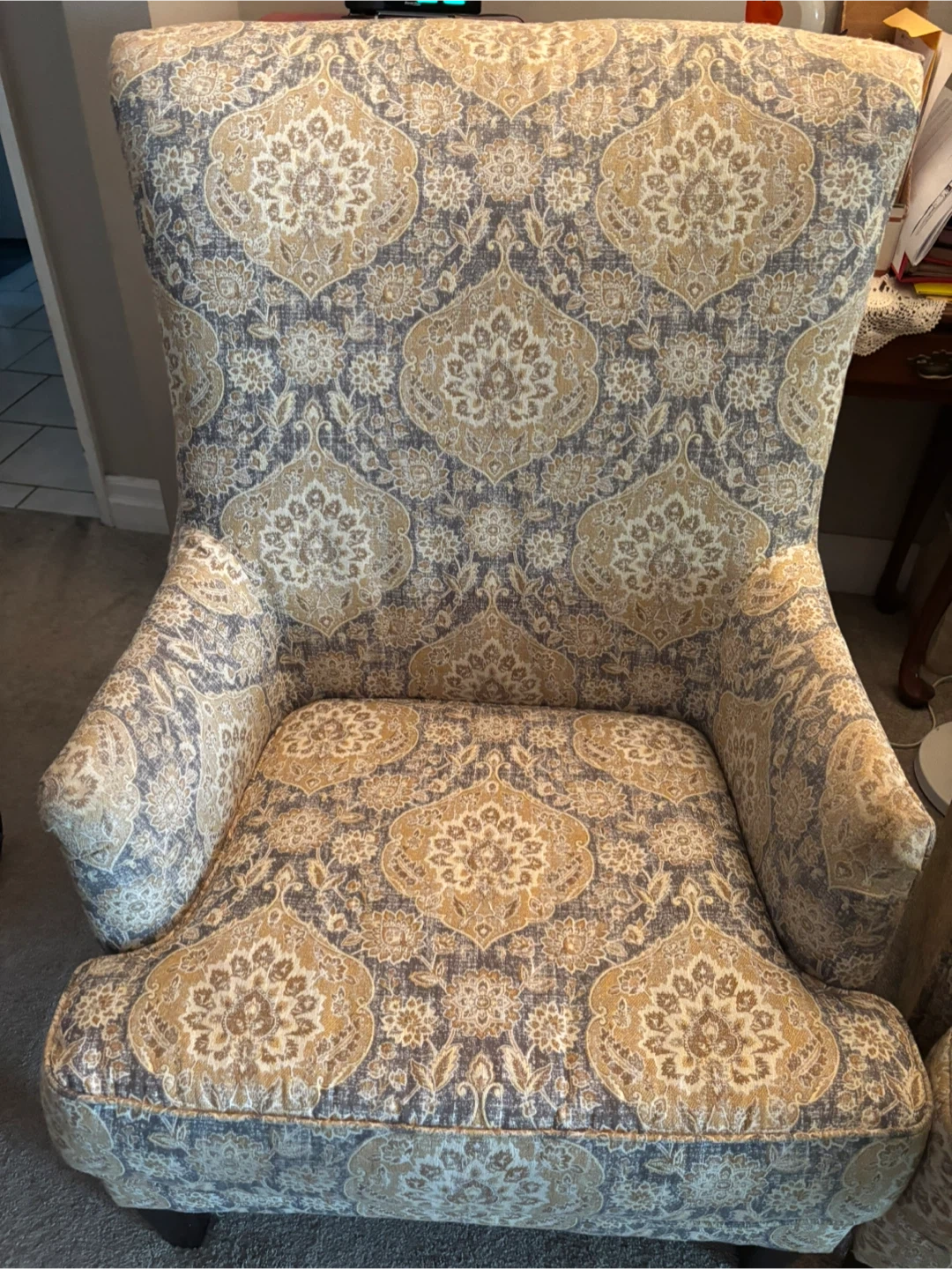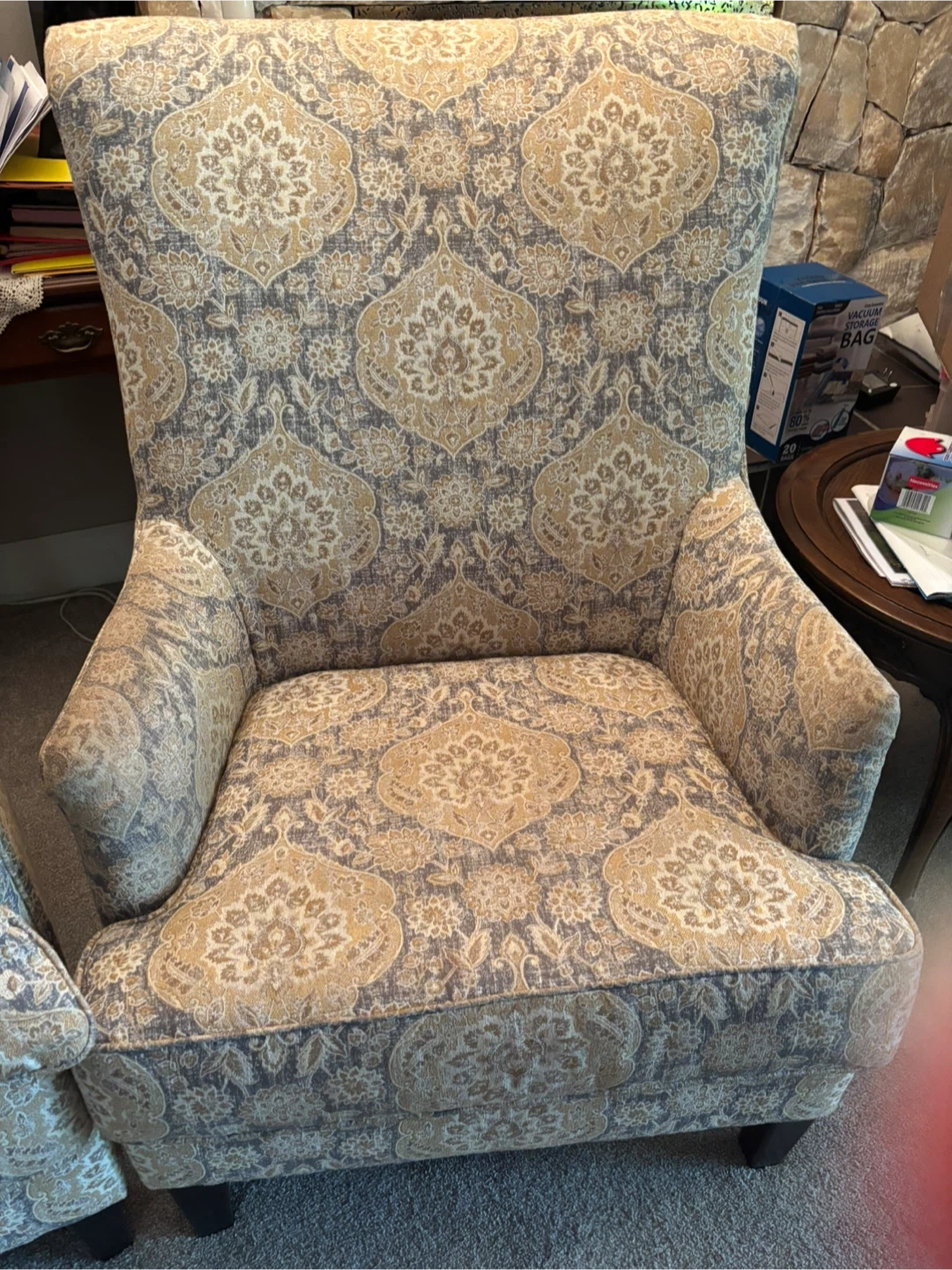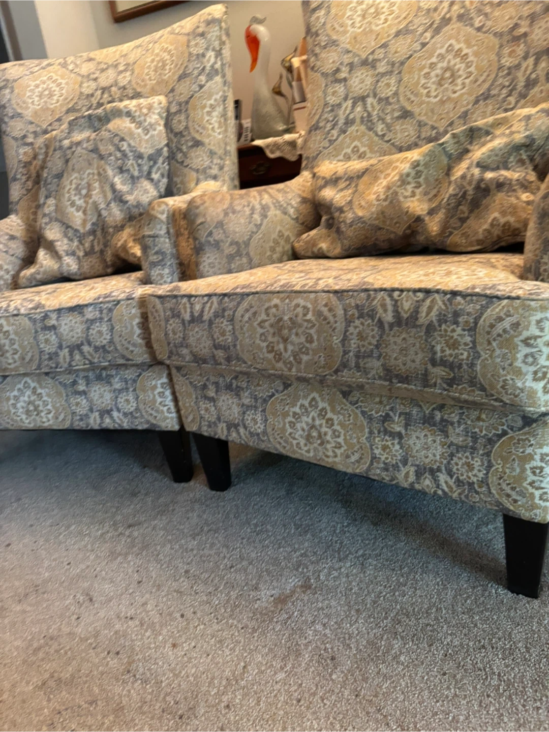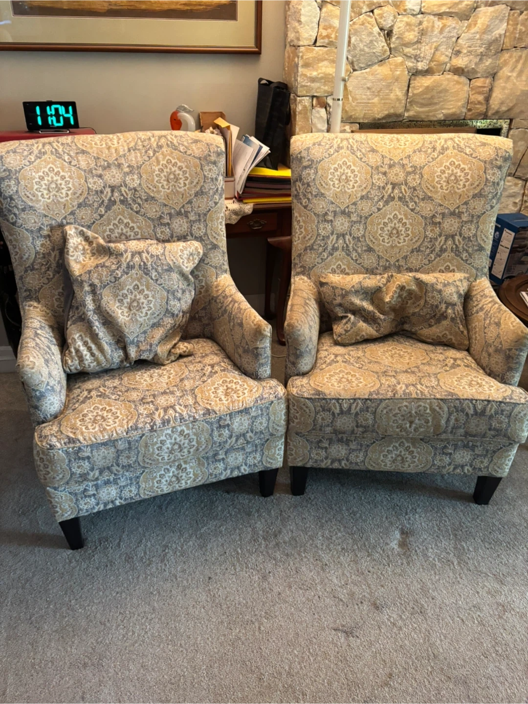 Selling a set of two patterned wingback chairs. They are in good condition and would look great in any living room or study. Each chair comes with a matching throw pillow!