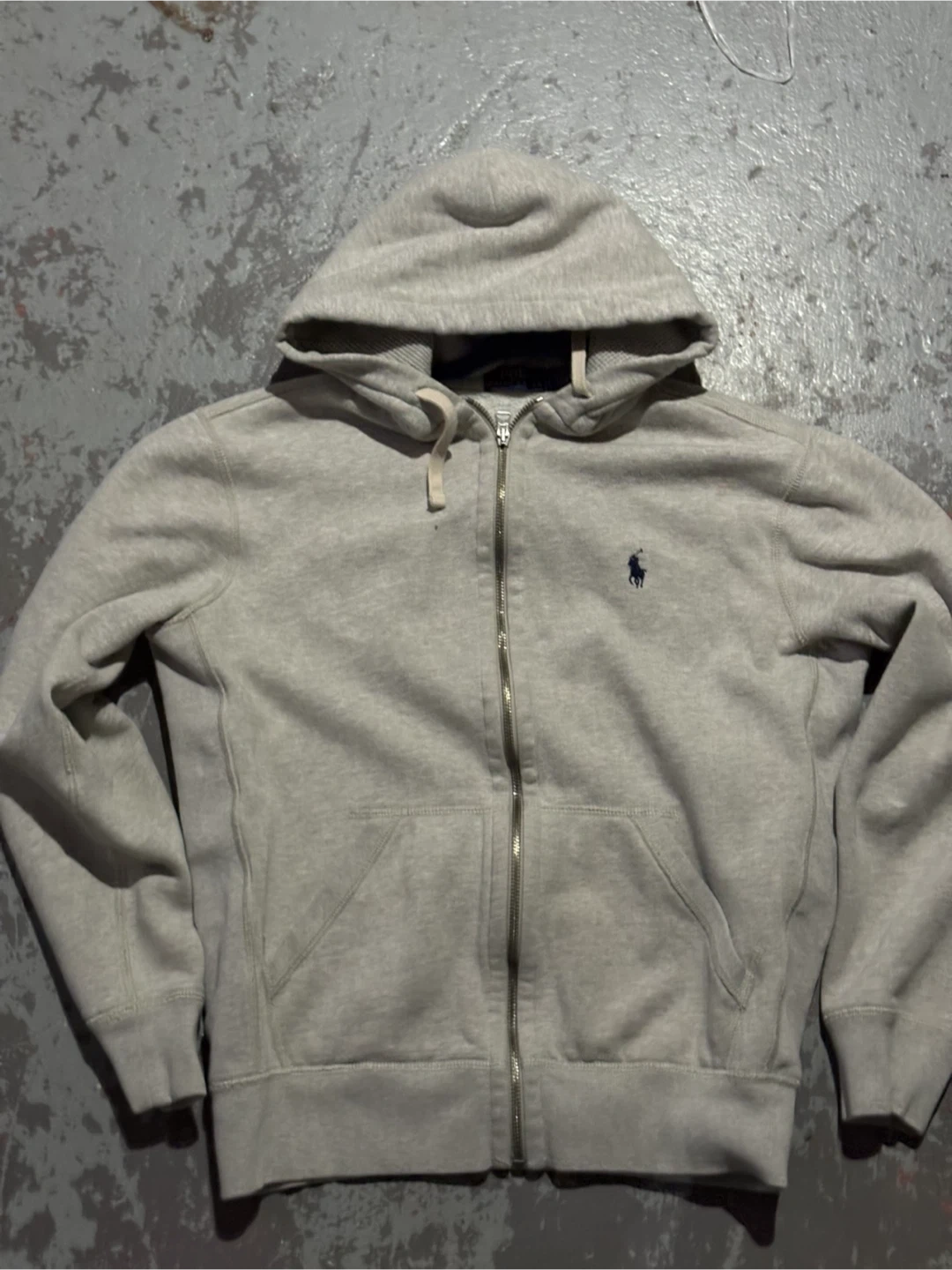 Selling a Polo Ralph Lauren full zip hoodie in a light grey colour. It's in great condition and features the classic Polo logo. Perfect for layering or wearing on its own!