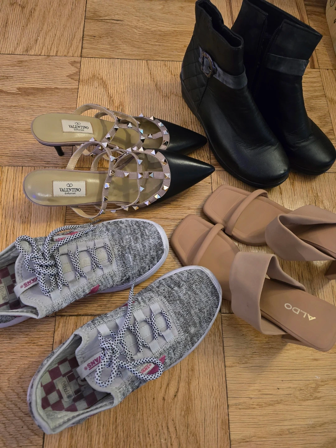 There's a pair of Valentino heels with the iconic studded design, Vans sneakers in a gray knit pattern, Aldo nude-colored heels, and a pair of black ankle boots (size 9W/40, they run small fits for 8,5W/39) They're all in good condition and ready for a new home!