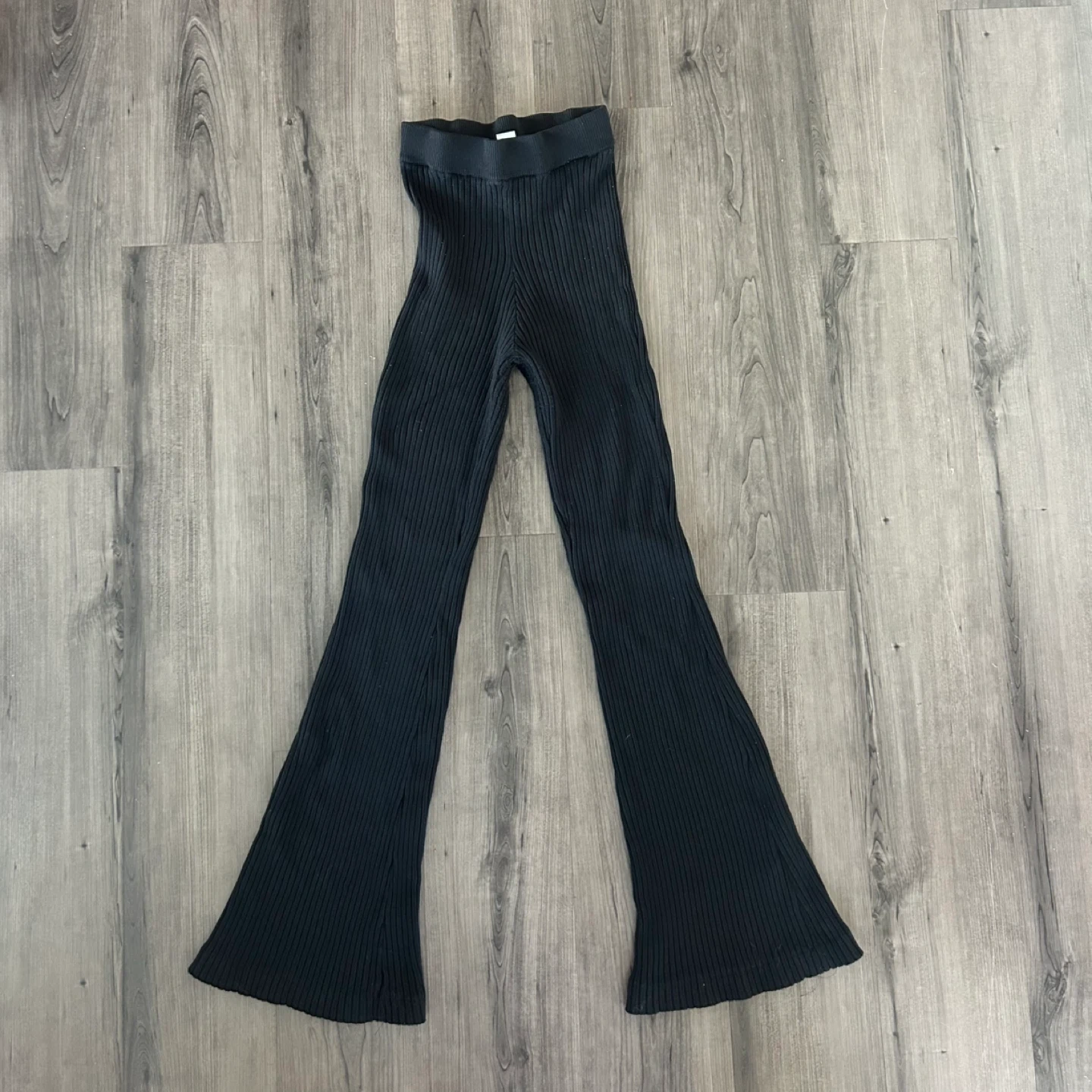 Selling a pair of black ribbed knit flare pants. They're in great condition and super comfy! Perfect for lounging or dressing up. The material is soft and stretchy, making them a versatile addition to your wardrobe!