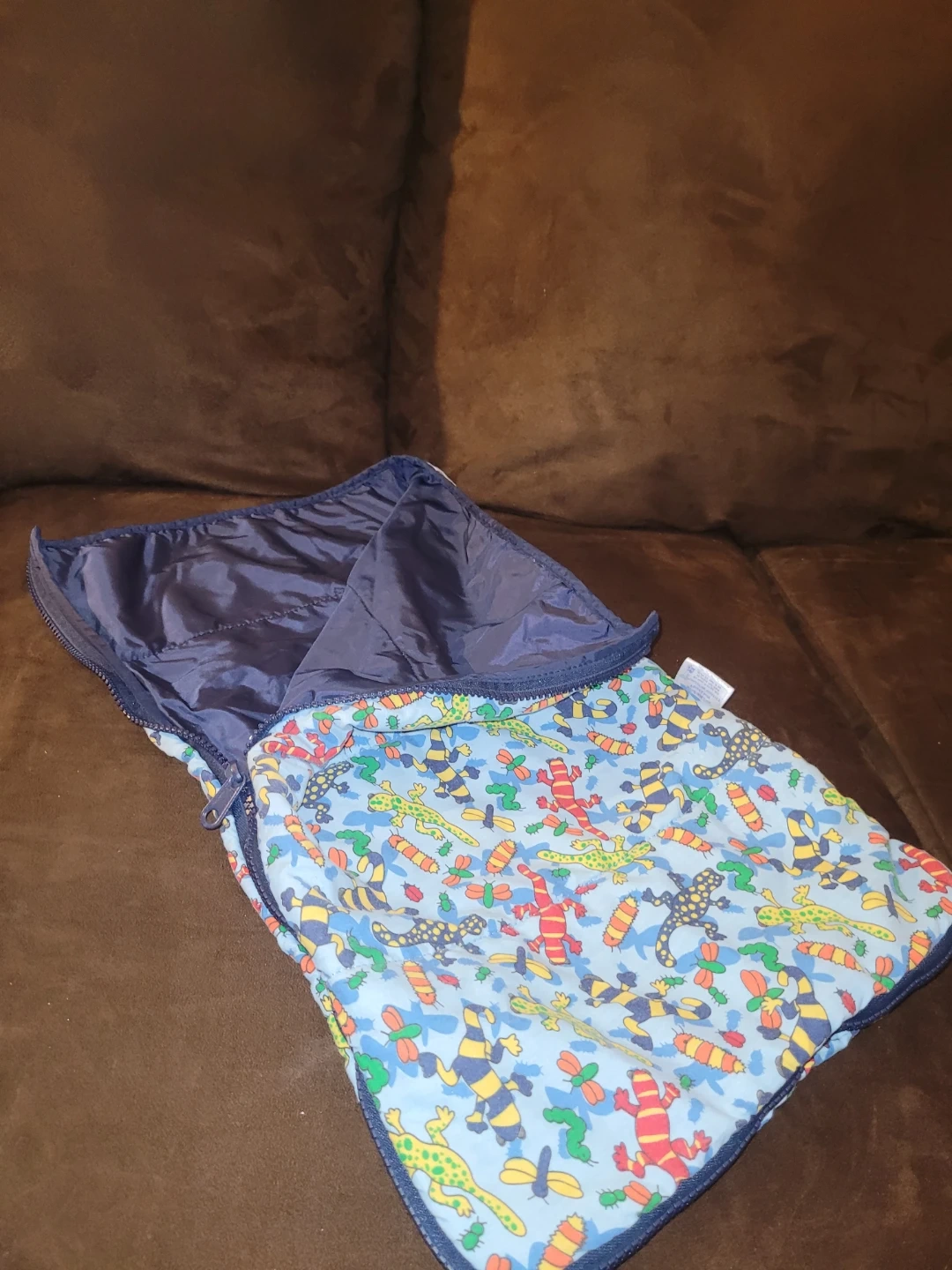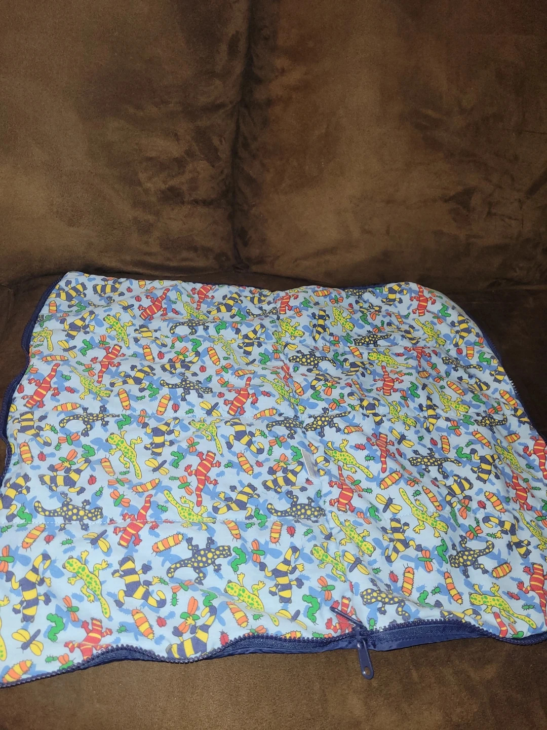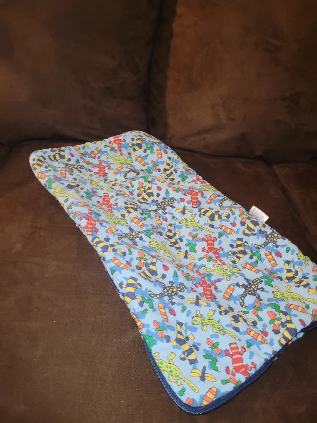 This adorable Build-A-Bear or doll sleeping bag features a colourful lizard pattern on a soft, cozy material, perfect for your plush friend's nap time. It's in good, used condition, ready for new adventures. It's a charming accessory for any Build-A-Bear or doll collection.