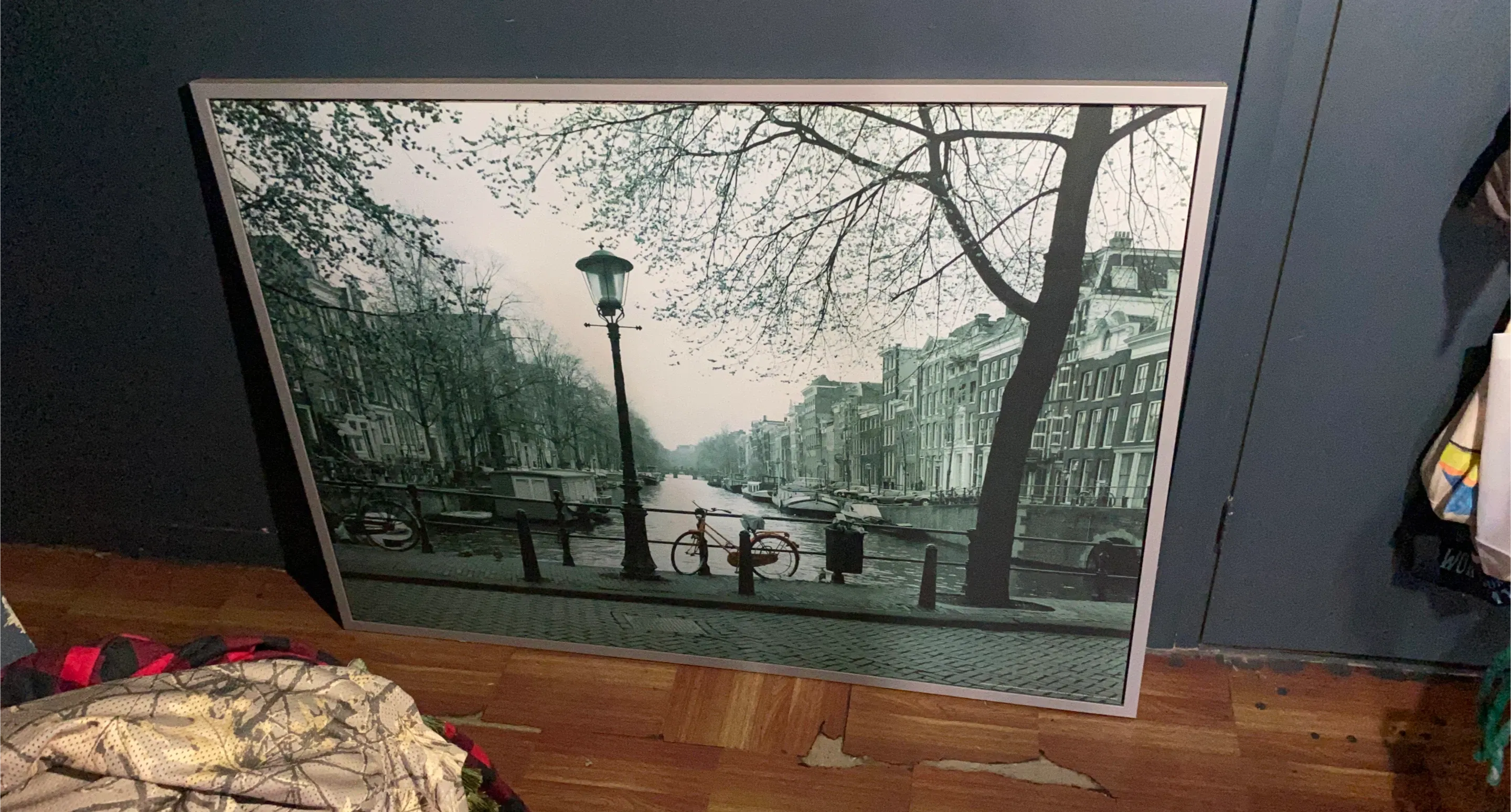 This is a framed print of a canal scene in Amsterdam. It's a nice piece of wall art if you like cityscapes and European scenery