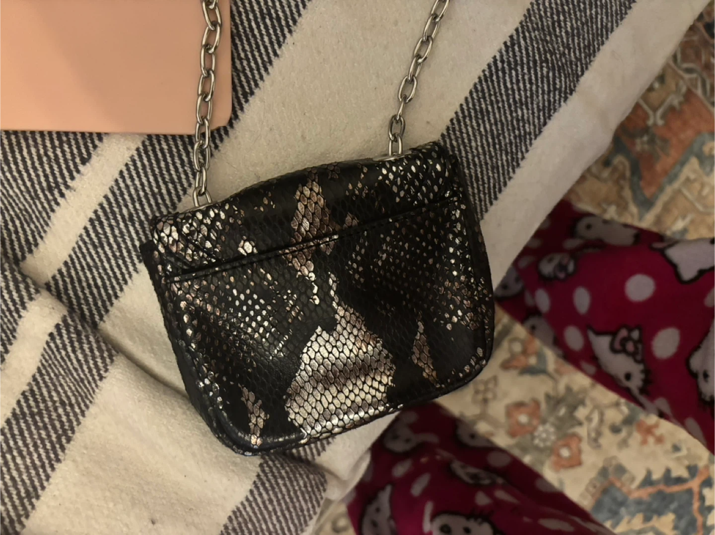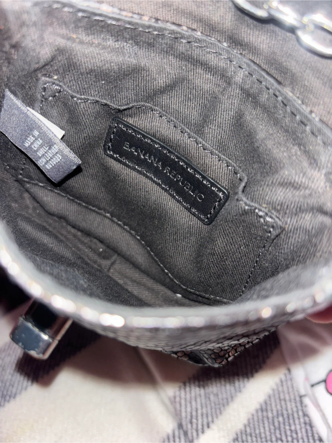 Here's a cool Banana Republic snakeskin chain bag! It's perfect for adding a touch of edgy style to your outfit. The chain adds a bit of glam, and the snakeskin pattern is super trendy