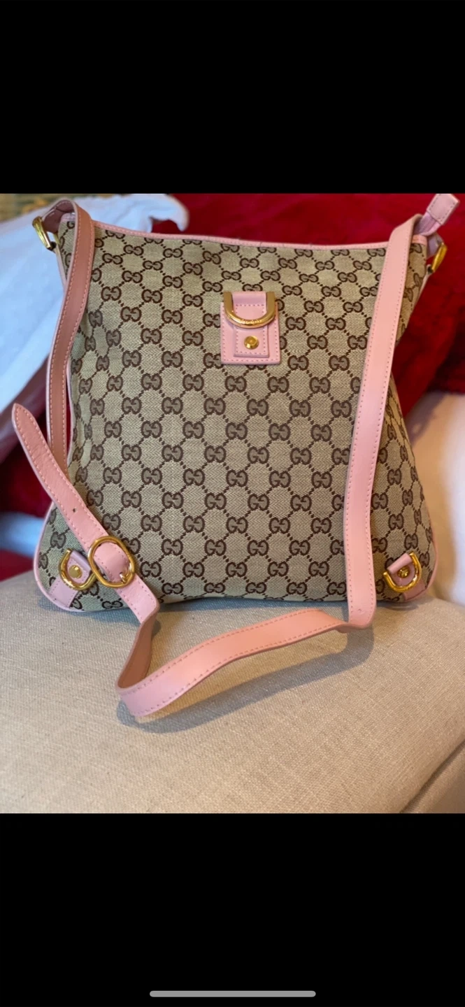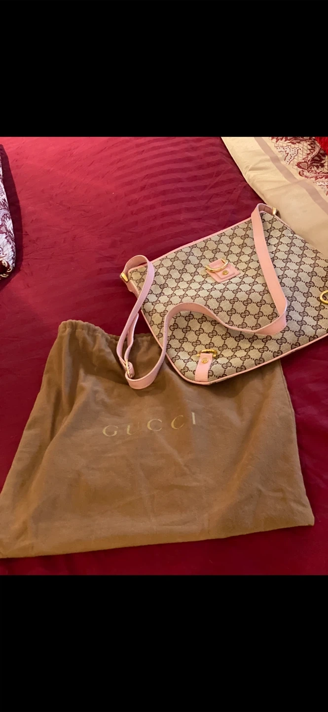 💖Selling a Gucci carrier shoulder bag! It comes with its original dust bag. The bag features the classic Gucci pattern with pink accents. It's in great condition and ready for a new owner!💖