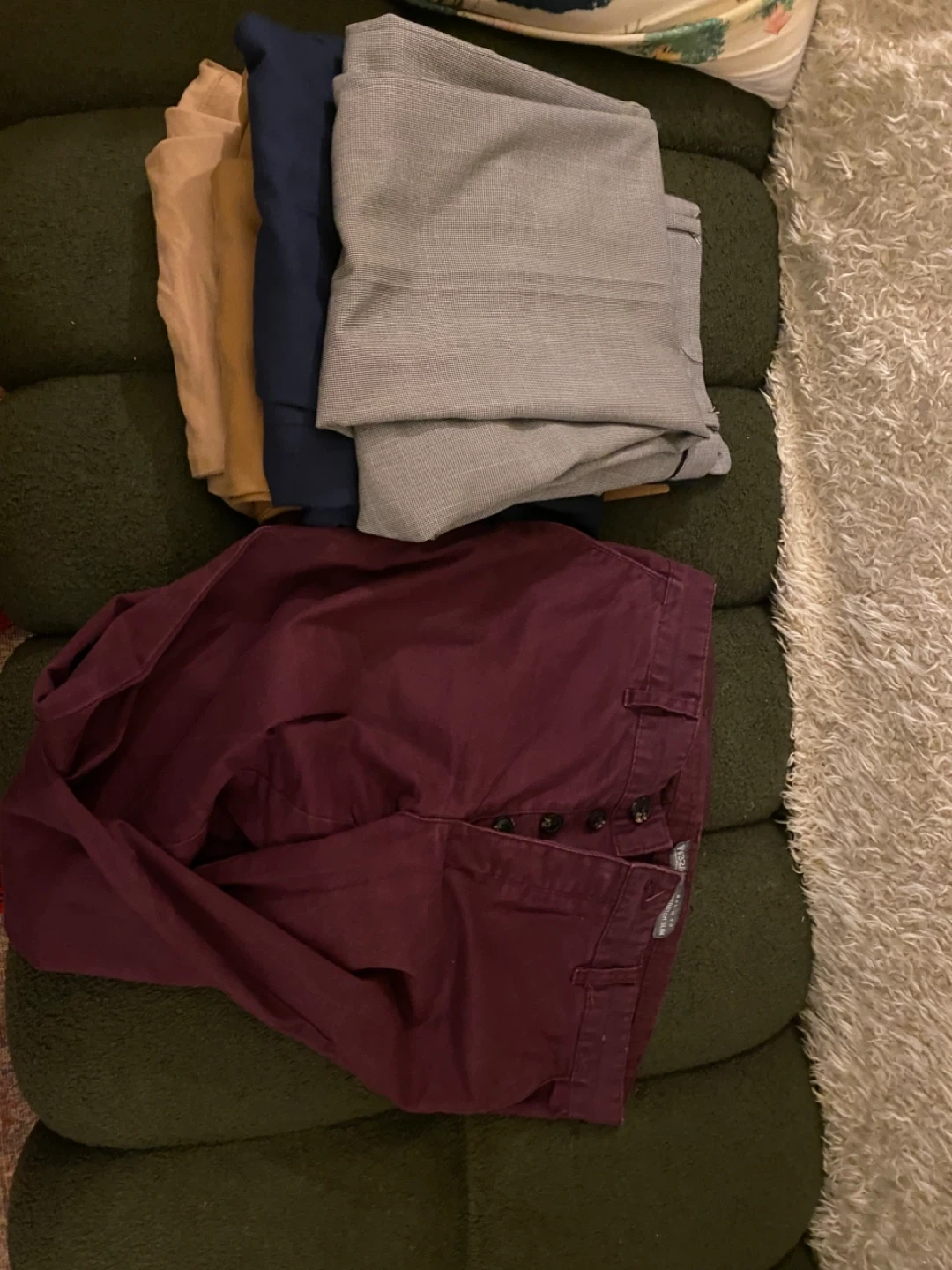 Selling a bundle of six pairs of men's pants and chinos in assorted colors: tan, navy blue, gray, and maroon. All are in used condition and ready for a new home!