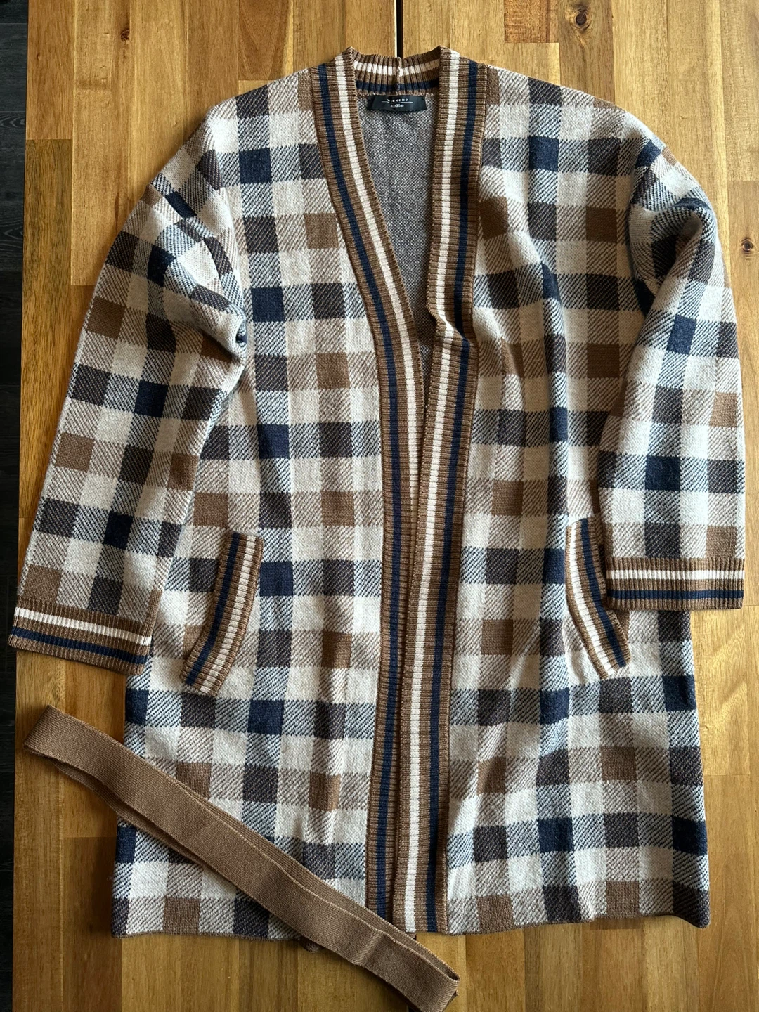 Weekend MaxMara open belted cardigan with a plaid pattern. It comes with a belt. The cardigan features a mix of brown, beige, and navy colours. Perfect for layering!