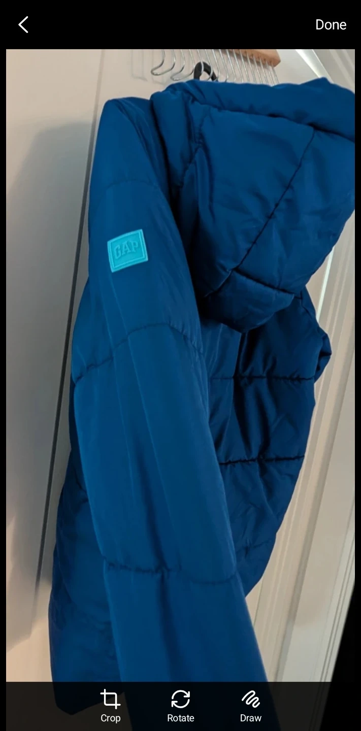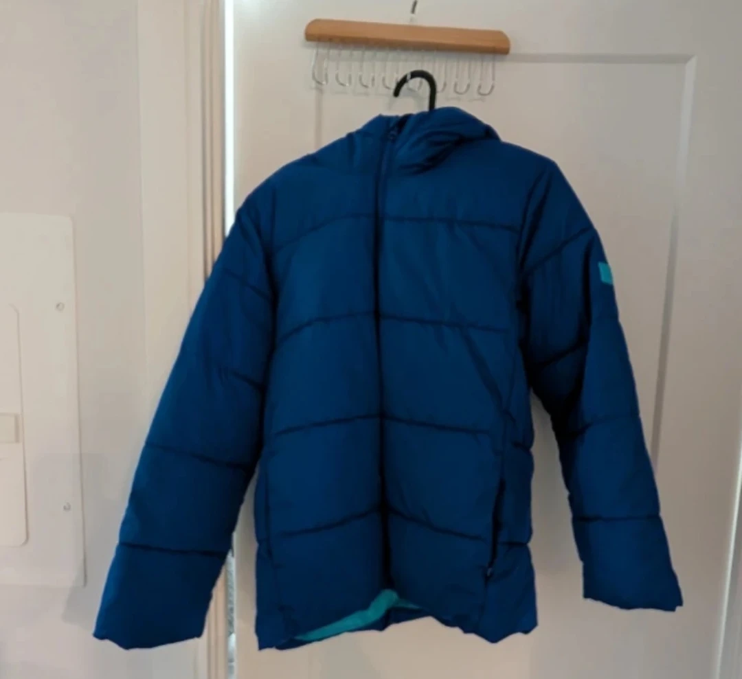 I'm selling a blue GAP puffer jacket. It's in great condition and ready for the cooler weather! The jacket features a hood and a comfortable fit. Perfect for staying warm and stylish!