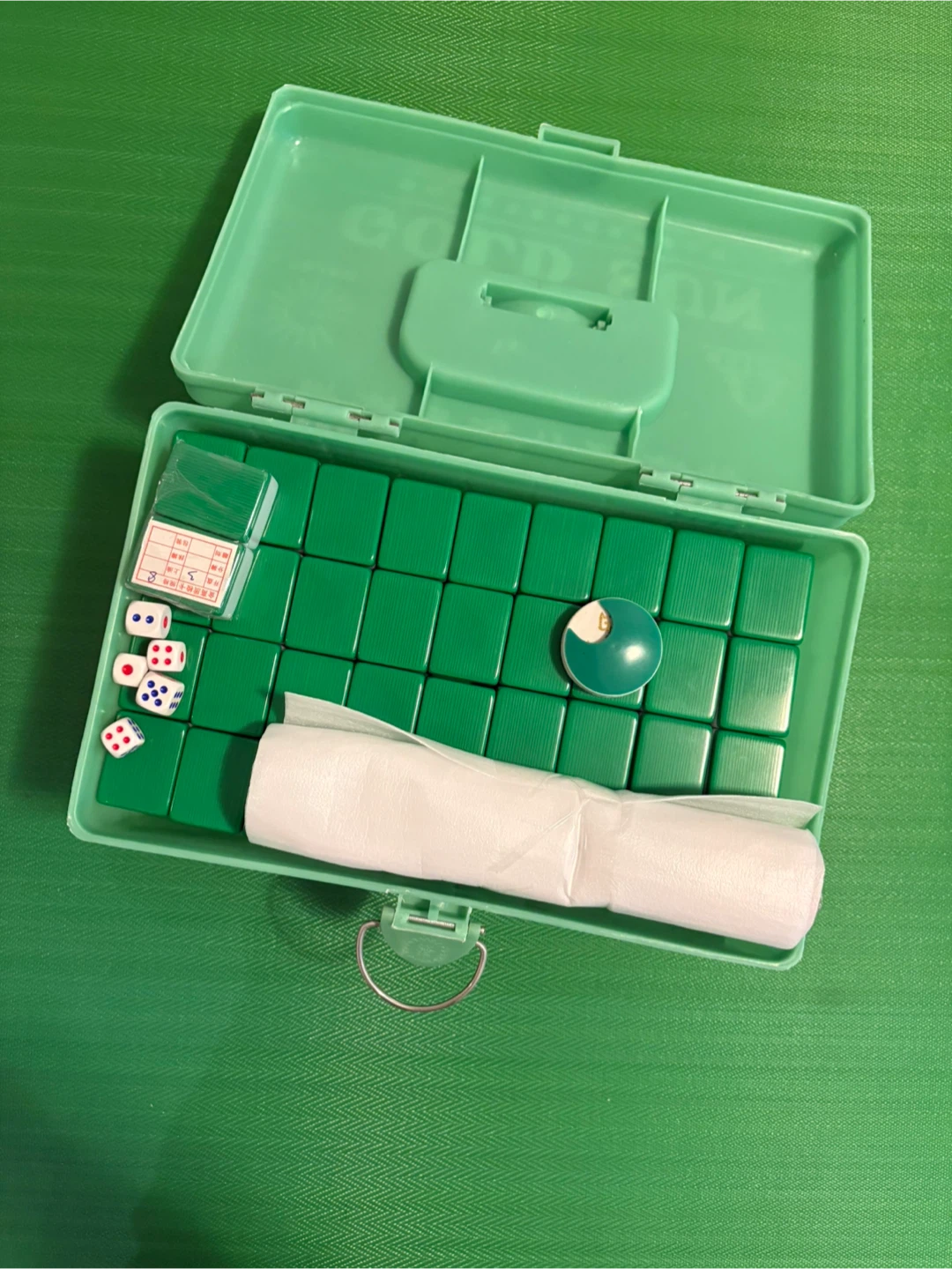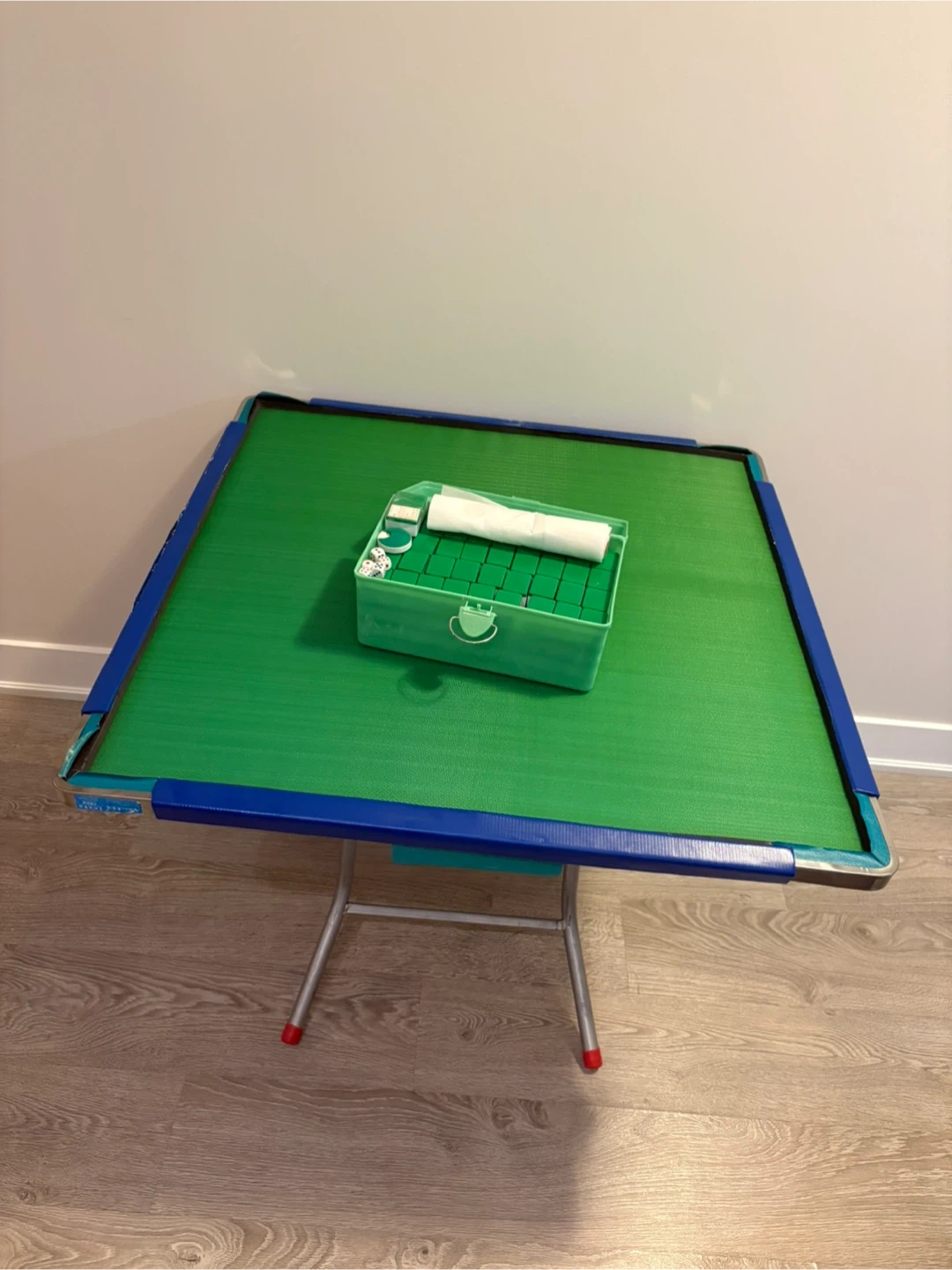 Includes a foldable Mahjong table and a Mahjong tile set with a carrying case.