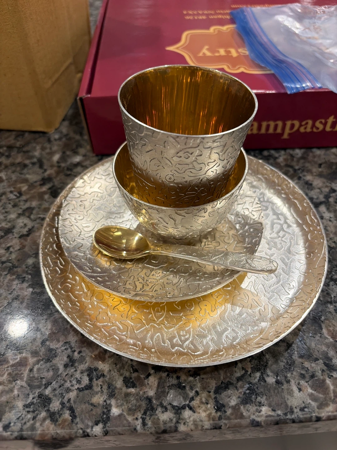 Giving away a beautiful silver plated set that includes a bowl, plate, and spoon. The set has an intricate design and a golden interior to the bowl. It's in great condition and would make a lovely addition to any home!
