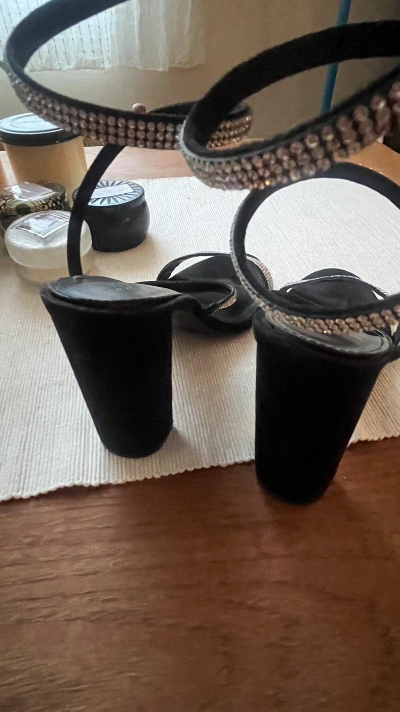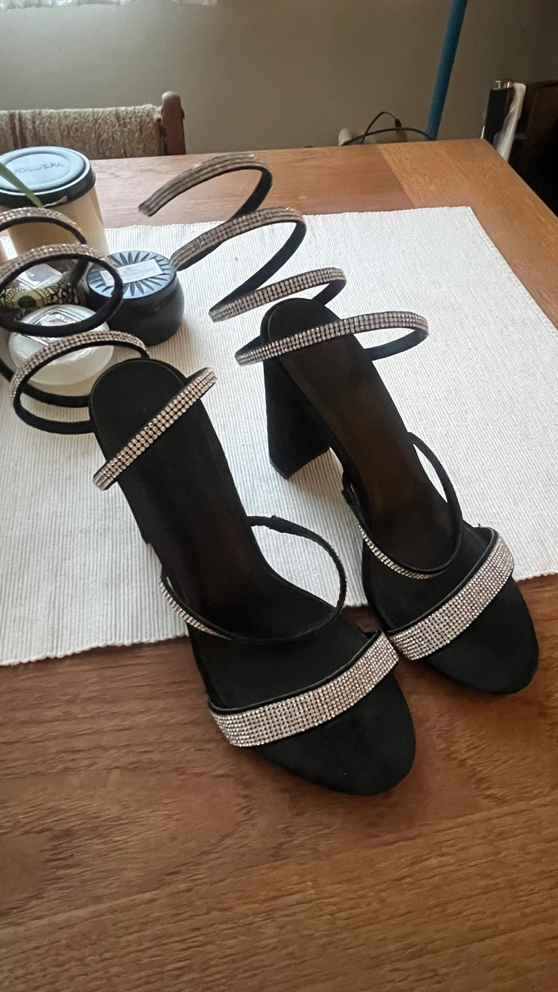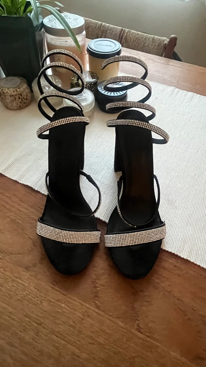 These black heels from On Streetwear Society are perfect for a night out! They feature a unique spiral design with rhinestone detailing. They are in great condition and ready for a new owner!