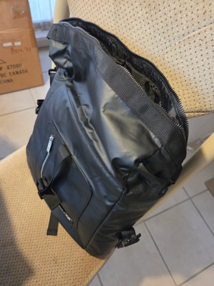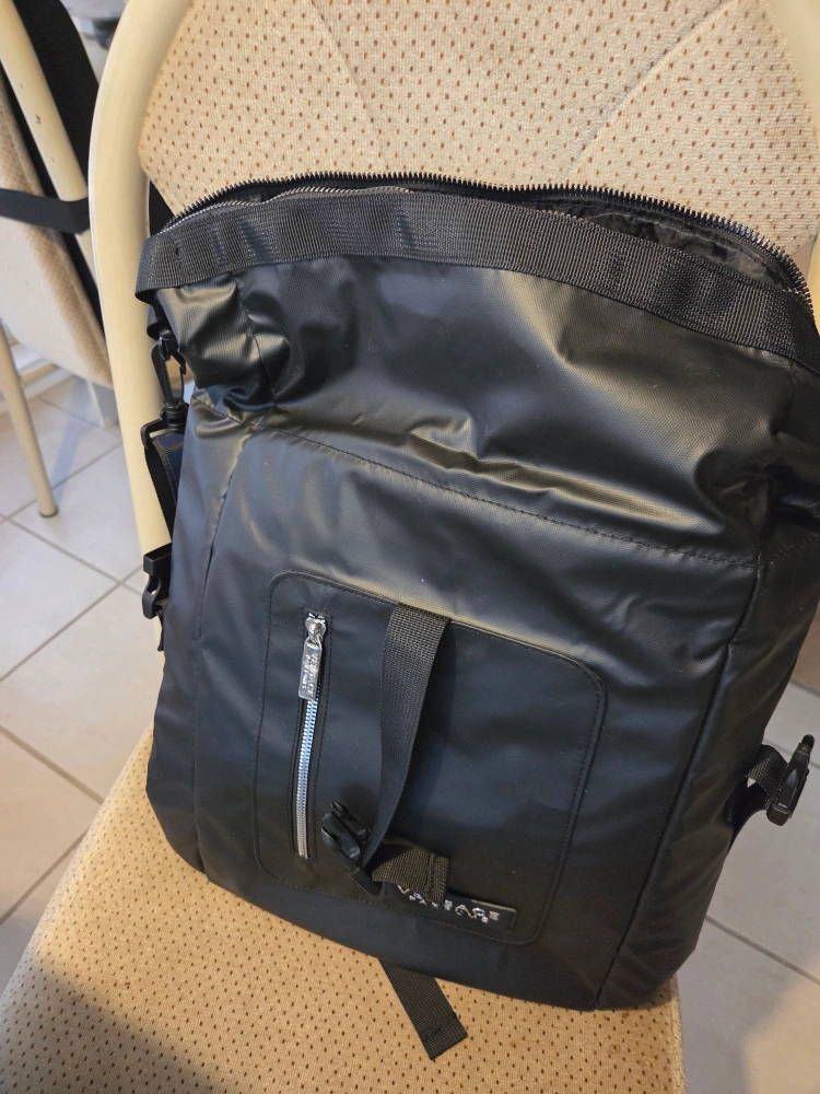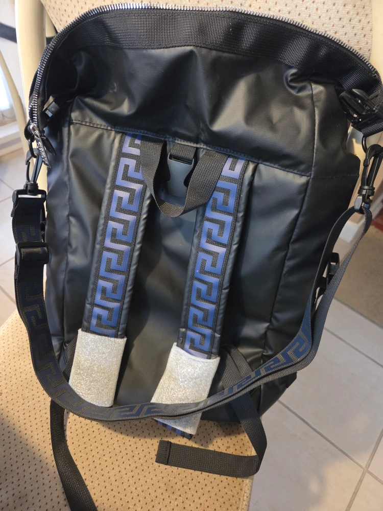 NEW. Great and versatile backpack. Stylish. Elegant. Selling a Versace black backpack. It features a front pocket with a silver zipper and the Versace logo on the bottom front. The straps have a blue and black Versace pattern.