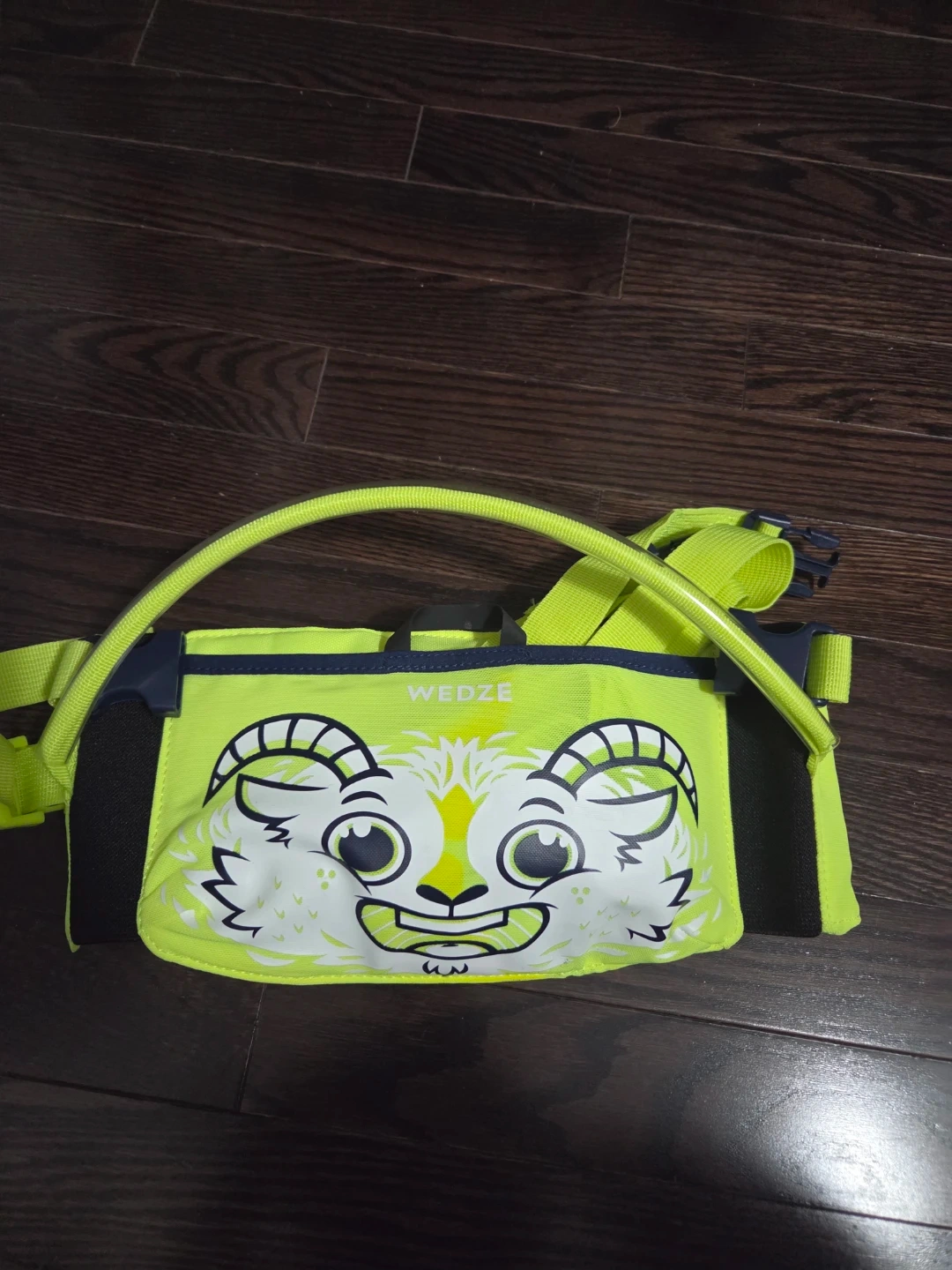 Selling a Wedze kids ski harness in a bright neon yellow colour! It features a fun cartoon design on the front. Perfect for helping your little one learn to ski safely and confidently on the slopes