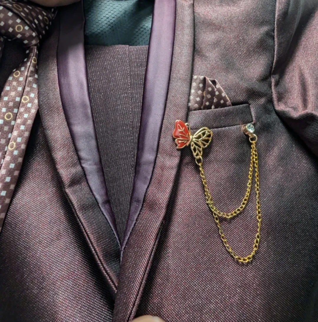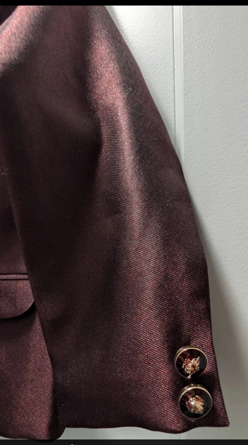 Selling a burgundy suit jacket. The jacket has a unique design with decorative buttons and a pocket square detail. It's in great condition and ready for a new occasion! Just wore once. Comes with Pant & Tie.