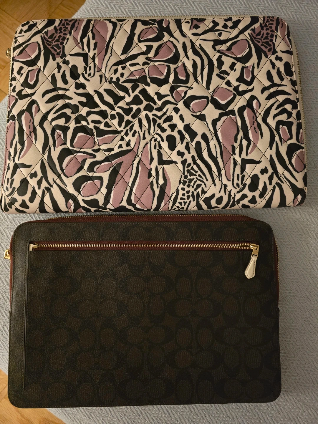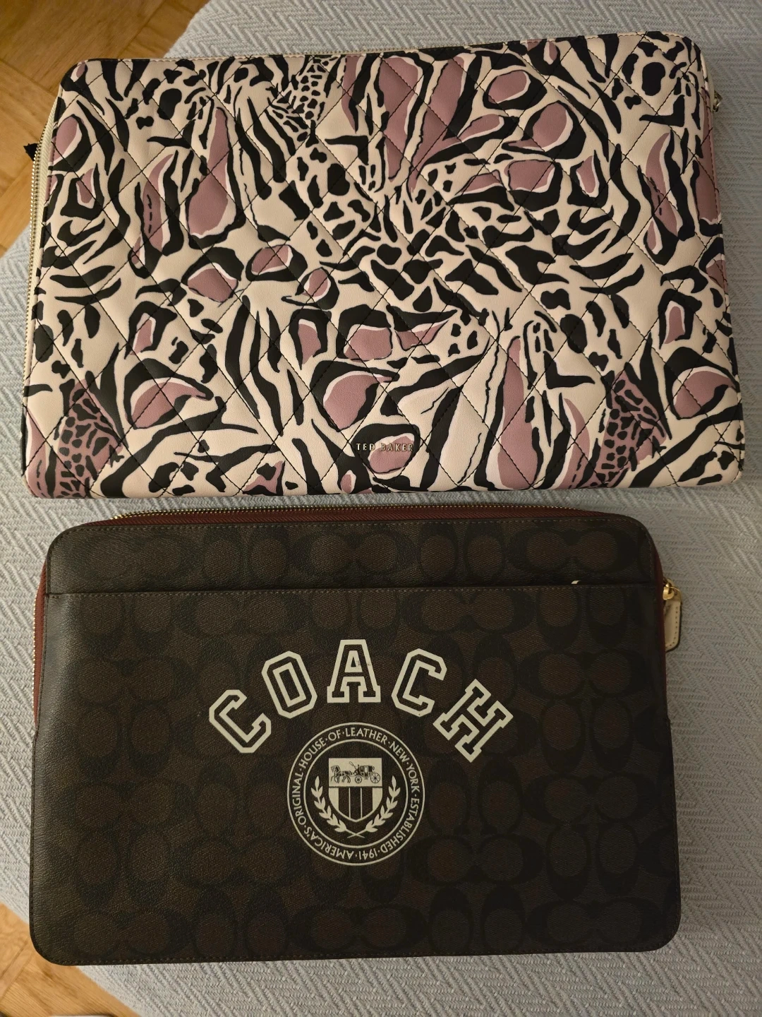 Selling two laptop sleeves. One is a Coach sleeve (13") with the signature logo print, and the other is a Ted Baker London sleeve (15") with a unique animal print. Both are in great condition and perfect for protecting your laptop!