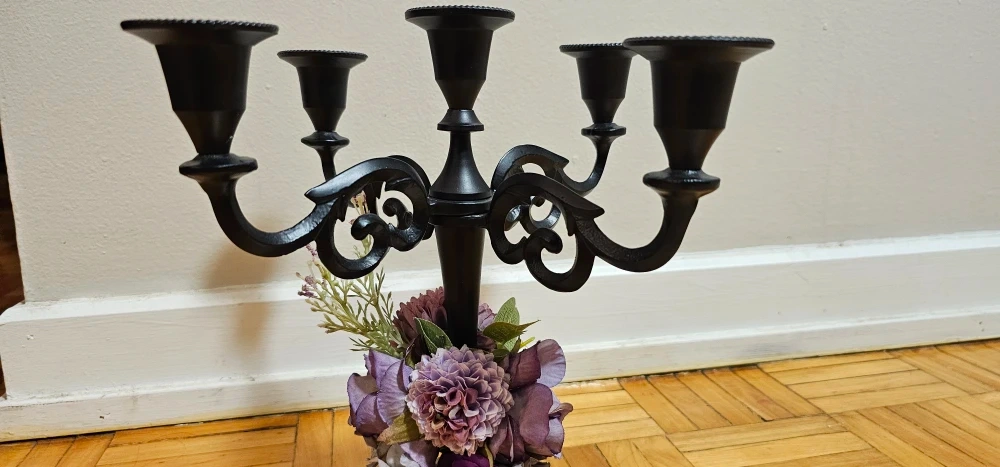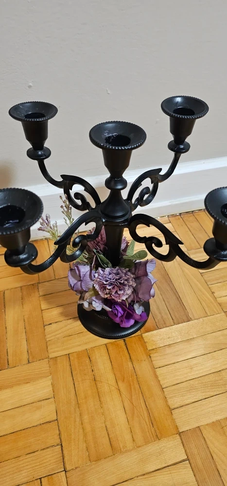 Selling a black metal candelabra! It's in great shape and comes with some lovely purple floral decorations at the base. It holds five candles and would make a beautiful centrepiece for any table