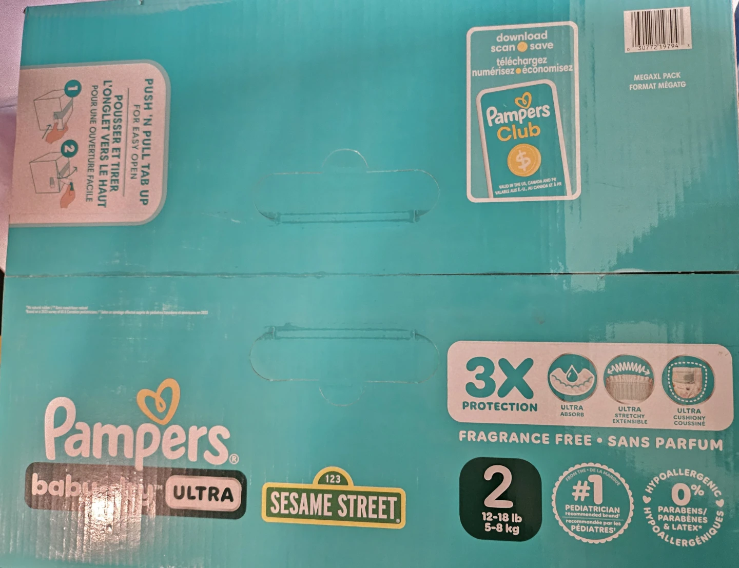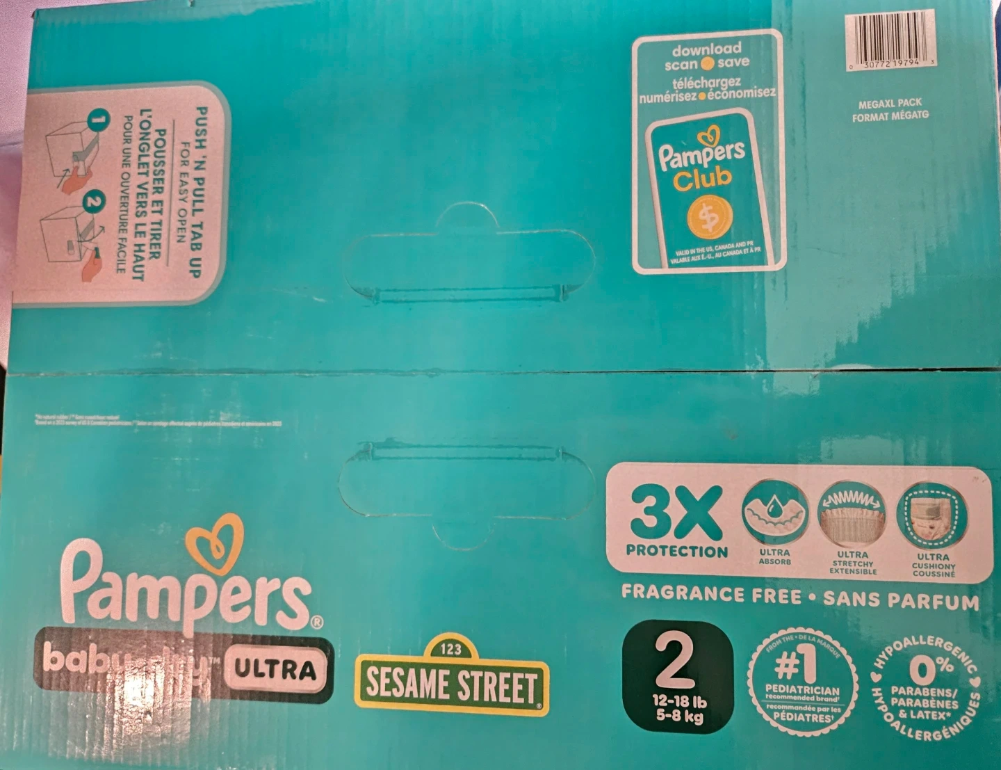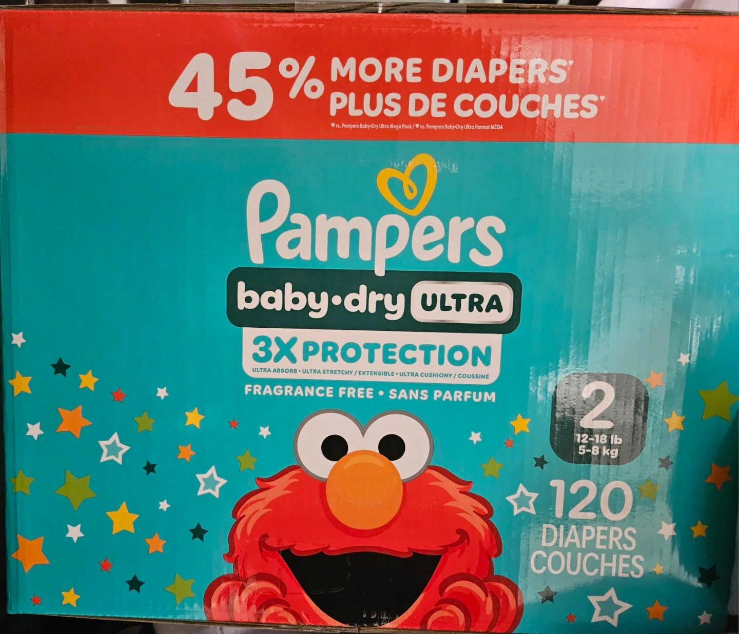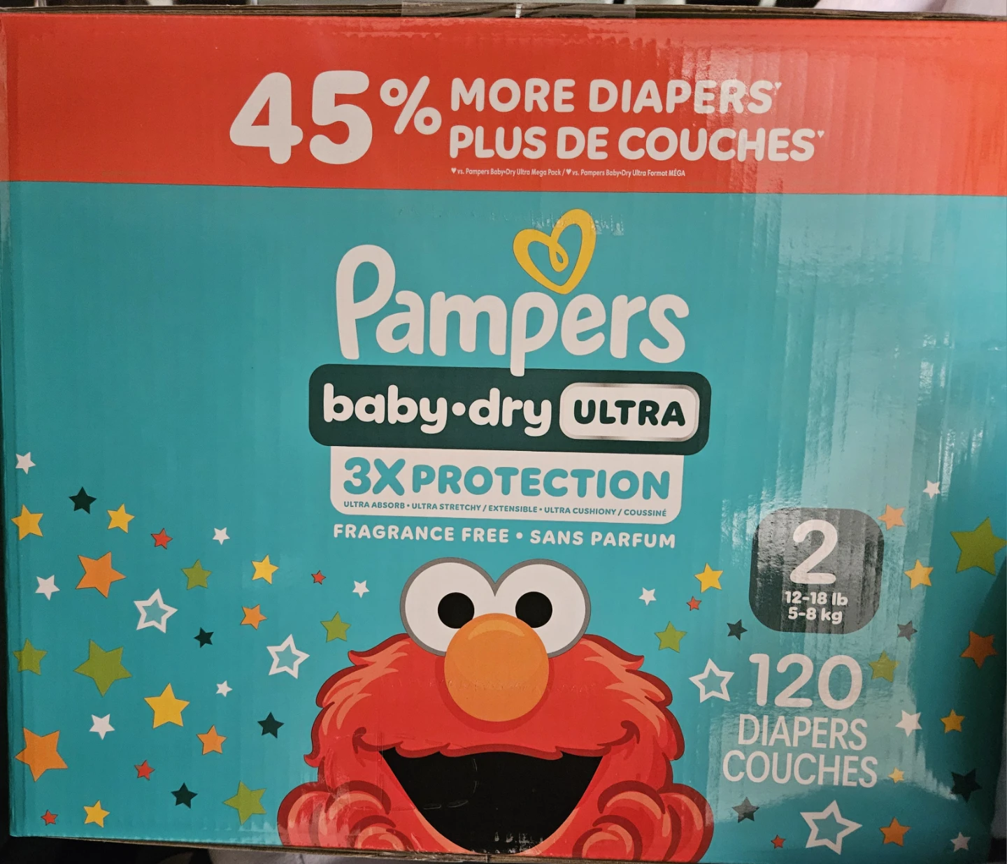 Selling a box of Pampers Baby Dry Ultra diapers, size 2. These are for babies weighing 12-18 lb (5-8 kg). The box contains 120 diapers and offers 3x protection. They're fragrance-free and hypoallergenic.