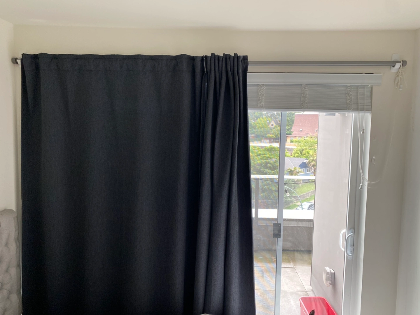 IKEA blackout blinds and adjustable curtain rod. They cover my patio double doors, extending to about 8ft across. The bottom is not hemmed and can be let out a bit more if you want.