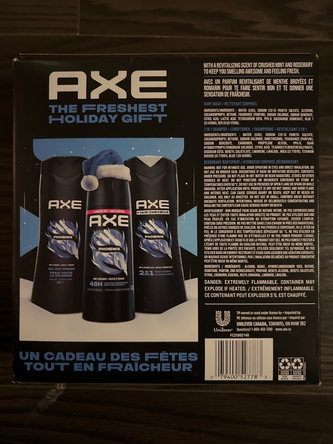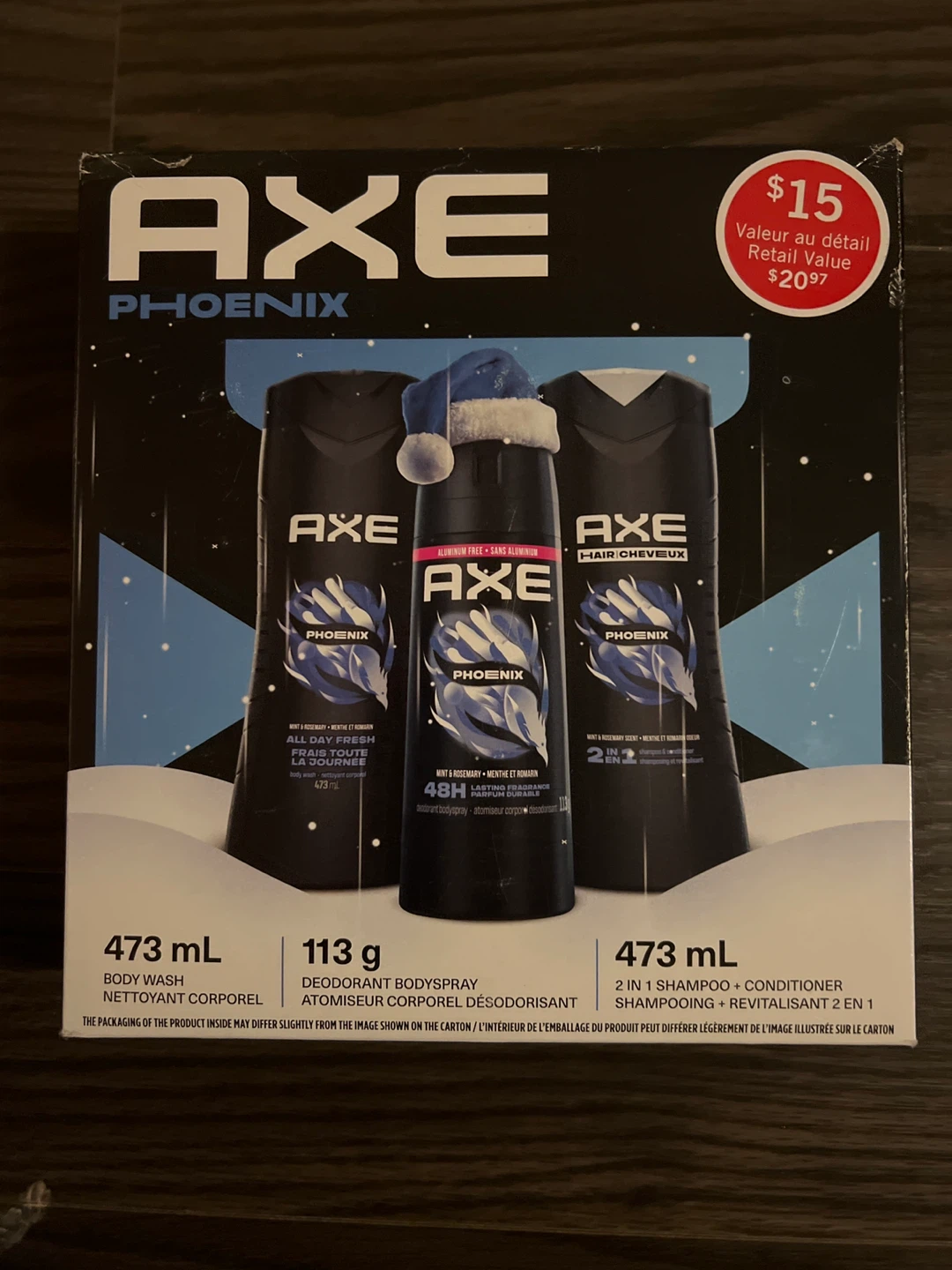 Selling an Axe Phoenix The Freshest Holiday Gift set! It includes body wash, deodorant body spray, and 2 in 1 shampoo and conditioner. The body wash and shampoo are 473 mL each, and the deodorant is 113 g. The retail value is $20.97