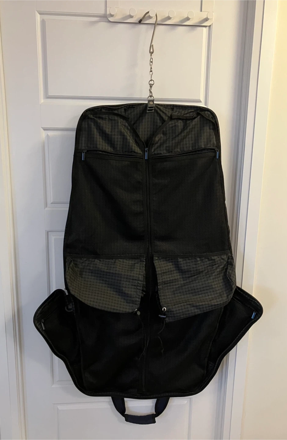 New garment bag in blue colour . Features a large compartment for hanging clothes, a smaller pocket, a zippered compartment, and a side pocket. Includes a hanger.