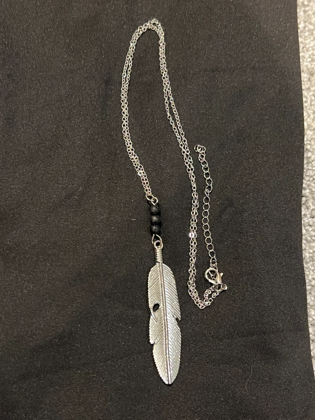 Selling a feather pendant necklace. The necklace has a silver-tone chain with black beads and a silver feather pendant. It's in great condition!