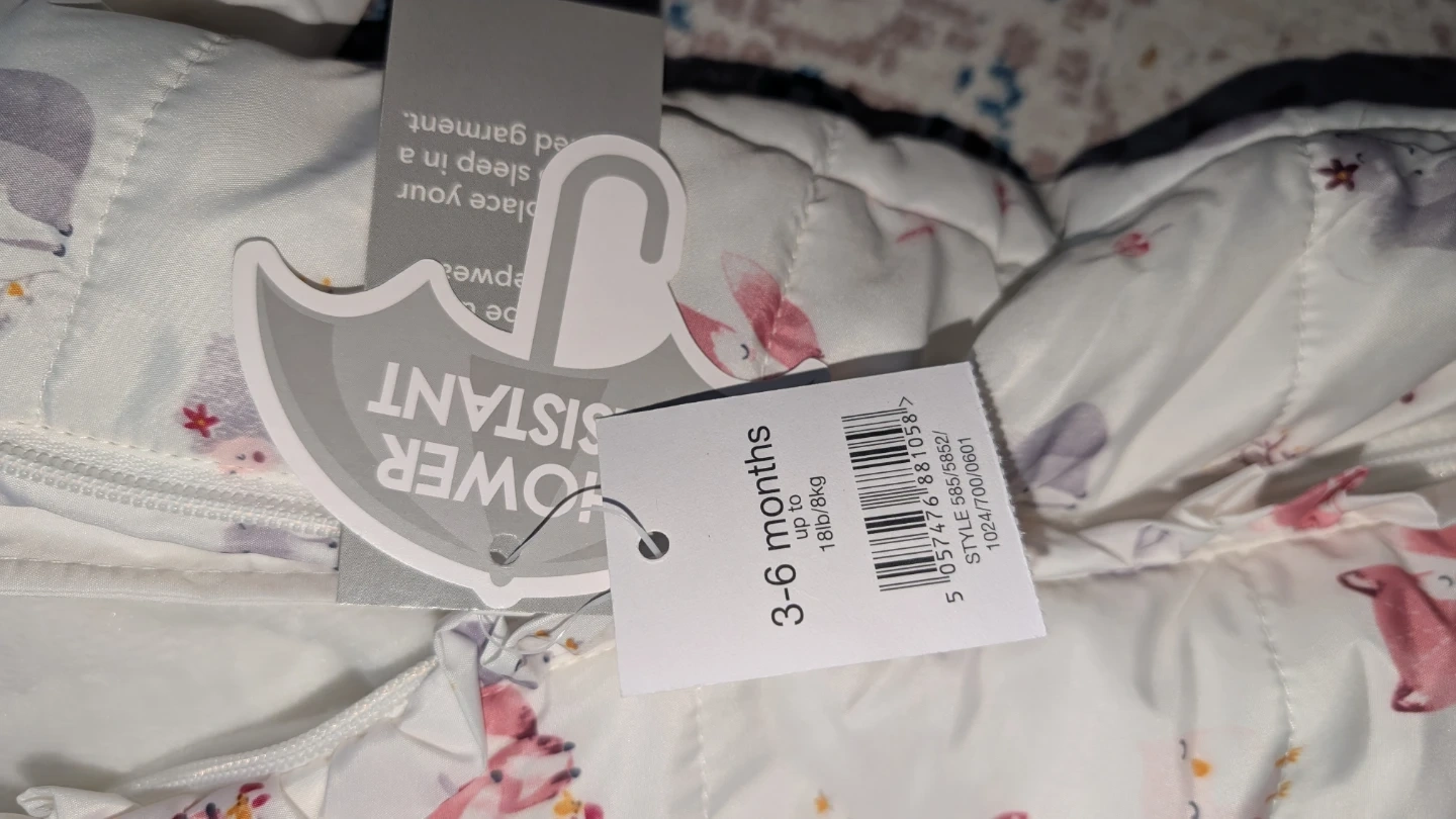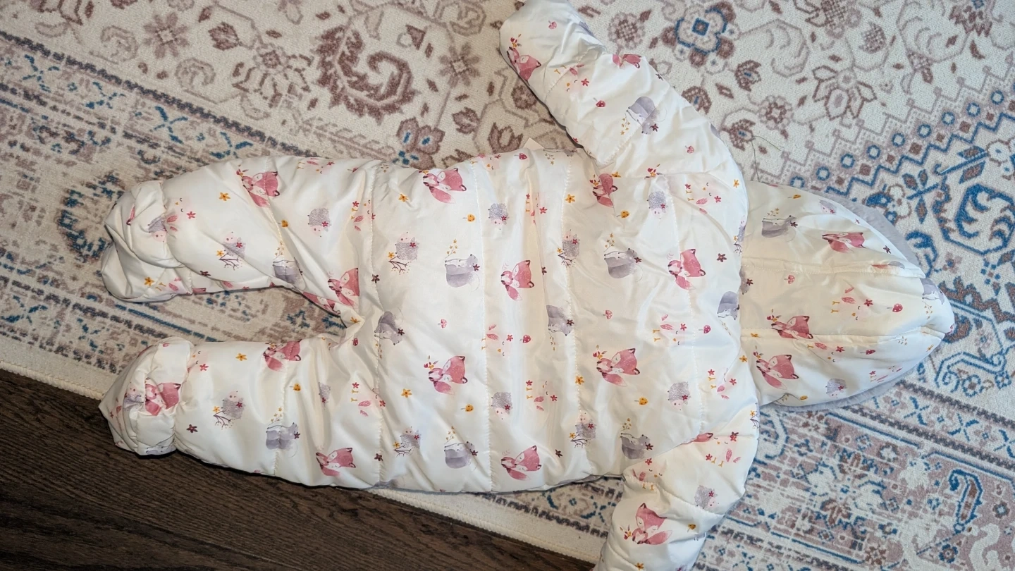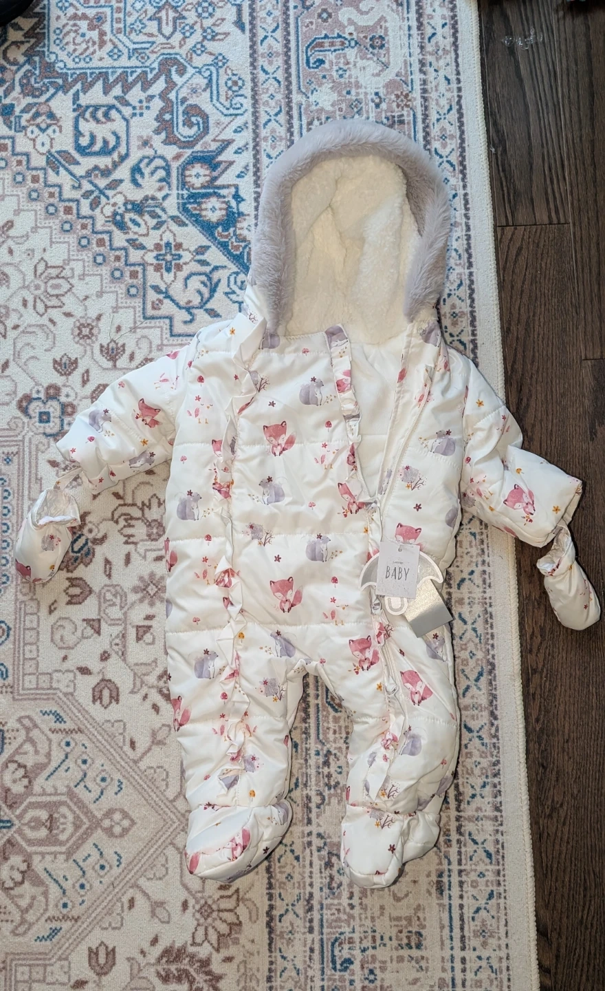 Selling a baby snowsuit, perfect for keeping your little one warm this winter! It's shower resistant and sized for 3-6 months, up to 18lb/8kg. The snowsuit features a cute pattern with foxes and other animals.