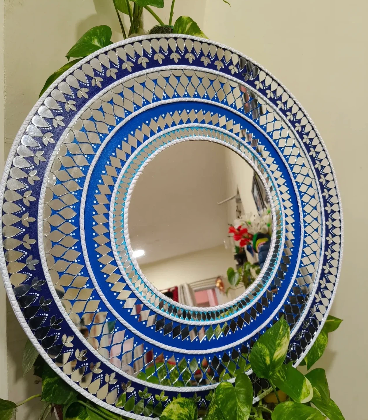 Add a touch of elegance to your home with this beautiful round decorative wall mirror! The intricate blue and silver design makes it a stunning focal point for any room. It's in great condition and ready to brighten up your space
