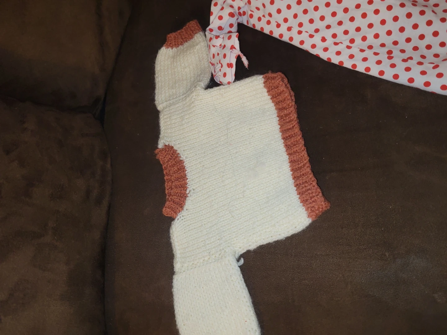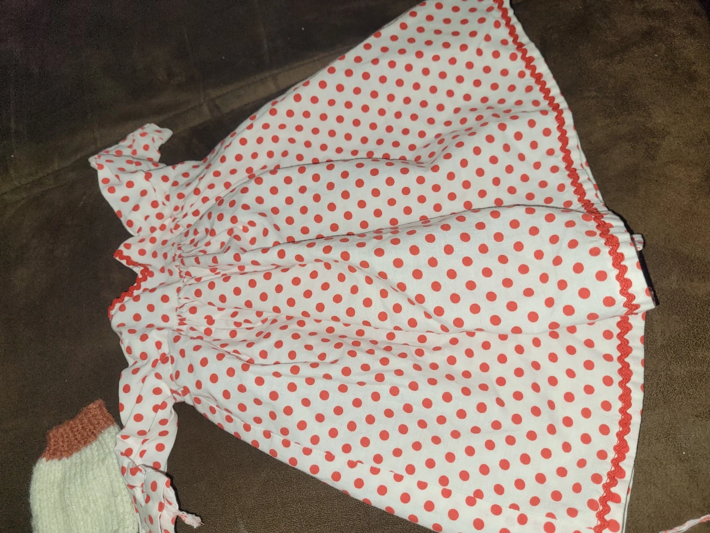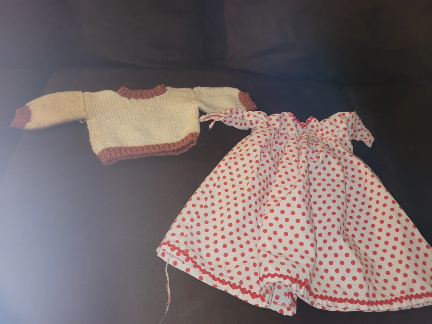 This used doll clothes set features a hand knitted sweater and a polka dot dress. The set is in fair condition, showing some signs of wear, which adds to its vintage charm. A perfect addition to any doll's wardrobe! Act fast, because if the ad is up, it's still available!