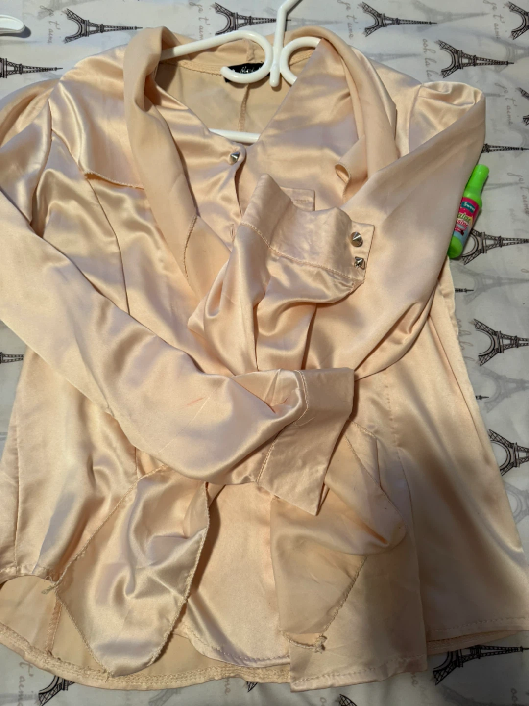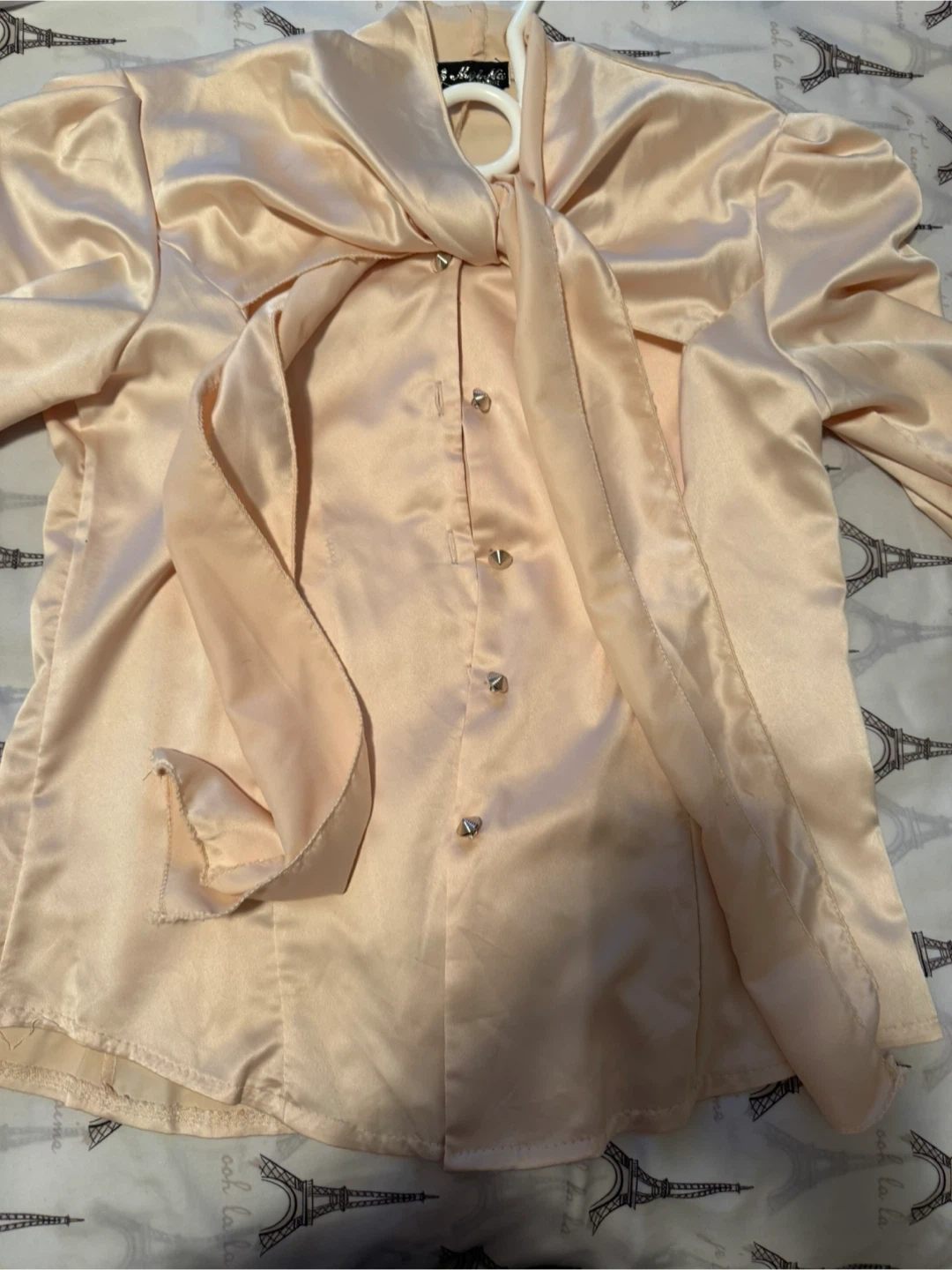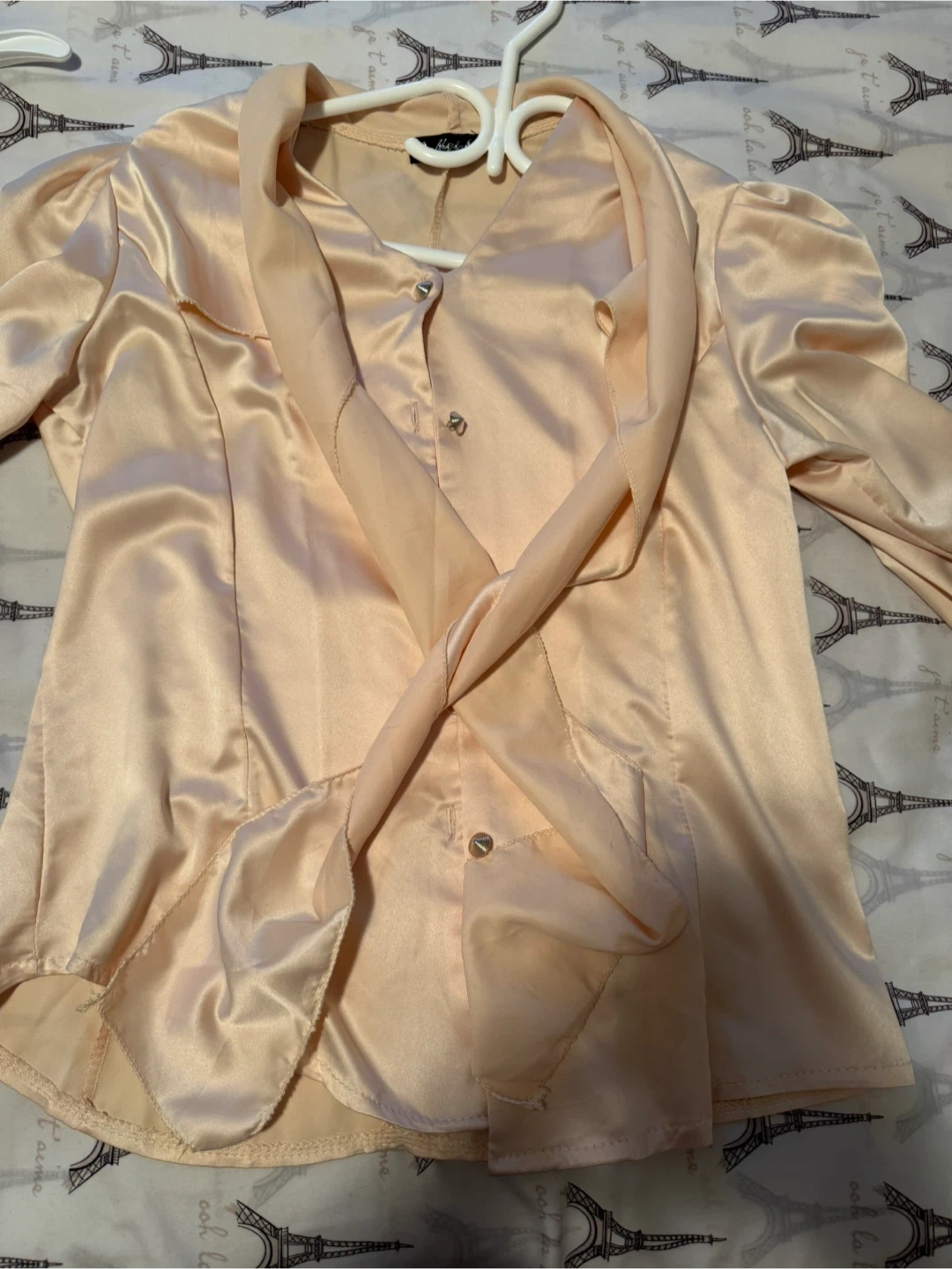 Selling a cute satin tie-neck blouse! It's a soft, light pink colour and features long sleeves with buttoned cuffs. Perfect for dressing up or down!