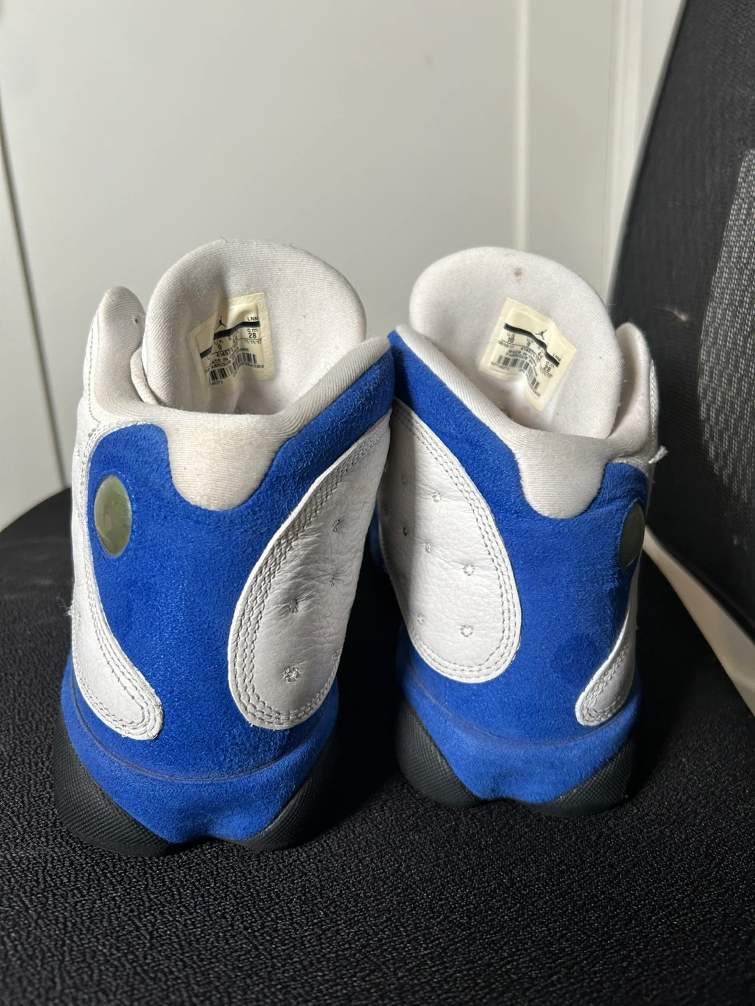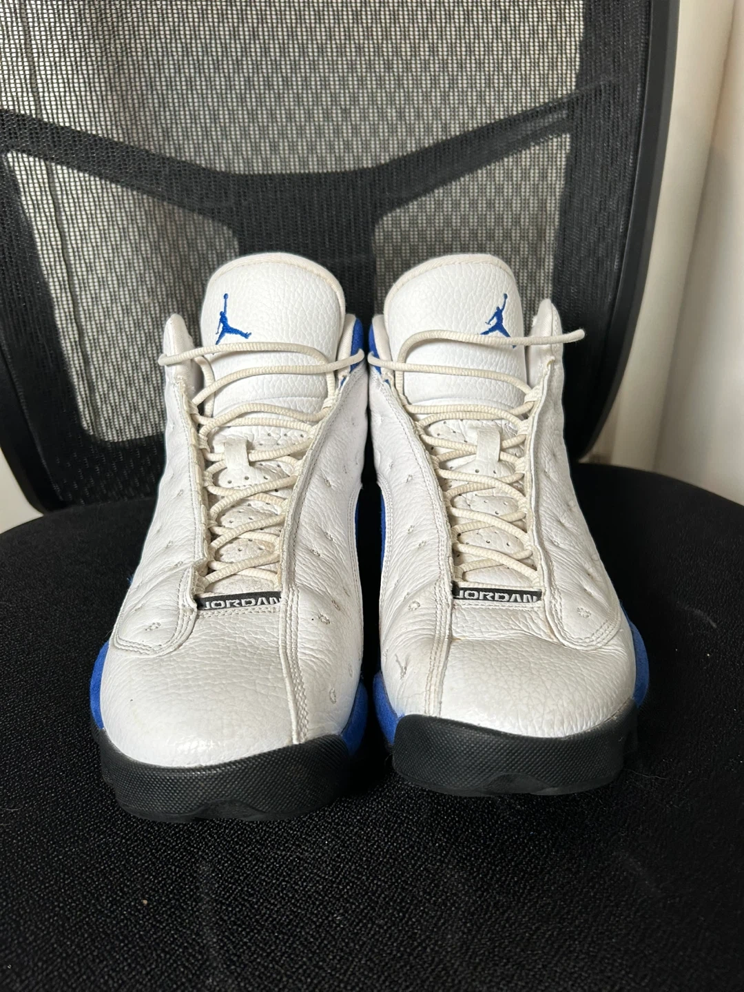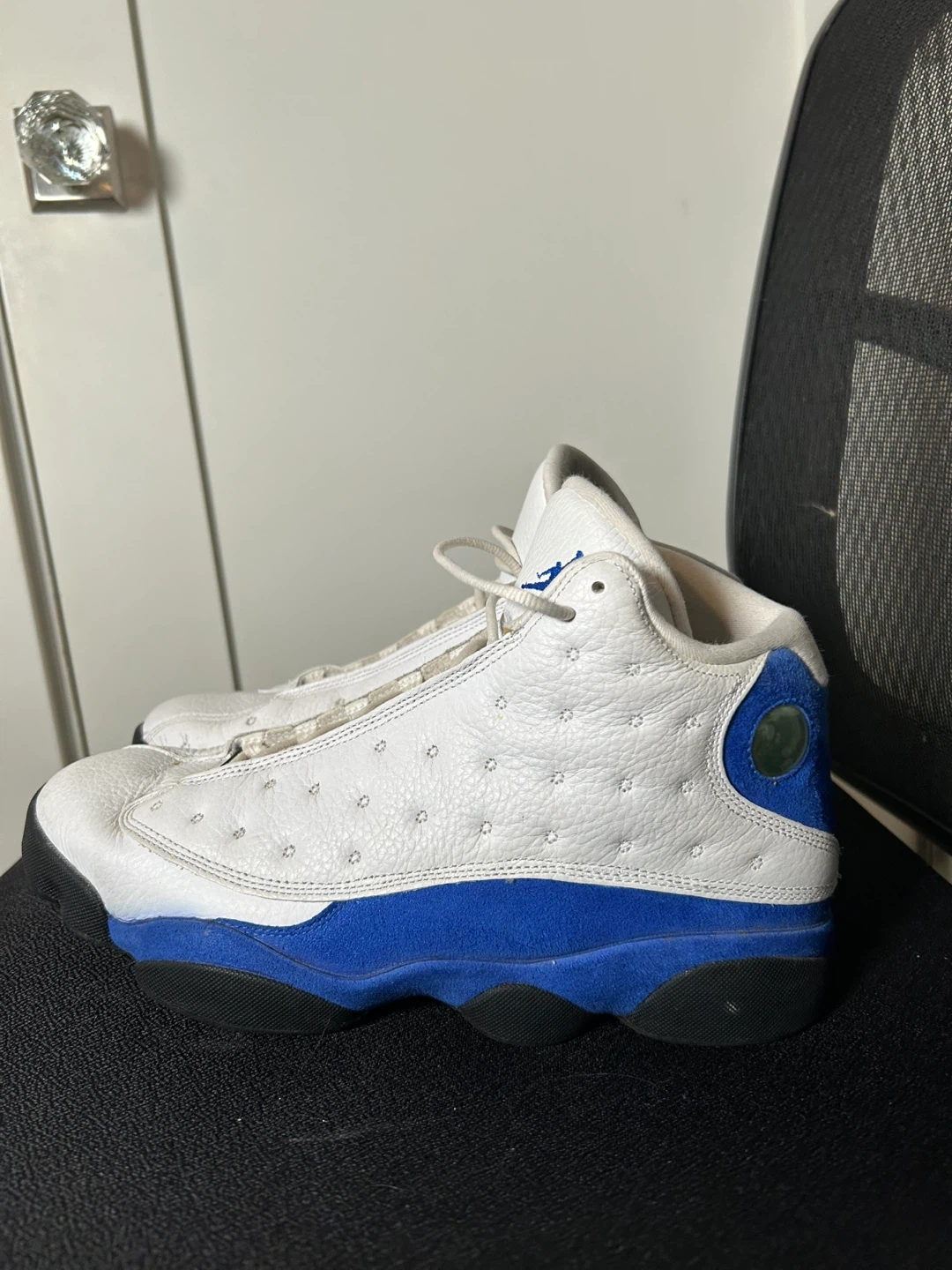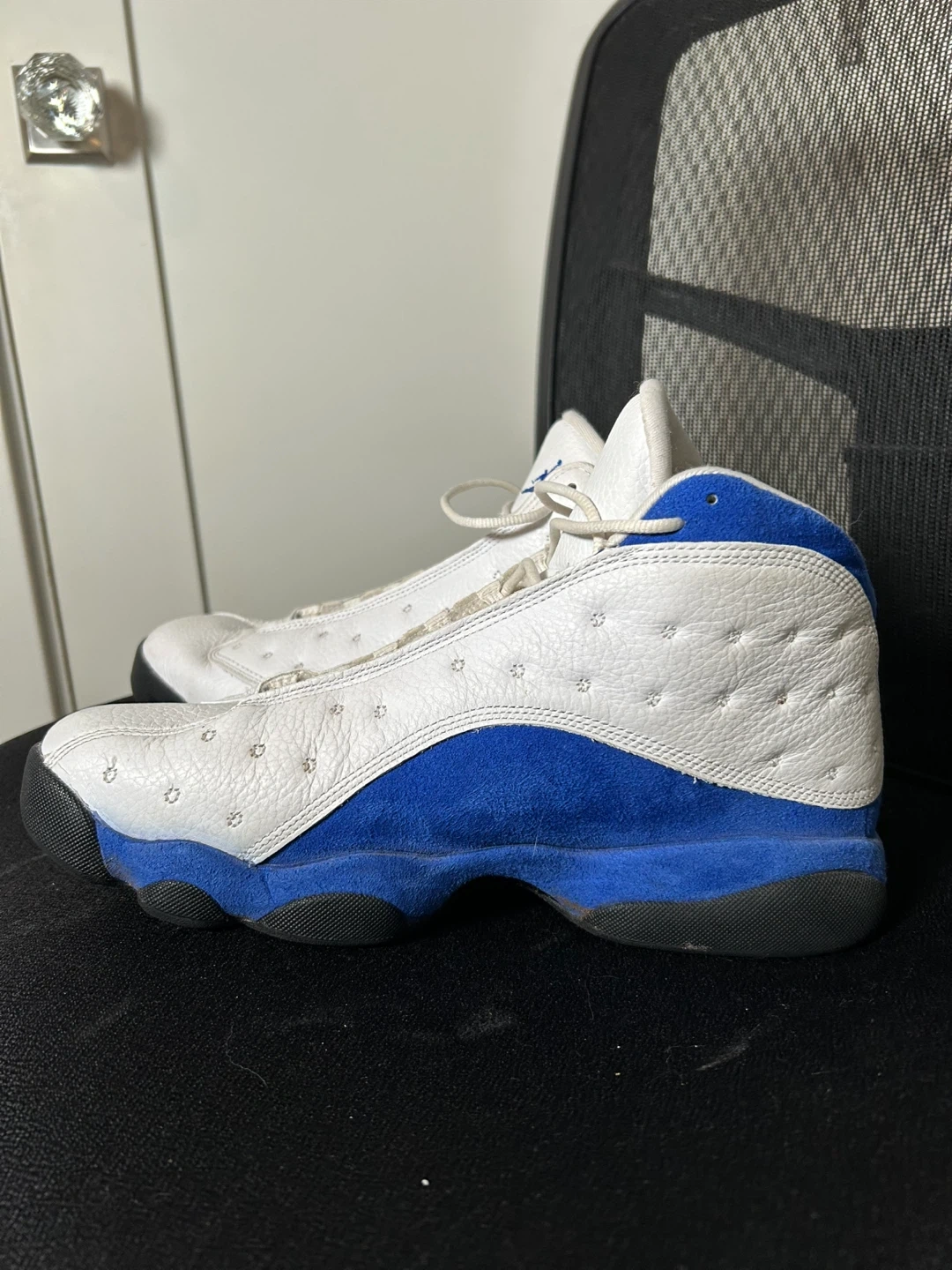 Selling a pair of Jordan 13 Retro sneakers in white and blue! These are in US size 10. They have some signs of wear but still look great!