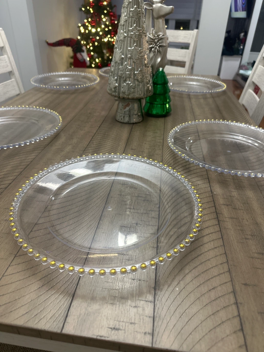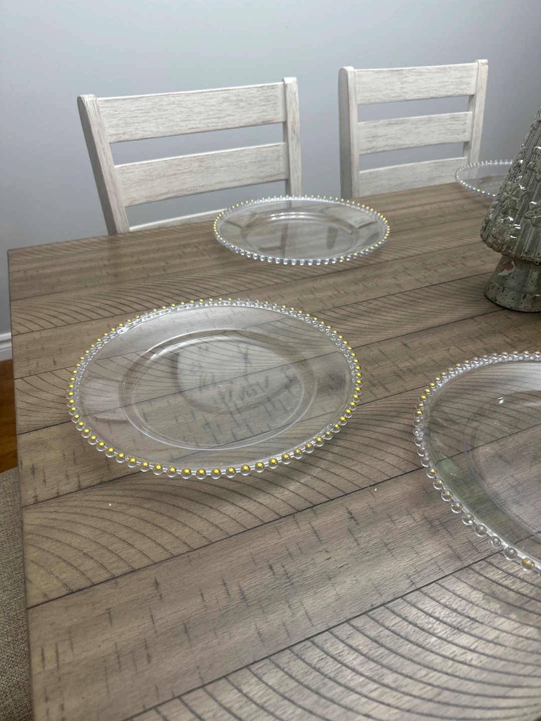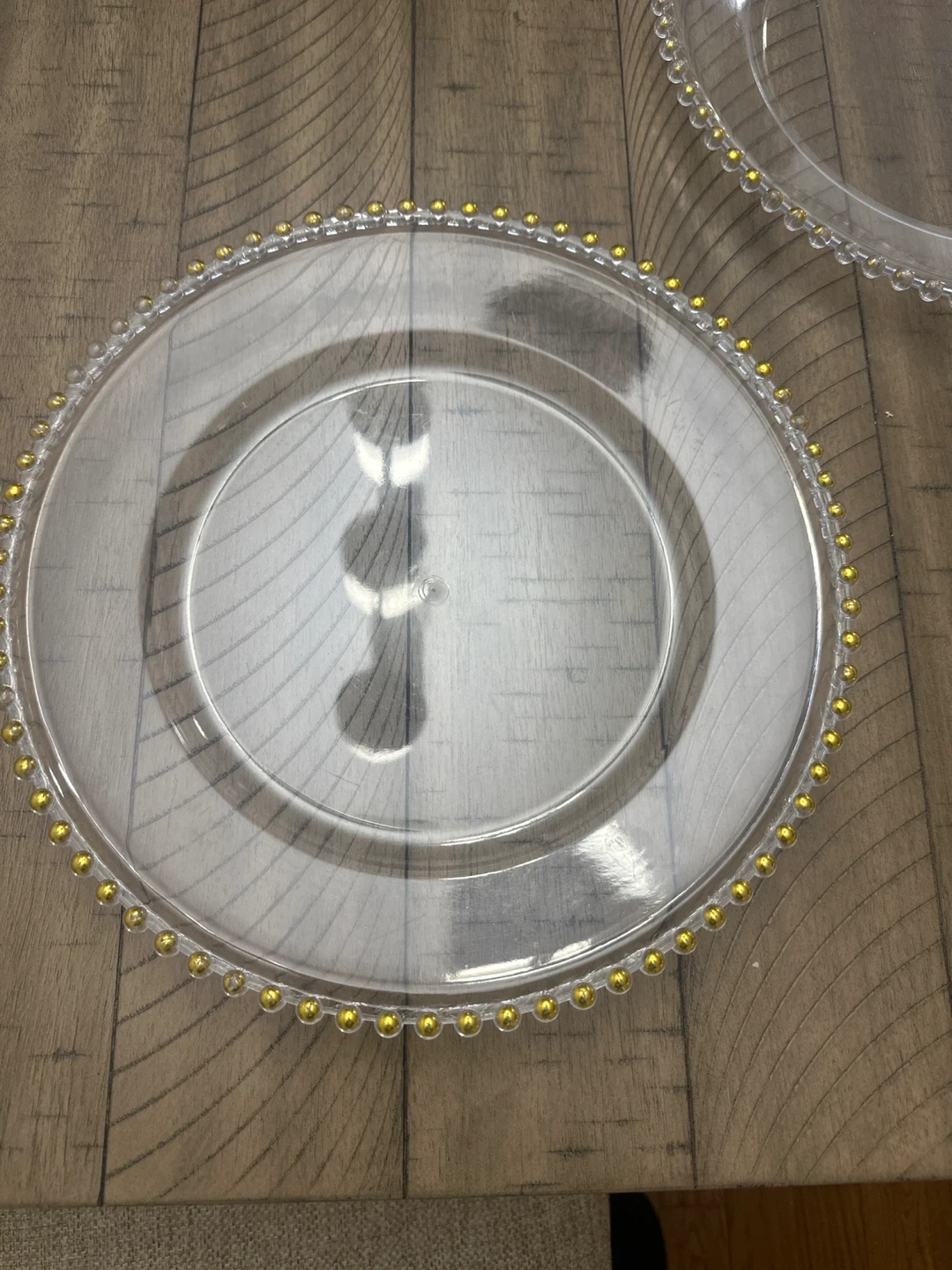 Selling gold beaded charger plates! These are clear with a lovely beaded rim, perfect for adding a touch of elegance to your table setting. They're in great condition and ready to use for your next dinner party or special occasion